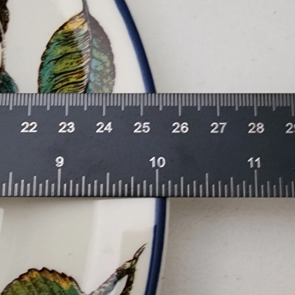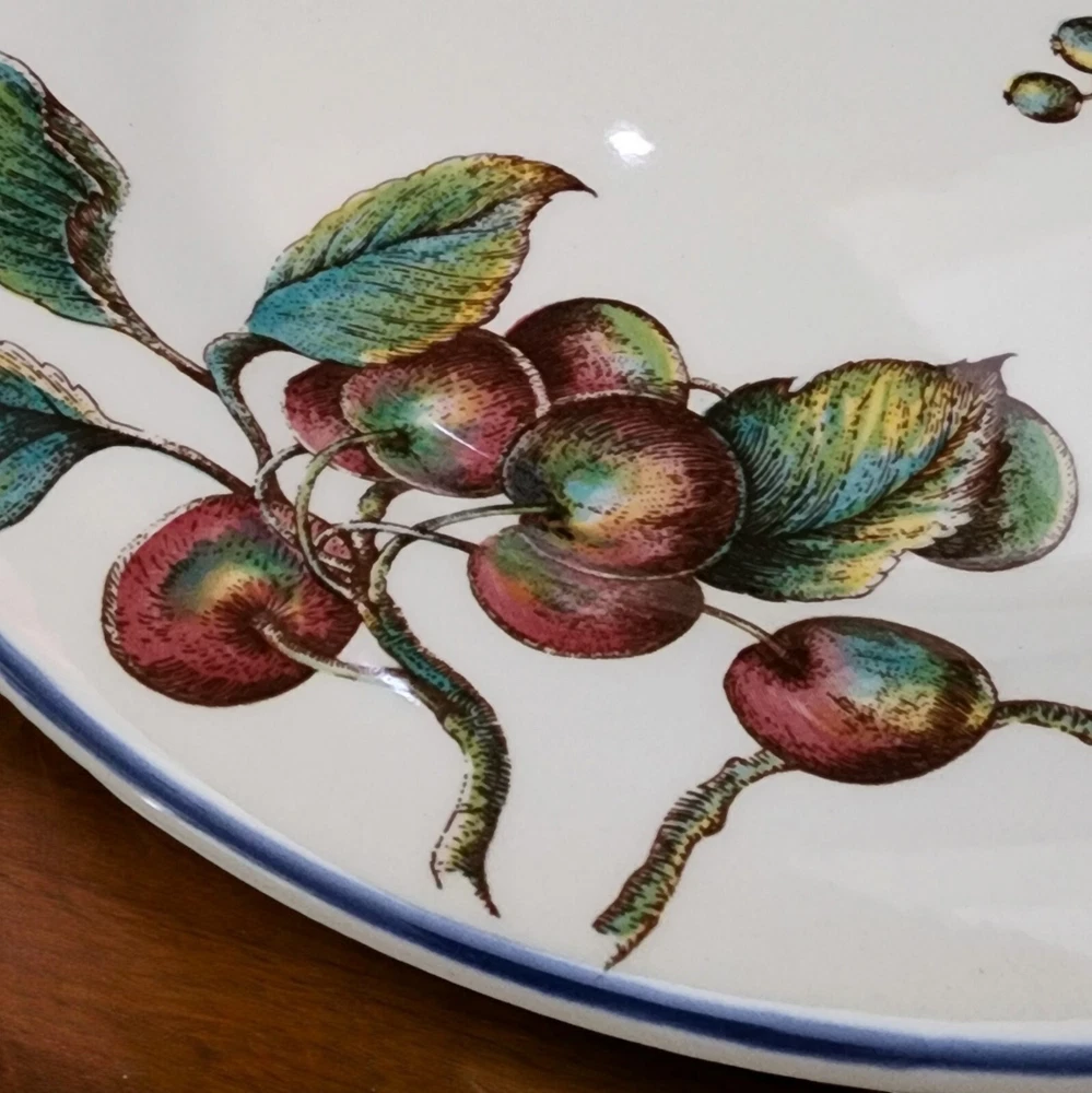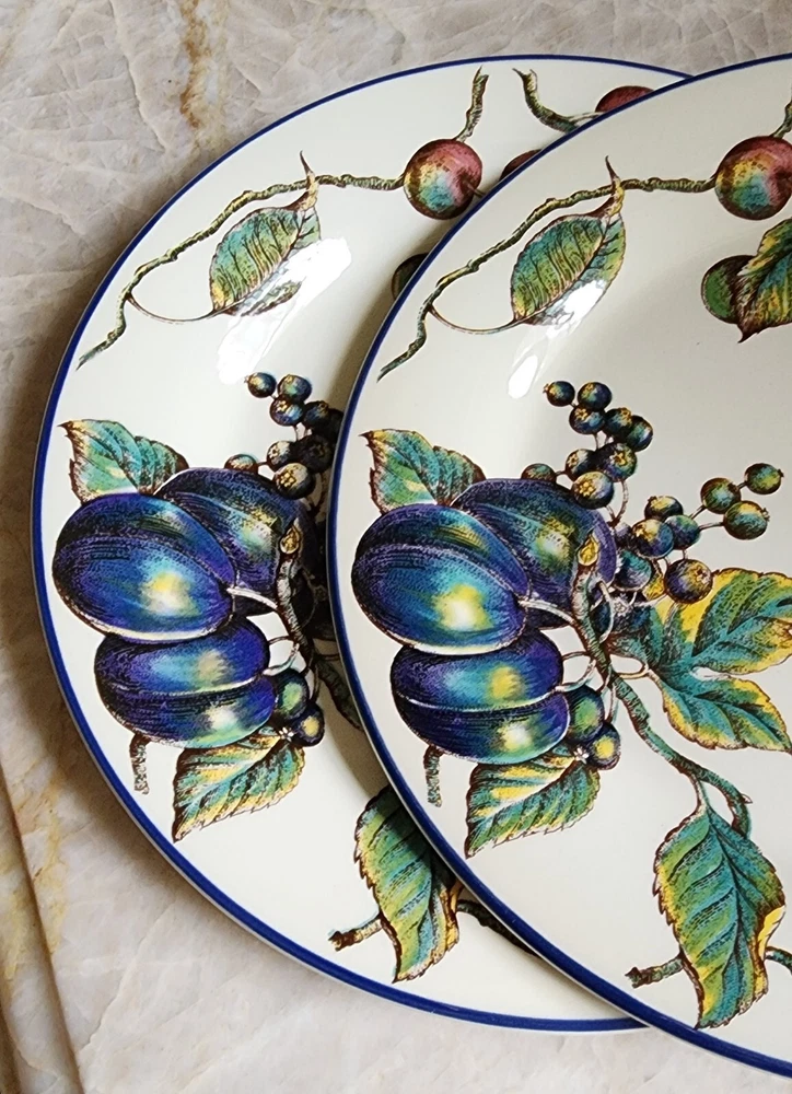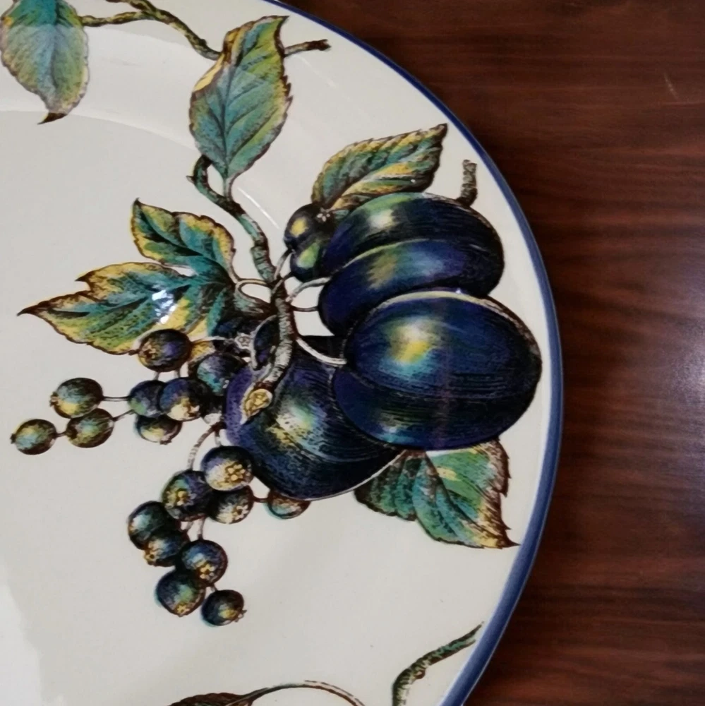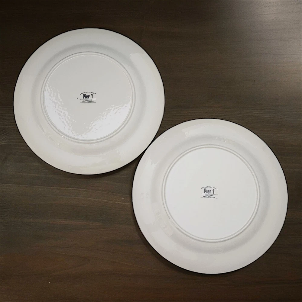This listing is for TWO plates with multiples available at a discounted price. More Pier 1 Macintosh pattern plateware available in our store. Add a touch of elegance to your dining table with this set of two Pier 1 dinner plates. Made in England, these 10" round ceramic plates are part of the Macintosh product line and feature a beautiful fruit pattern in rich multicolor detail. Perfect for all occasions, these blue trimmed bplates are ideal for serving your favorite meals and creating a stylish dining experience. By nature, pottery will have imperfections that add to the style. This artful pottery is in great condition for it's age. Please consult all of pictures for more detailed information. Each plate is printed with a backstamp and has a glossy finish. The set includes two dinner plates, each weighing 2.14#, and are 21st century original pieces. These plates are not only functional but also a work of art with their art pottery production style and pottery production technique. Upgrade your dinnerware collection with these stunning plates today.