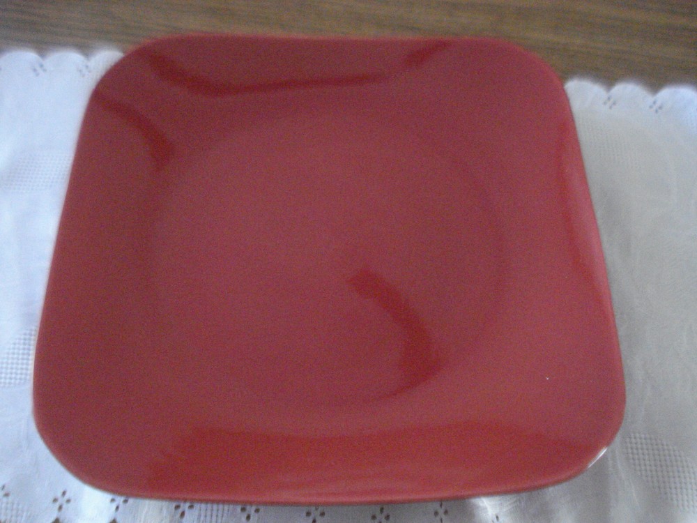 Two Mainstay square plates 10 5/8" X 10 5/8" ,stoneware. dishwasher safe. wine color. Made in China....