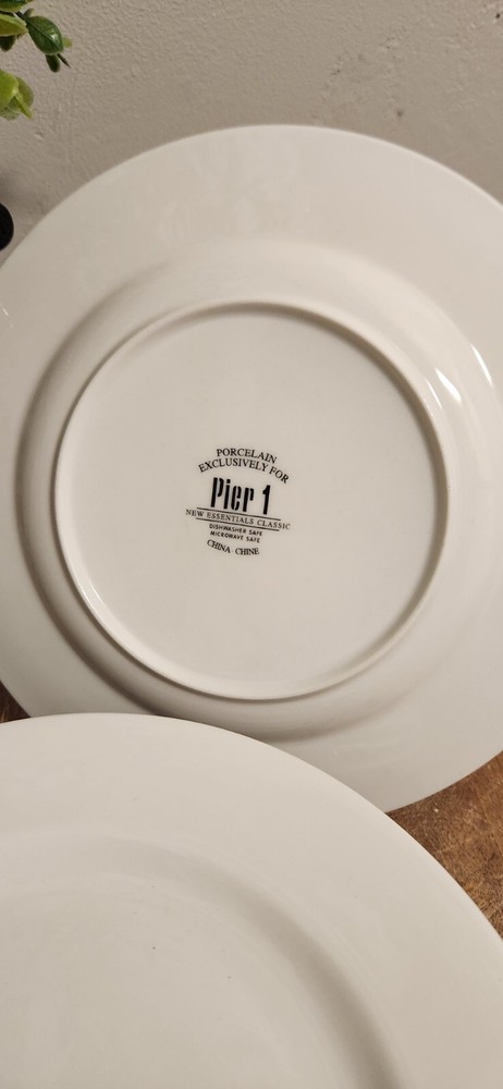 Set of 2 Pier 1 Imports New Essentials Classic Salad Plates 8½" White EUC Excellent pre-owned condition. I will not separate & I'm not taking offers. At the time of listing, I have multiple sets of 2. I also have additional pieces listed in this pattern. Combined shipping is done in the form of a refund once the orders are packed. Max weight per box is approx 25lbs.
