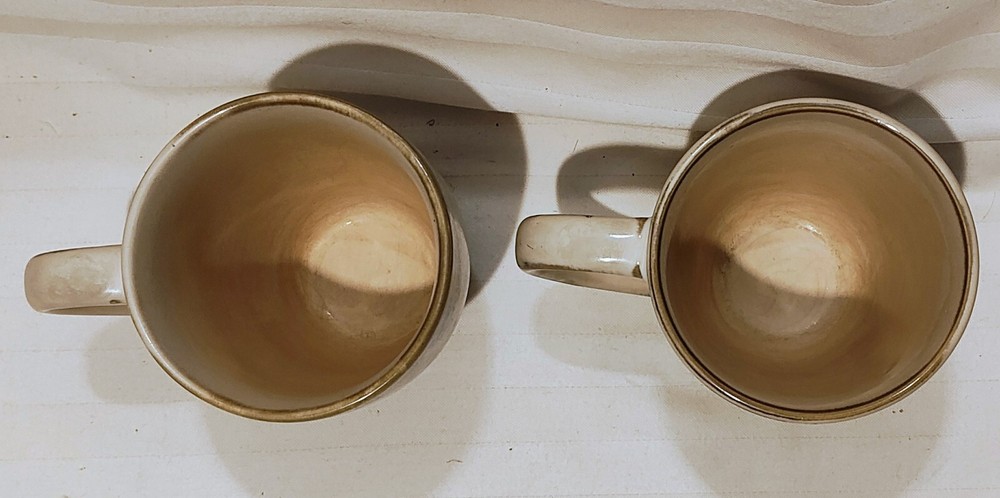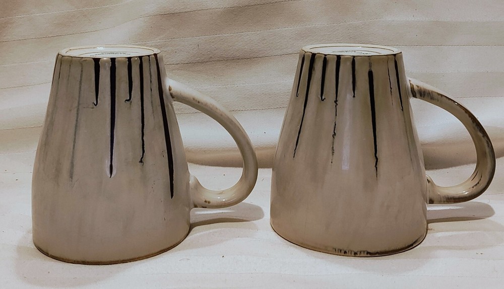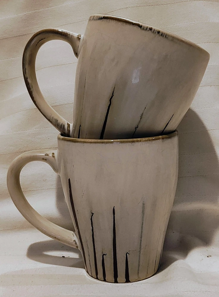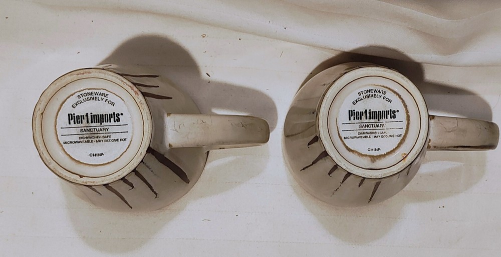 Set of 2 Pier 1 Imports Sanctuary Stoneware 4 3/8 inch high Coffee Cups Mugs in shades of Beige and Brown. Discontinued pattern