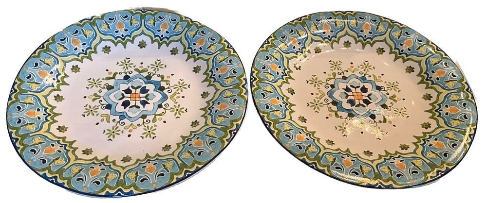 Add a touch of elegance to your dining experience with this beautiful set of two Pier 1 imports plates. These plates feature a stunning floral pattern with blue and green scrolls that will complement any occasion. The round plates are made of high-quality materials and have a diameter of 9.25”inches, making them perfect for serving your favorite meals. The plates are machine washable up to 140°F, ensuring easy and convenient cleaning. The backstamp is printed, and the product line is Pier One. These plates are perfect for all occasions, whether you're hosting a formal party or having a casual meal with your family. So, add a touch of sophistication to your dining experience with this exquisite set of plates. New without box