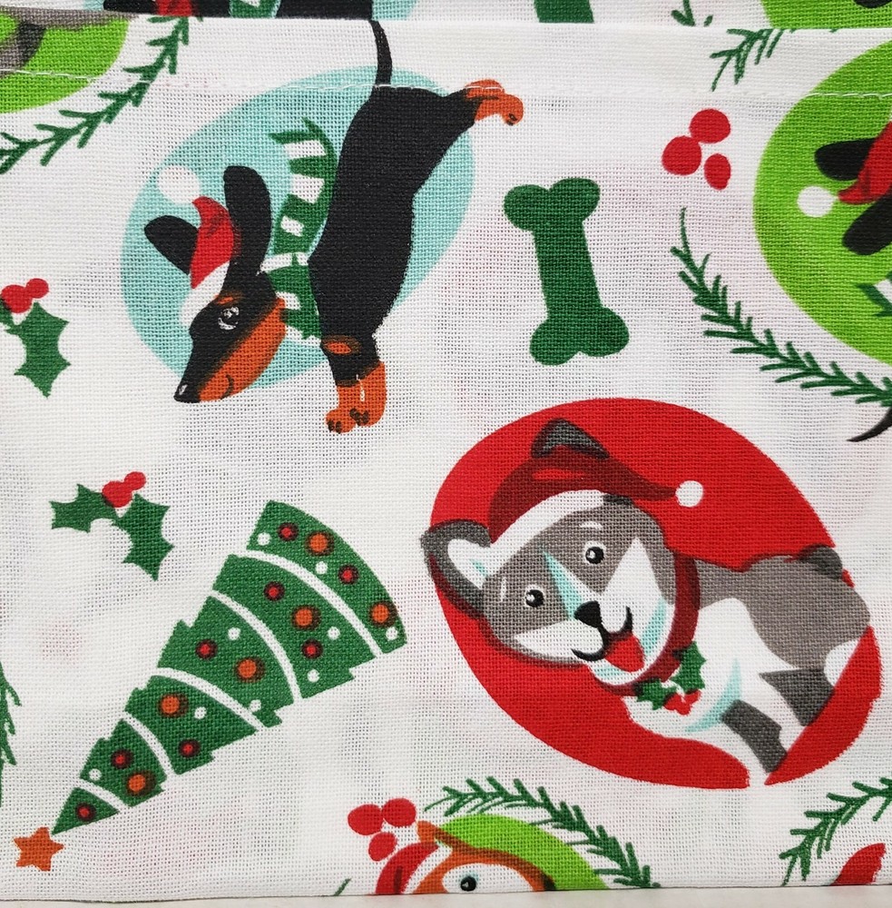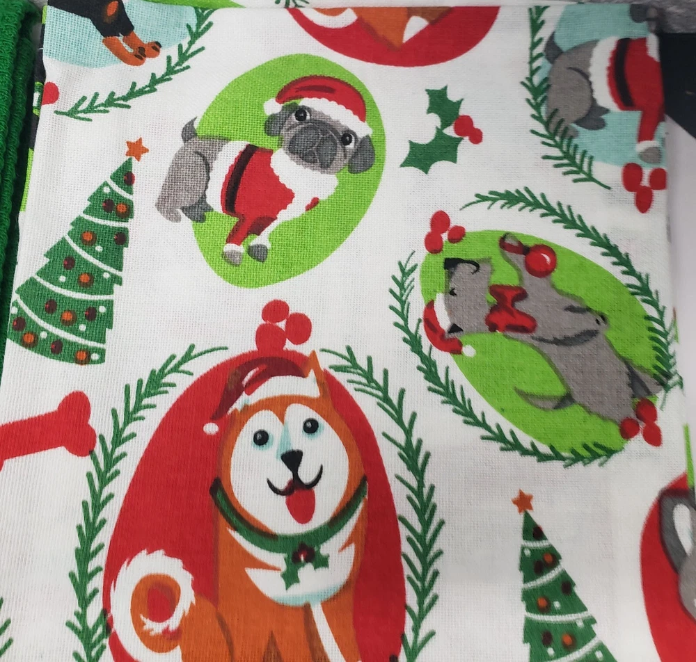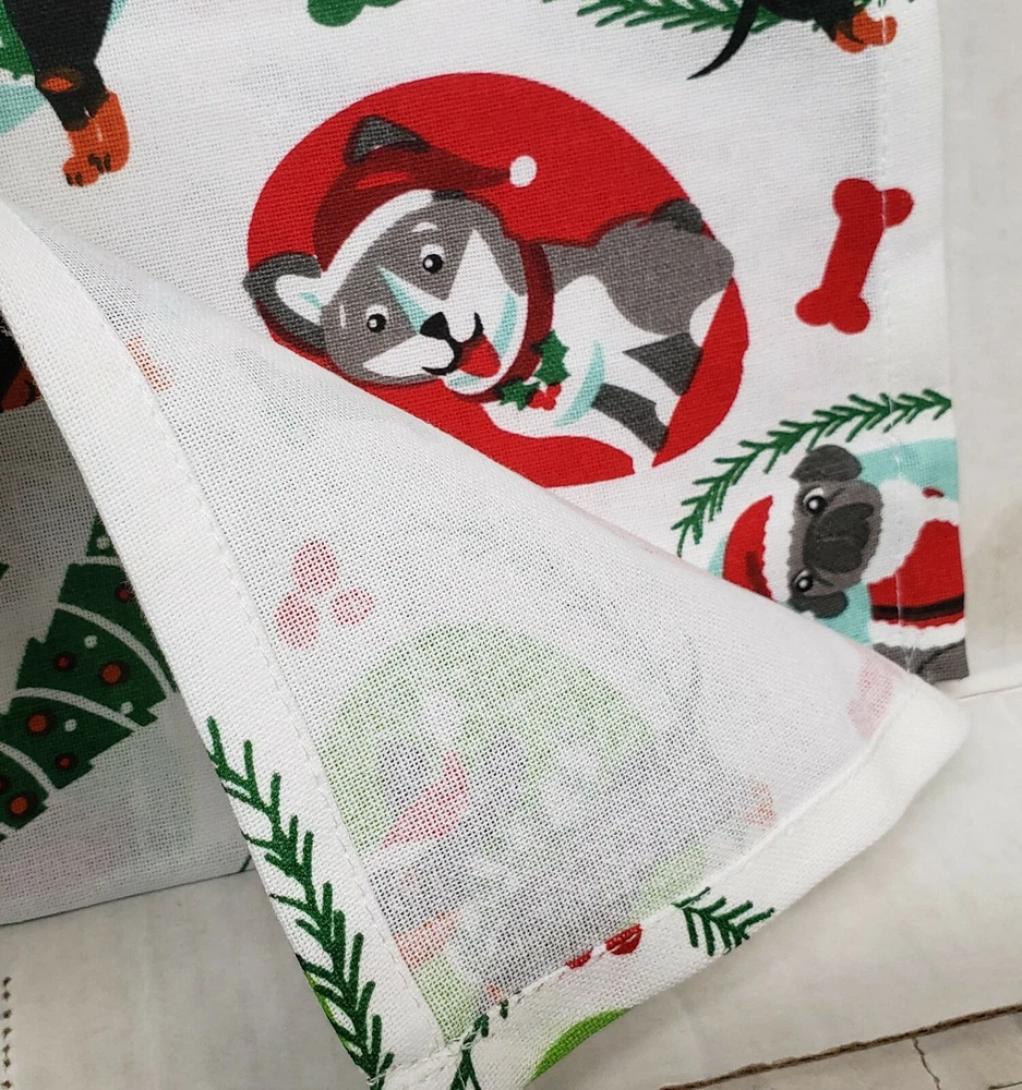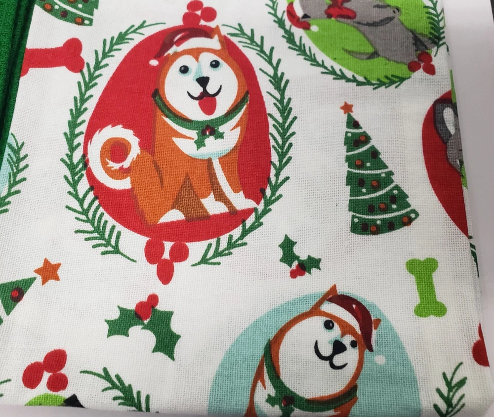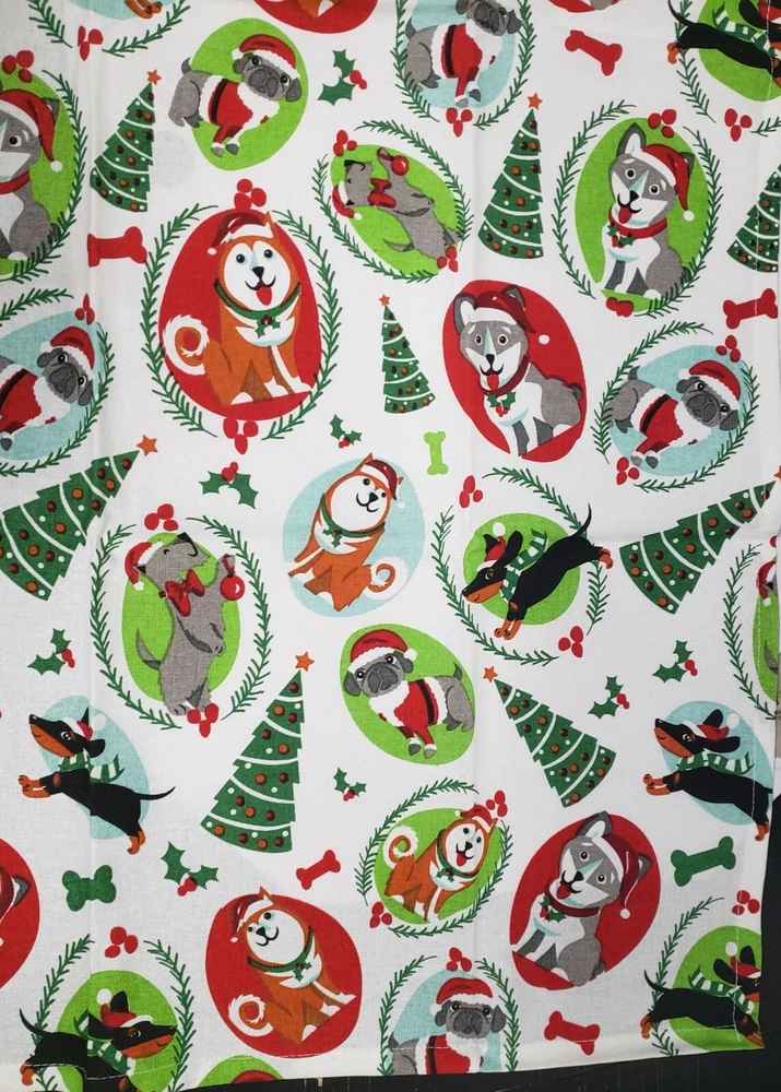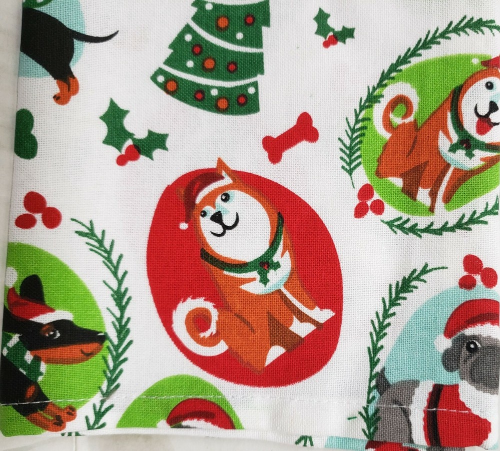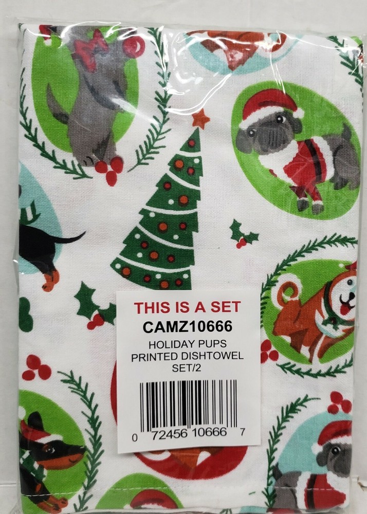 I'm selling a Set of 2 Same Printed Cotton Tea Towels (18"x28") CHRISTMAS DOGS/PUPPIES as shown on the pictures. Made in India by Design Imports. 100% Cotton. Machine Wash. It's brand new, with tags. The towels are not thick and not soft as those are not terry towels, but tea towels. Please check out my other listings, including other Christmas themed items, and if you buy multiple items, please contact me and I will find out how I can combine your shipping. I ship to USA only (or internationally using Global Shipping)