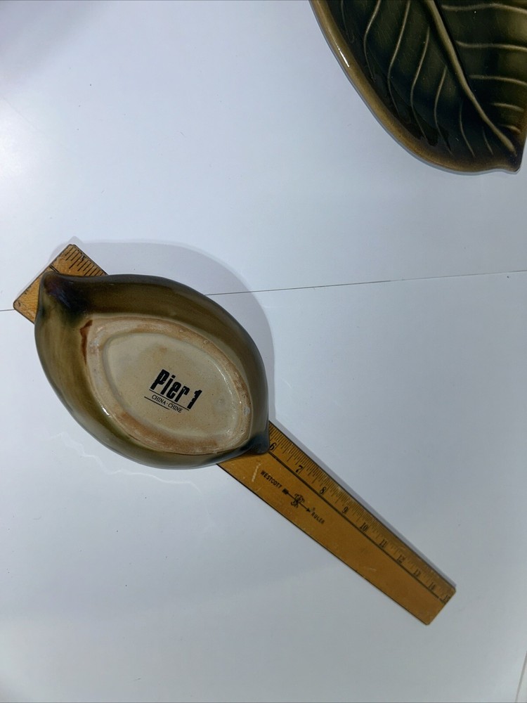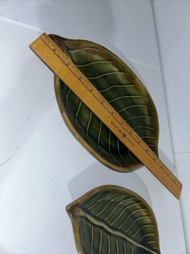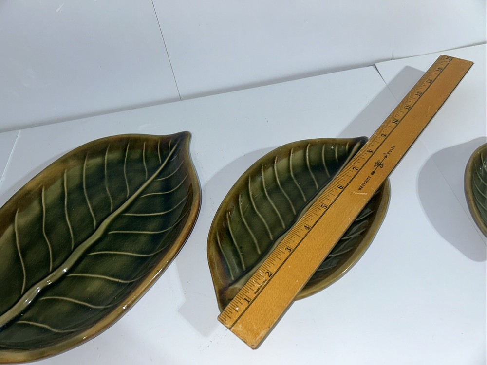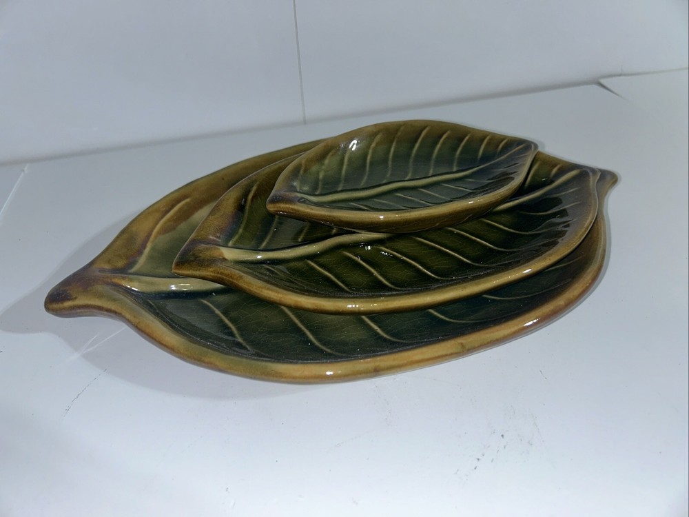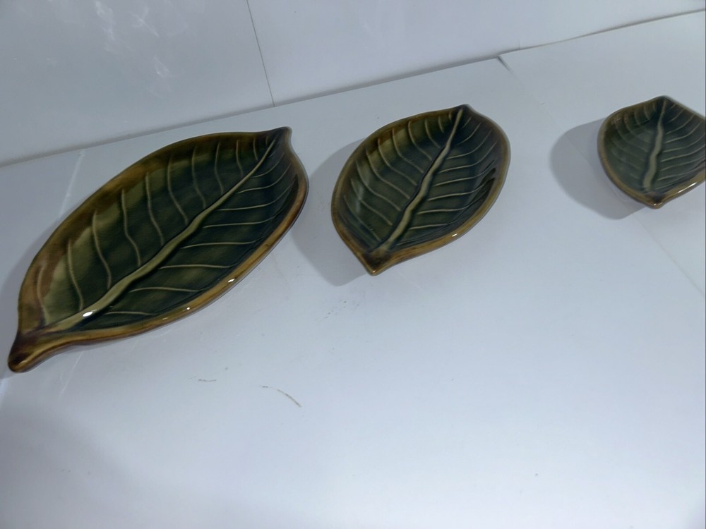 Description: Beautiful set of three ceramic leaves designed as decorative pieces. Each piece represents a different size, perfect for creating a tiered display. Dimensions: Large Leaf: 11.5 inches long Medium Leaf: 8.5 inches long Small Leaf: 5.5 inches long Color: Varied shades of green with a glossy finish. Detailing: Realistic vein textures for an authentic leaf appearance. Condition: Excellent condition with no visible chips or cracks. These ceramic leaves can serve as standalone decor or be used functionally as trinket dishes or serving pieces for small items.
