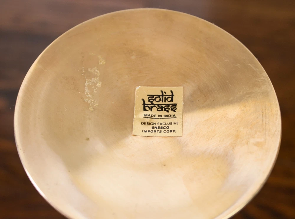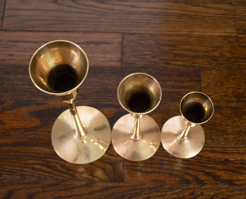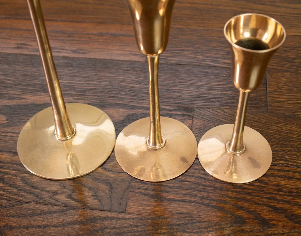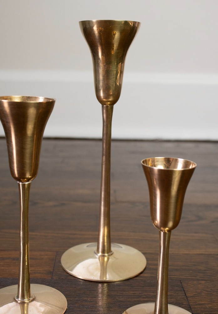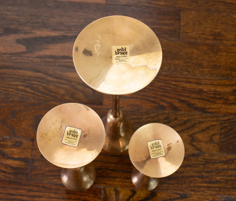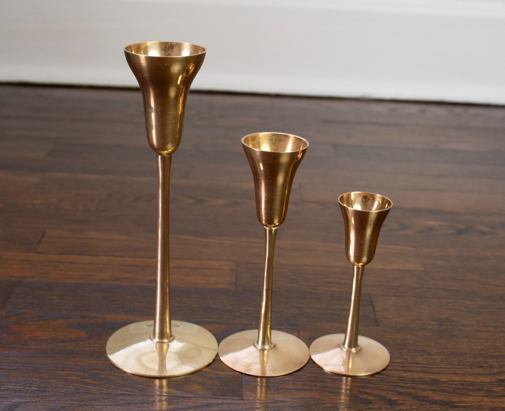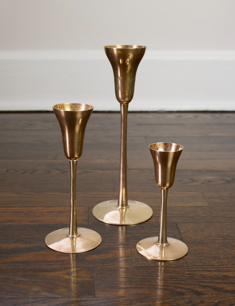 Set of three solid brass candlestick holders. The tops of these holders have a unique shape like a martini glass. All three holders have the original sticker on the bottom stating they were made in India. All three candlestick holders are in great condition and have been cleaned and polished. The large candle holder measures approximately 9.25" tall and 3.5" in diameter at the base. The medium candle holder measures approximately 6.5" tall and 2.75" in diameter at the base. The small candle holder measures approximately 5" tall and 2.5" in diameter at the base.