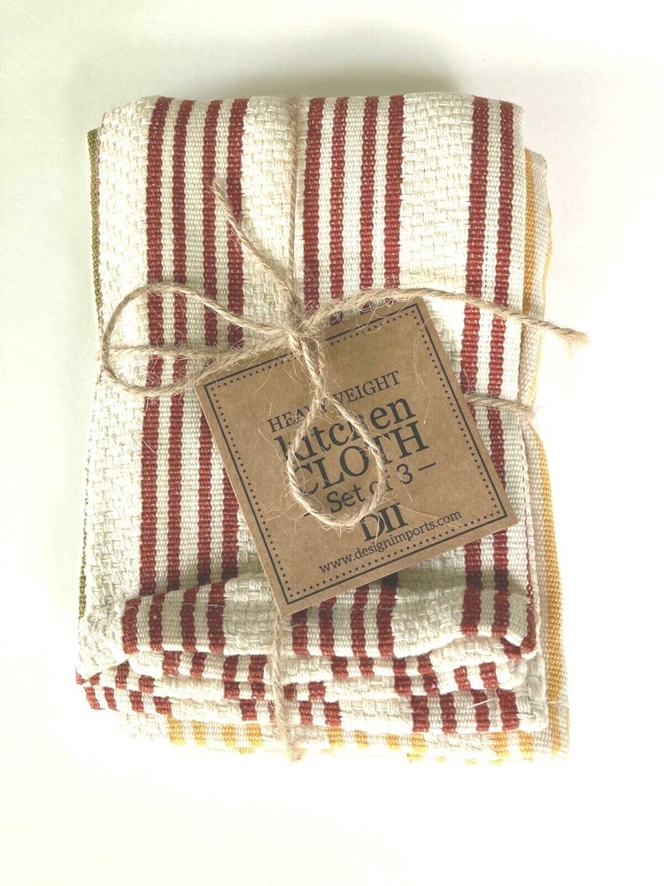 3 pack of heavy duty dish cloths for your kitchen, ideal everyday kitchen dish cloths. Use them for cleanups during food prep, mopping spills, drying, or wiping the edges of plates for serving. These woven dish cloths are made of 100% cotton, machine washable, and dryer safe. Colors, 1 of each; Brick Red stripe, Yellow stripe, and Olive Green stripe. Size: 13.25 x 13.25 inches.