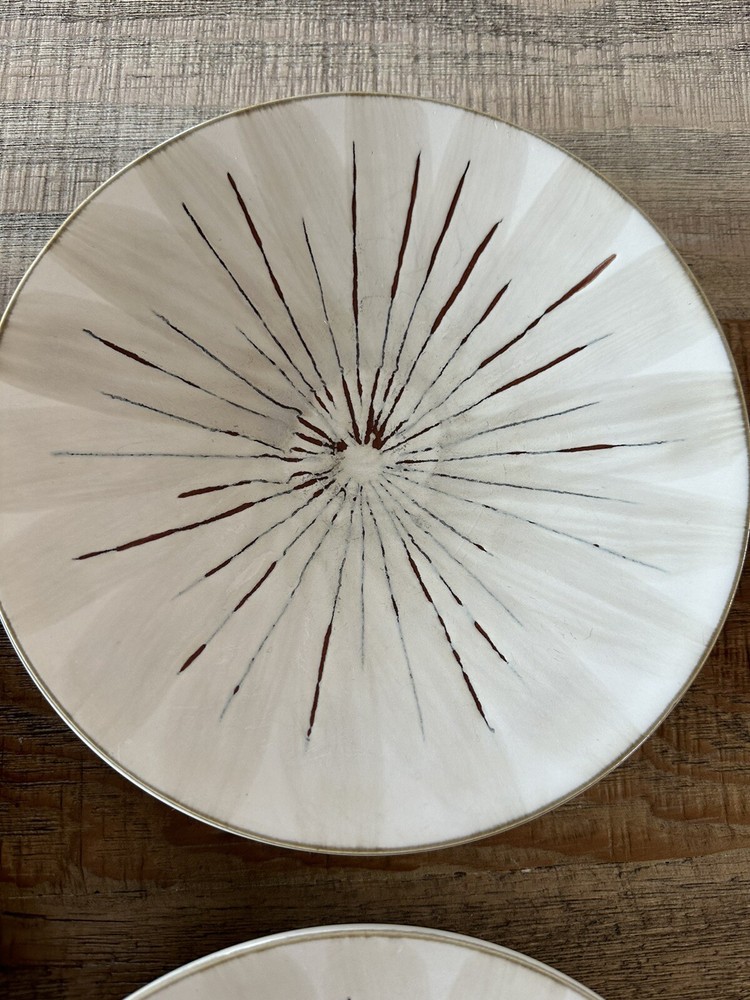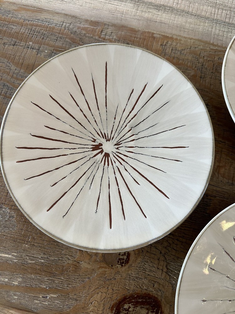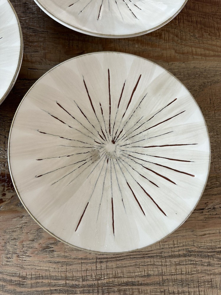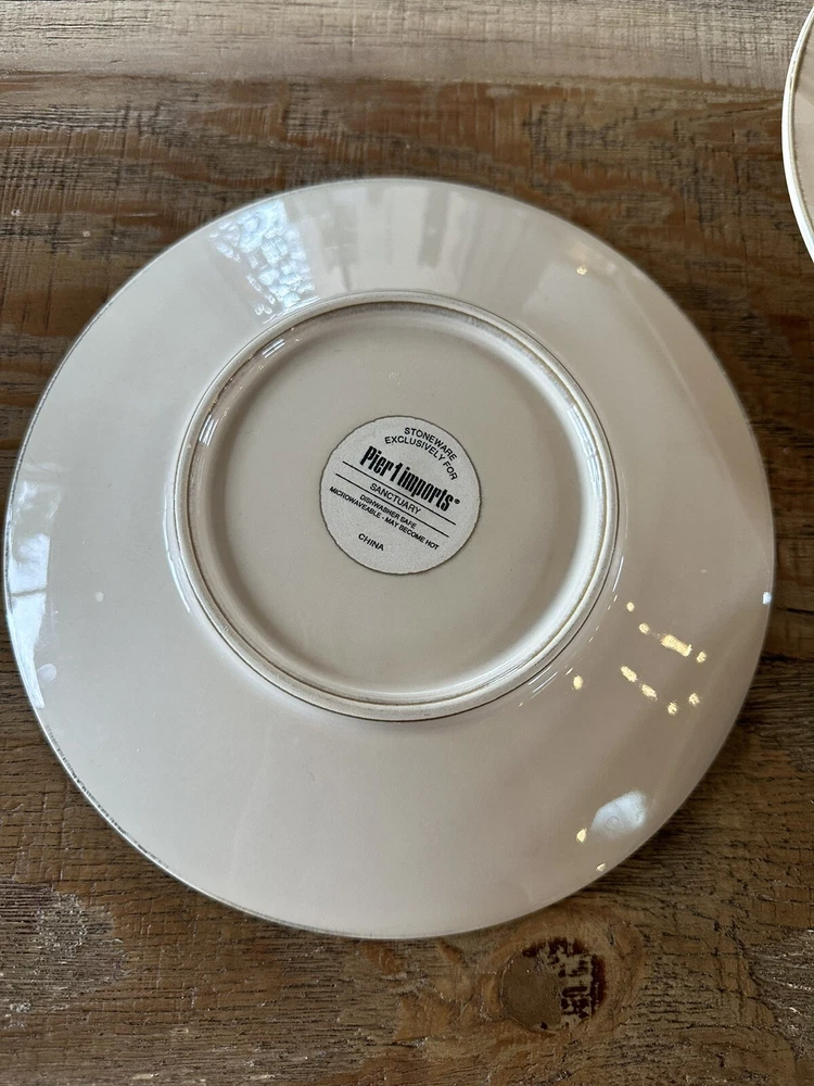 Beautiful used condition near mint! This line has been discontinued and may become very hard to find! This listing is for three solid plates that are 8 1/2 inches across. Add a touch of contemporary style to your dining table with this set of three Pier 1 Imports Sanctuary Stoneware Salad Plates. The plates feature a beautiful sunburst pattern in beige color, making them perfect for all occasions. Each plate has a diameter of 8.5 inches and is made of high-quality stoneware material, ensuring durability and longevity. The round-shaped plates are perfect for serving salad, and they come with a printed backstamp that guarantees their originality. The plates are not antique and are a contemporary original. They were manufactured in China in the 21st century using the pottery production technique. The set includes salad plates that are perfect for adults and come in a contemporary style.