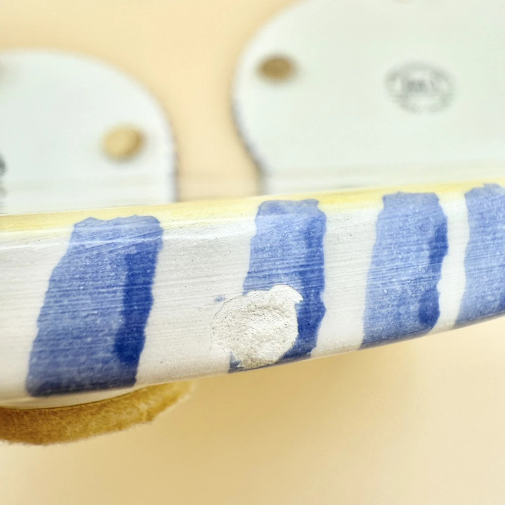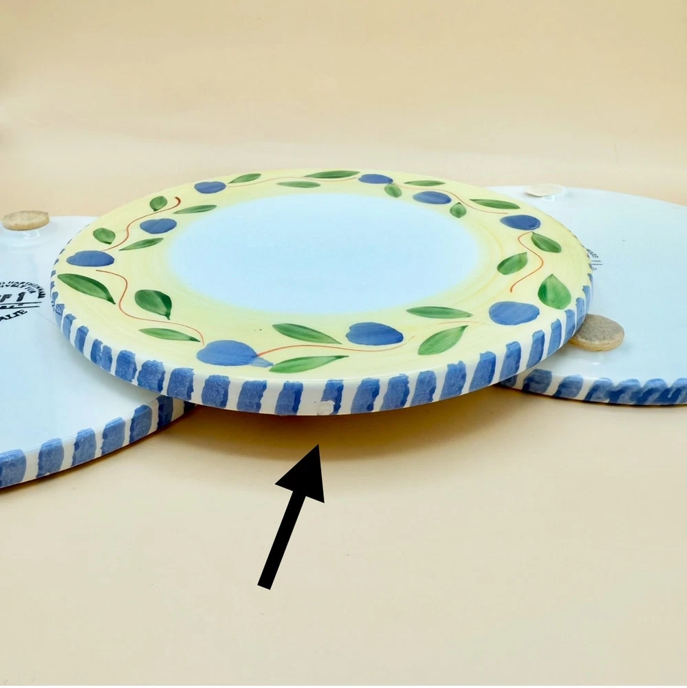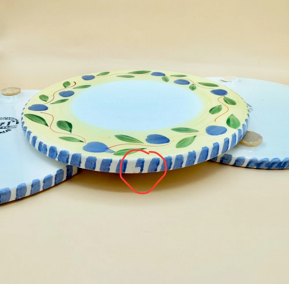 Absolutely love these handpainted Italian trivets! The blue olive and green leaf design is so charming, and the yellow rim adds a pop of color. Even though one has a minor chip and missing a felt pad, they’re still stunning and functional. Perfect for adding a touch of vintage elegance to my kitchen—great condition for their age! Highly recommend!
