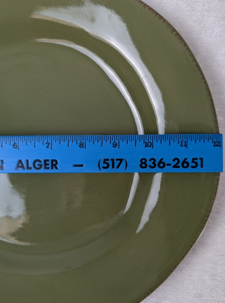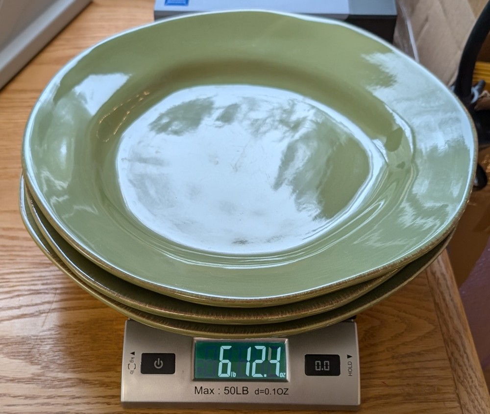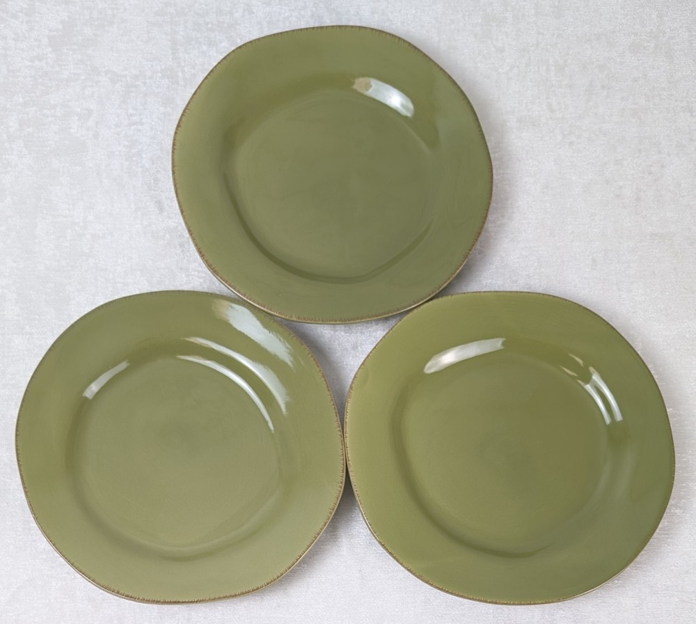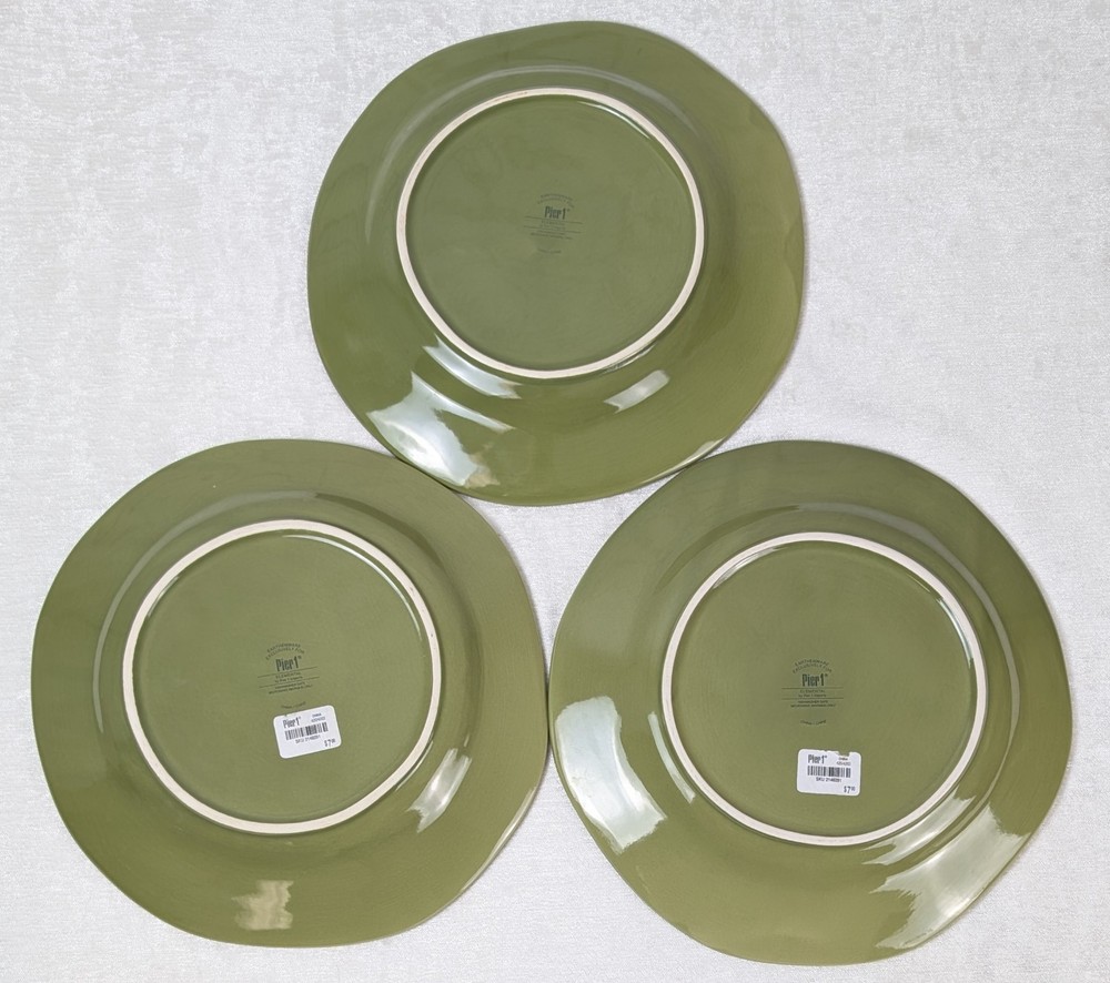 This listing is for a set of three Pier 1 Imports Elemental Moss Green dinner plates. These stoneware plates have an abstract shape, glossy finish, and a contemporary style. Each plate has a diameter of 12 inches and is stackable and dishwasher safe. Manufactured only in 2007 in China, these plates feature a printed backstamp and an oblong, roundish shape. Each plate weighs 2 lbs 4 oz and is suitable for modern table settings. Two of the three plates have the original price stickers on them.