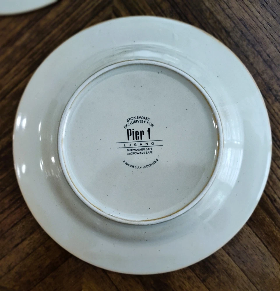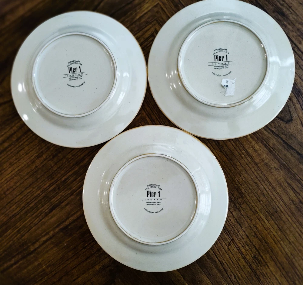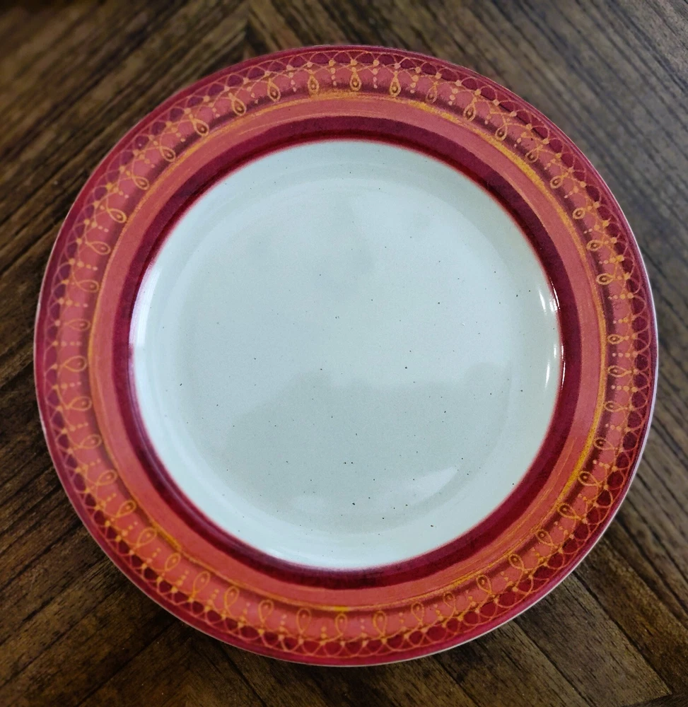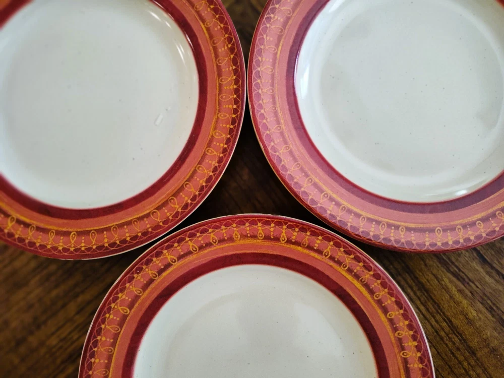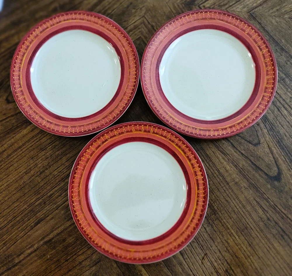 Set of 3 Pier 1 "Folly" Hand Painted Ceramic Earthenware 8 1/4" Sald/Dessert Plates- Discontinued Pattern Description: Red/Orange Band, Geometric, Smooth, No Trim Estate Sale Find- Beautiful Plates All are in Excellent Like New Condition-Looks Like Rarely or Ever Used -No Cracks or Chips or Crazing - 1 still has partial sticker on it -See Pics Dishwasher and Microwave safe for easy cleaning Replacement Site sells them for $8.99 Each Please look at my other items- always listing new Items - thanks Please check out my 100% feedback rating I will Ship within 1 Business Day After Payment Received with Delivery Tracking and will be securely packaged for protection during Shipping. I will provide you with Excellent customer service and promptly leave you Positive Feedback when Payment Received