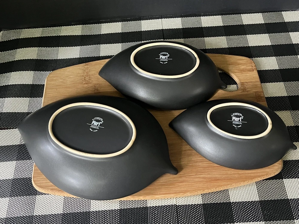 Add a touch of elegance to your dining experience with this set of three Pier 1 nesting serving dishes. These oval-shaped stoneware plates feature a beautiful leaf pattern in rare and vibrant colors, making them perfect for all occasions. The plates are handmade and stackable, with a diameter of 7 inches, and are decorative enough to be displayed as a set. Crafted in China in 2006, these contemporary original plates are fused glass and have a glossy finish. They are dishwasher safe, making them practical for everyday use. The set includes a bowl set, and the backstamp is printed. The plates are perfect for serving soups, salads, or snacks, and they are a great addition to any kitchen. No chips or cracks.