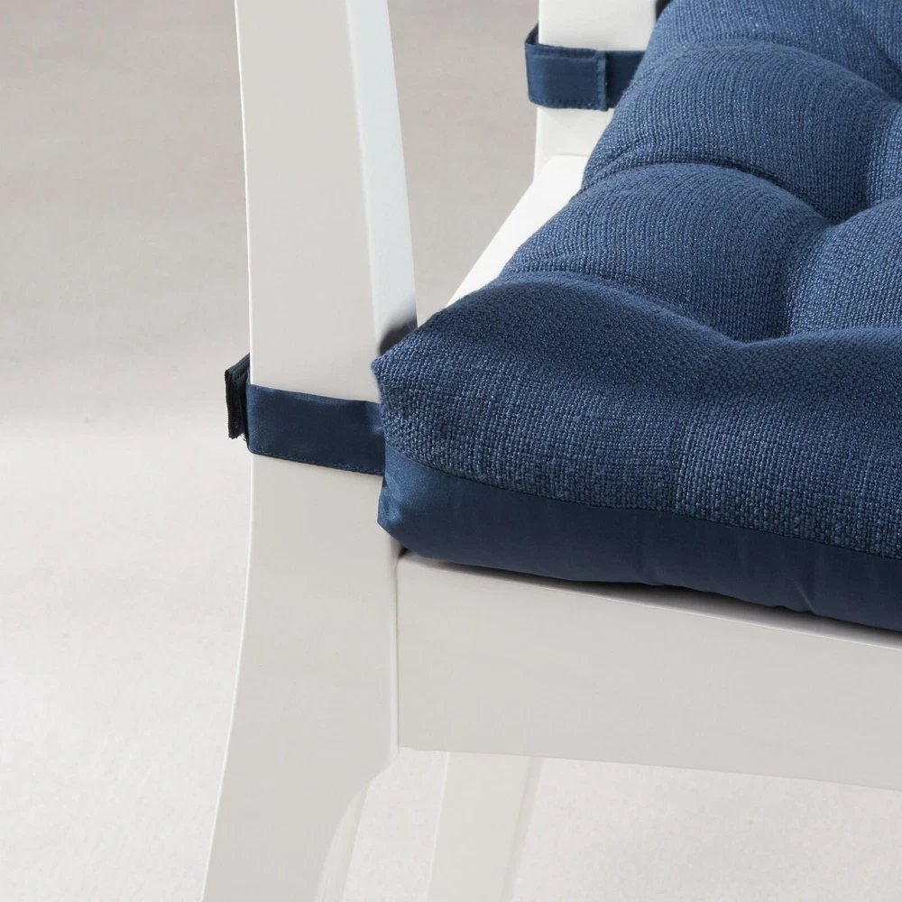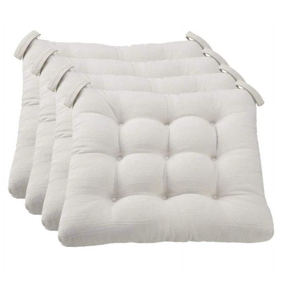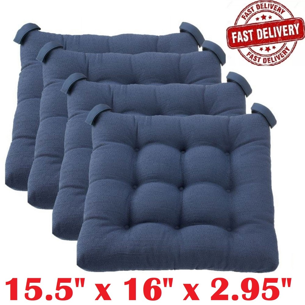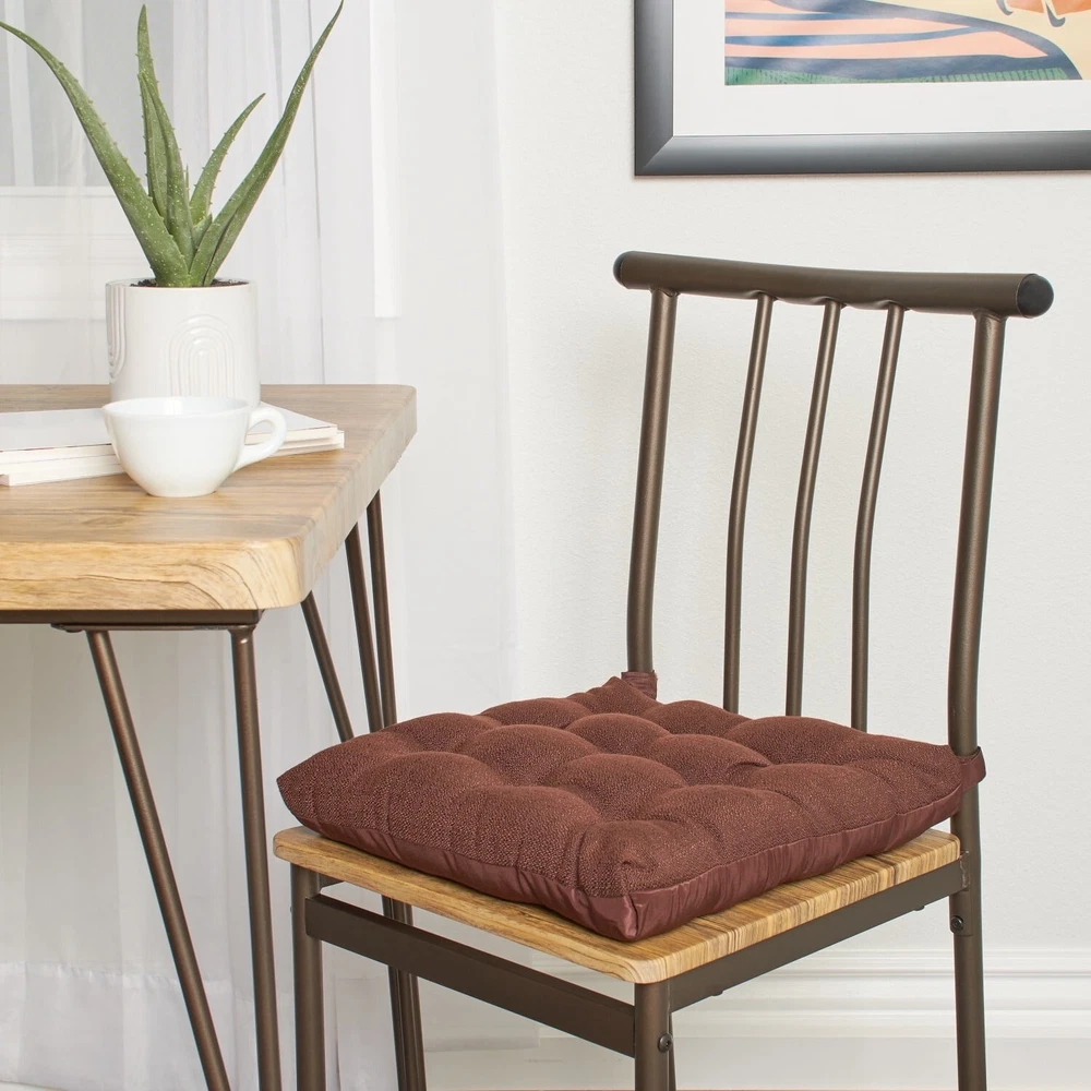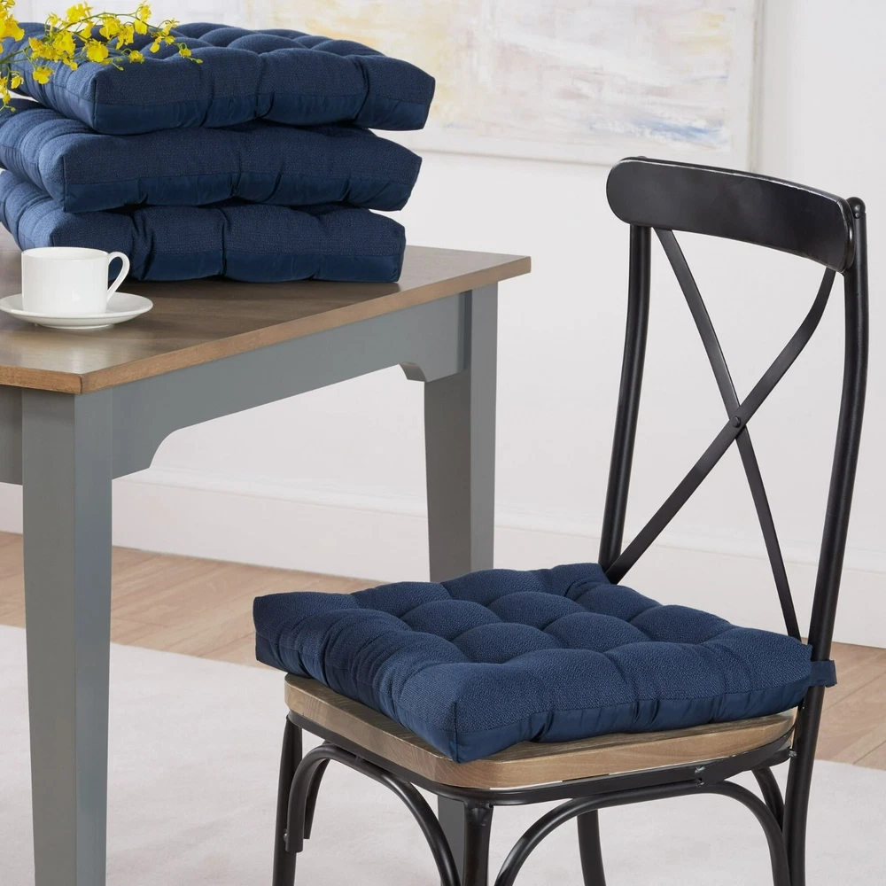 Product details - This is the perfect way to make almost any dining or kitchen chair more comfortable for longer, more enjoyable meals and get-togethers. -Each cushion features textured fabric for a casual charm and is button-tufted to provide that classic look that welcomes your family members, friends, neighbors, and visitors and invites them to take a seat and relax. -These cushions are crafted of 100% polyester with polyester fill for a long life of comfy use. Each cushion attaches quickly and easily to virtually any chair with Velcro loops that hold the cushion securely in place. Fits standard dining table and kitchen chairs Each cushion dimensions: 15.5" x 16" x 2.95" Each cushion dimensions: 15.5" x 16" x 2.95" To maintain color, we recommend spot cleaning only as necessary and allowing to air dry Each cushion weight: 1.17 lbs. Textured fabric for a casual charm Tucked finish for a classic look that welcomes your family members, friends, neighbors, and visitors and invites them to take a seat and relax Velcro loops attach quickly and easily and hold the cushion securely in place To maintain color, we recommend spot cleaning only as necessary and allowing to air dry Specifications Features Box Edge Recommended Location Indoor Brand Mainstays Manufacturer Part Number MSD026000040-01 Color Blue/Gray/Silver/Brown/Red Assembled Product Dimensions (L x W x H) 15.50 x 16.00 x 2.95 Inches