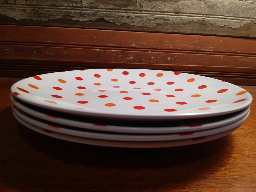 Set of 4 MAINSTAYS Melamine 8 1/2" Salad Plates Red & Orange Polka Dots ~ NEW Please contact us directly for any questions, concerns or issues with condition, shipper/carrier delays, etc. and we will work to resolve. Opening a case will only delay our ability to quickly resolve any issues you might have. We strive for 100% customer satisfaction and have an excellent track record. Purchase with confidence. For USA buyers outside the continental USA there may be an additional cost for shipping. Please contact us for the estimated shipping cost. For international buyers our estimated shipping cost is to EBAY's National Shipping Center on the American east coast. EBAY will provide you the additional cost to ship to your location. We sell "used" items in most cases, sometimes new. There are however some items manufactured in previous years that were never used. If such an item is in excellent condition and still has an original price tag, original packaging and in some cases the original box we will show it as a new item but describe it as "new old stock". We obtain our items through yard sales, storage sales, individuals, pickers that we use, auctions and various other means and we do consign items for sale on occasion. We do not know the history of the items we obtain as to how it was stored, who previously owned it, etc. Items are generally unique but we do buy multiples in some cases. We do research every item but are not experts on every item obtained. We do our best to describe each item accurately. NOTE: I describe and post photos of my items as best as possible and do not try to represent myself as an expert on anything that I sell. I am an honest seller and if I see a flaw, I will point it out and try to post a photo for your review and consideration. Used items are not perfect, not mint or near mint and can have scratches, marks, crazing, glaze flaws, trim wear, stains and general wear. Some items we sell have general wear consistent with age and other items do not show their age nearly as much. Please review our pictures as they are an important part of our condition description. If you receive an item that is damaged in some way let us know right away as shippers can be very rough on items shipped. Depending on the type of item we try to "double box" sensitive items to prevent damage. In many cases carefully wrapping the item in bubble wrap or other wrapping is enough protection. IF ANY SHIPPING DAMAGE OCCURS WHEN MULITIPLE ITEMS ARE SHIPPED TOGETHER, INCLUDING SETS, INSURANCE ONLY PAYS FOR THE DAMAGED ITEM ONLY.. NOT THE ENTIRE SET. YOU WILL ONLY BE REFUNDED FOR THE DAMAGED PIECE ONLY. I ship in recycled packaging when possible to reduce waste. If there is a problem, please contact me before leaving feedback. SHIPPING: I SHIP CHINA, GLASS AND OTHER FRAGILE ITEMS VIA FEDEX BECAUSE USPS WORKERS MISHANDLE AND BREAK EVERYTHING AND THEY DO NOT PAY INSURANCE CLAIMS.