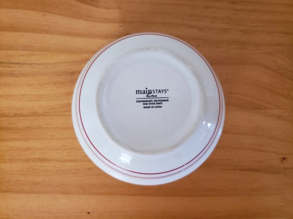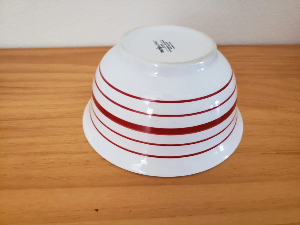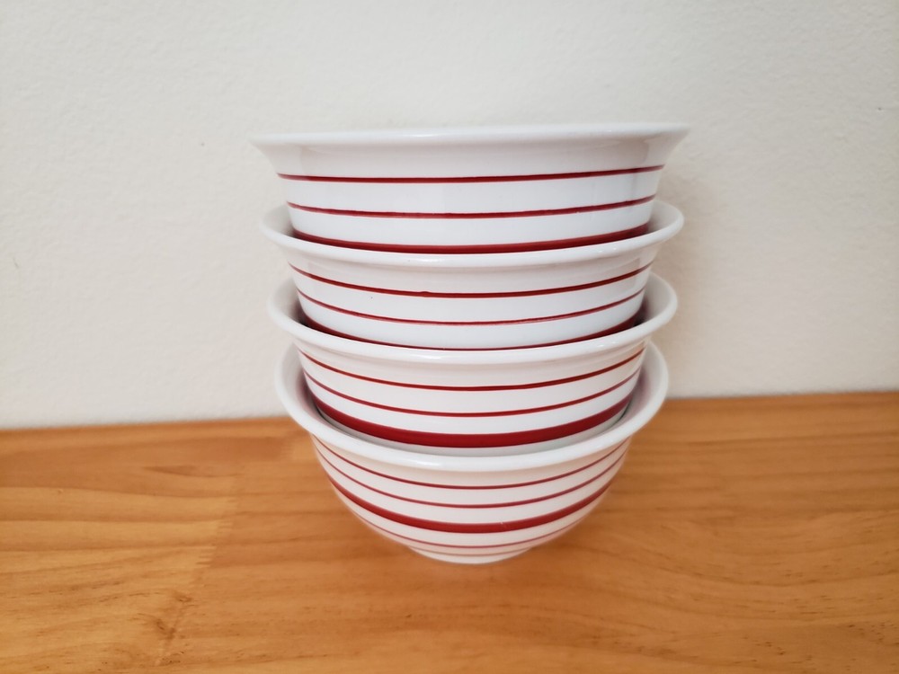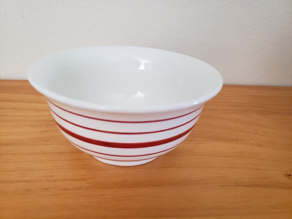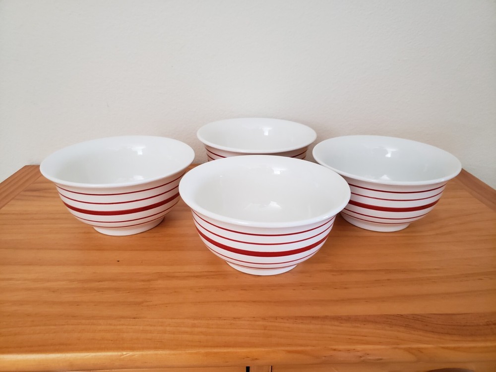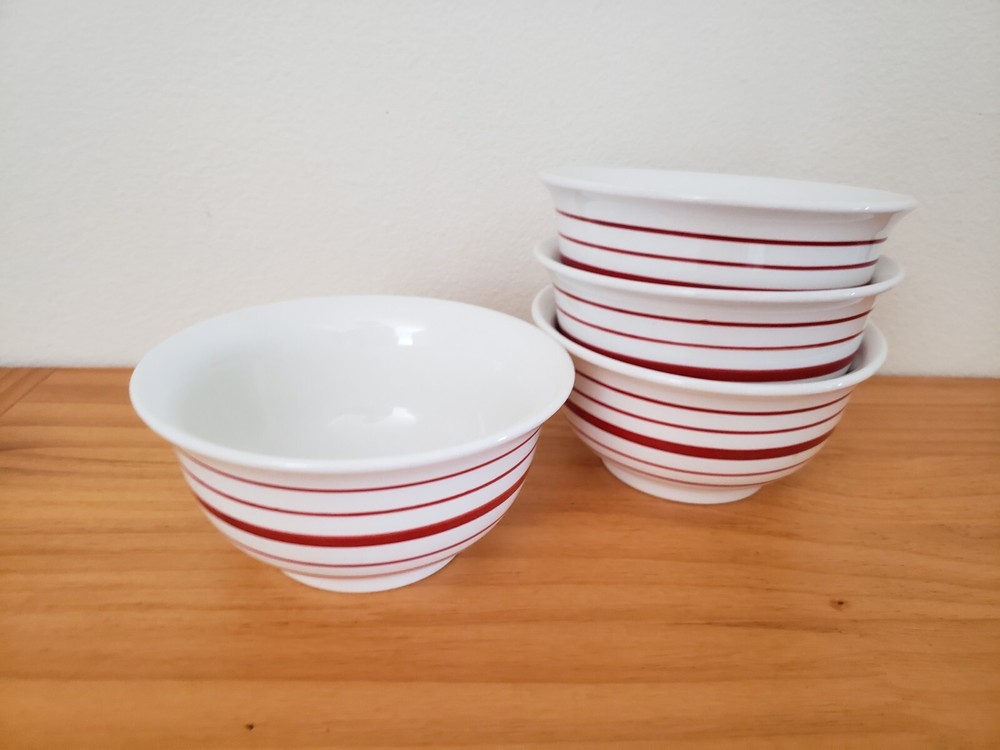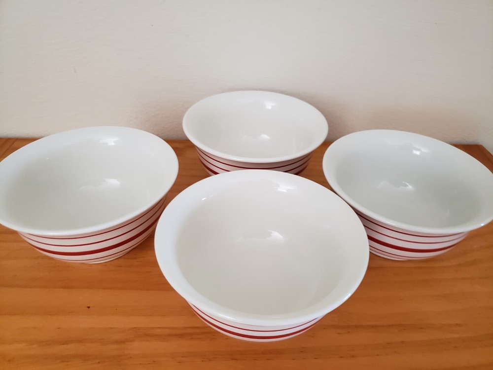 This auction is for a Set of 4 Mainstays Collection White Red Strips Stoneware Soup Cereal Bowls 6" x 3" in clean great condition! From a smoke-free & pet-free home. Photos are of the actual item you are purchasing, so please look at them closely for specifics on condition. Don't forget to check out my other auctions. I combine shipping! Thank you!