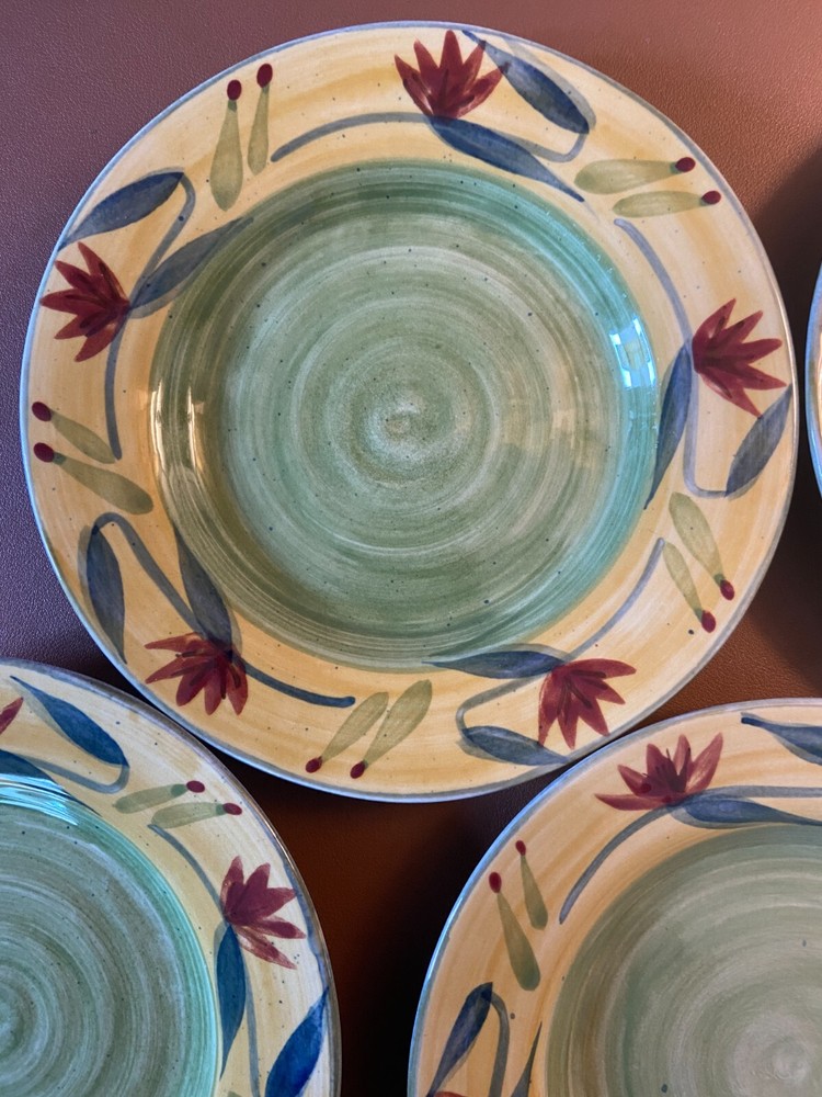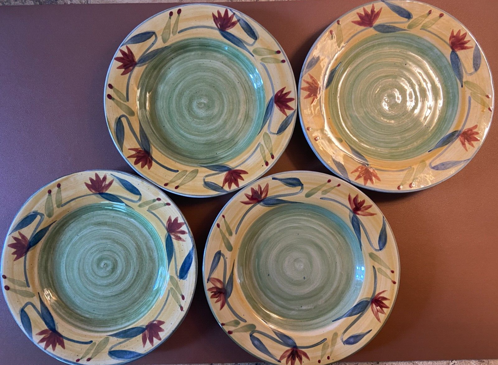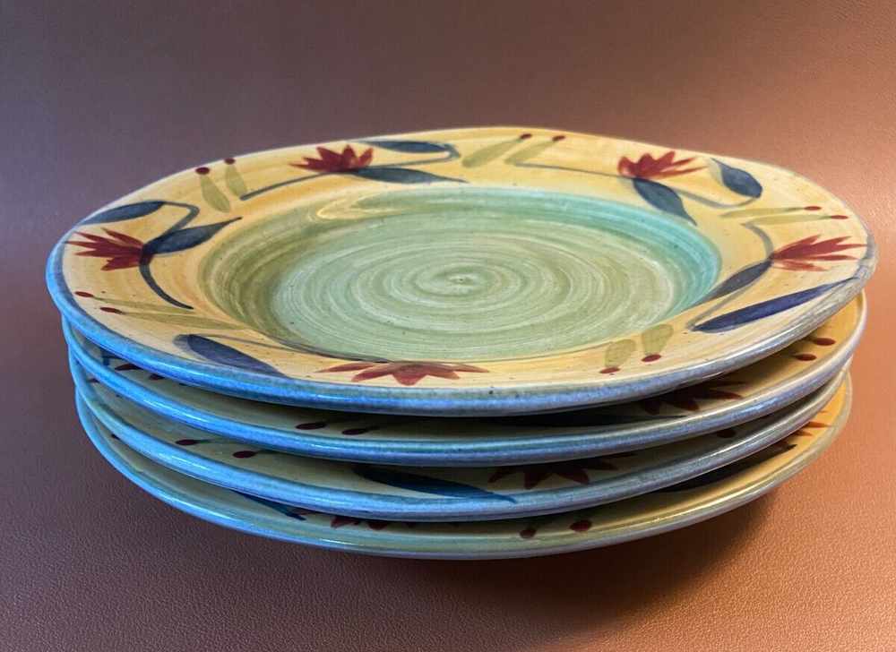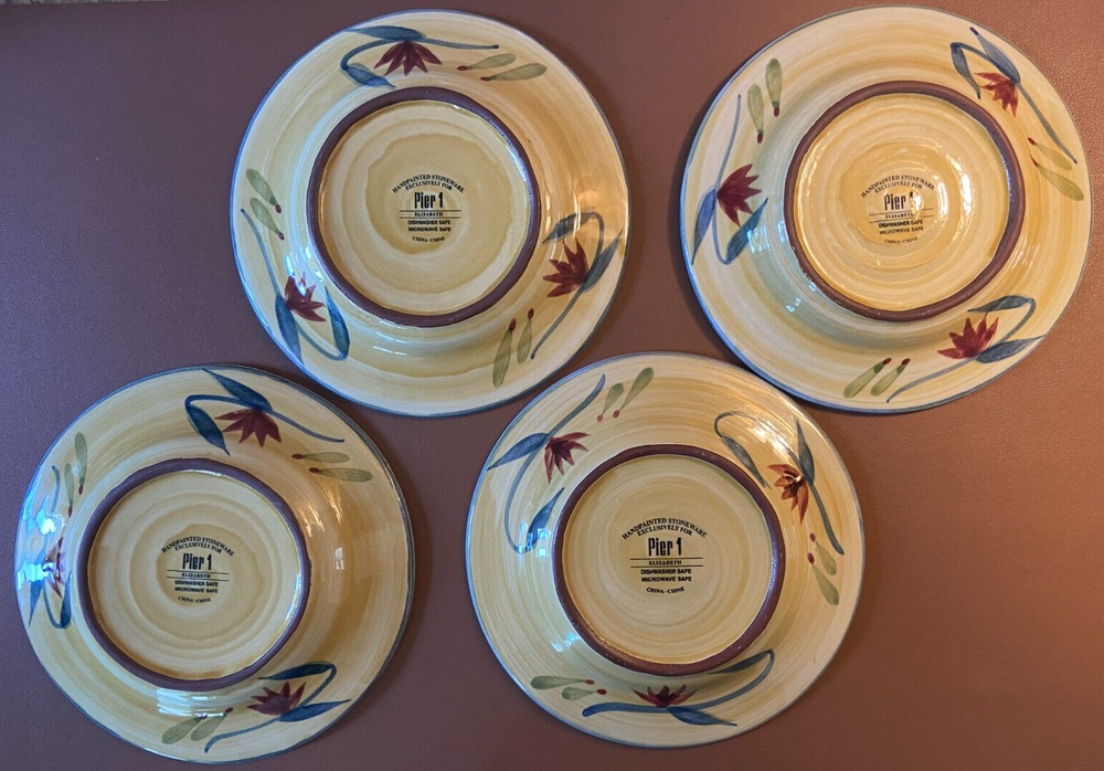 Set of 4 Pier 1 Elizabeth Salad Side Bread Plates 8" Stoneware Hand painted ~ No Chips, Nicks, Deep Scratches or Fading ~ Extremely Light Utensil Marks can be seen under Light, Clean, Bright Colors The items in the photos are the actual items that you are considering for purchase. Please see photos for more detail and condition. All items come to you professionally packaged from a smoke and pet free home. Please see my other listings, I always combine shipping. Thank you for looking. Any questions please contact me.