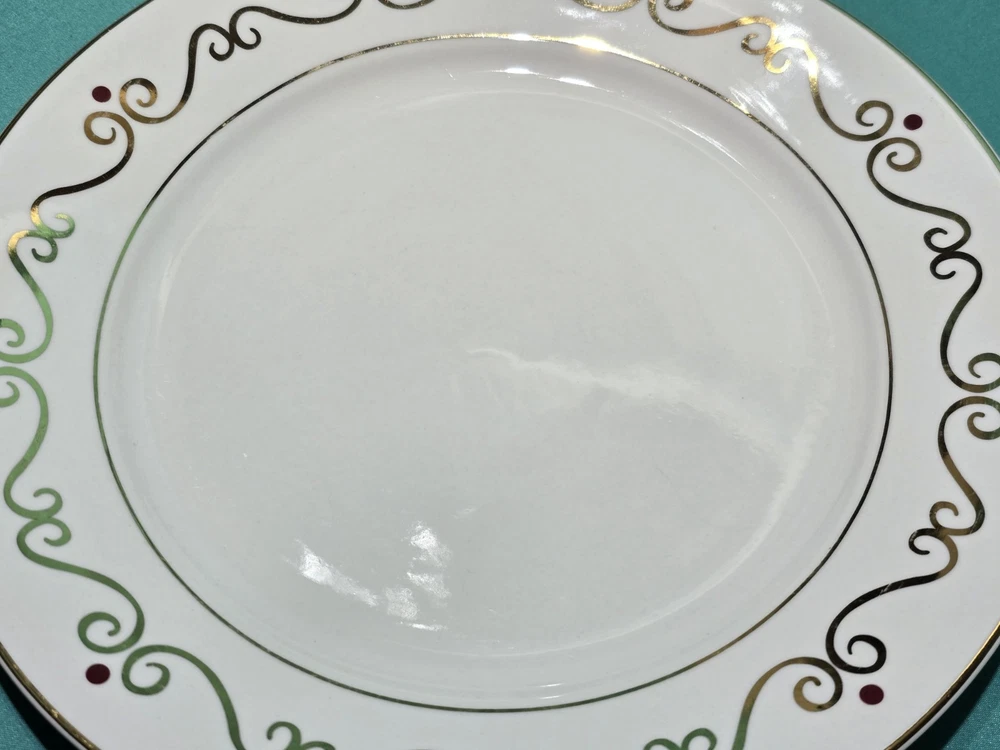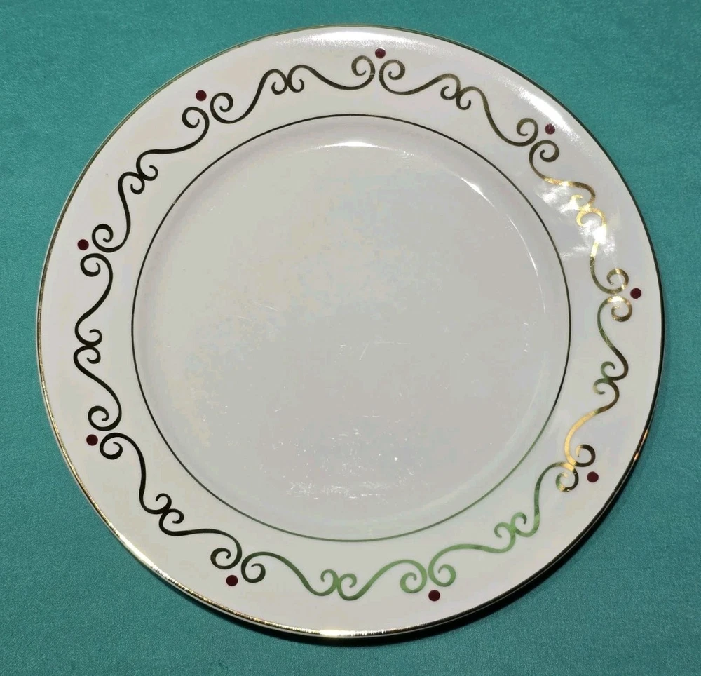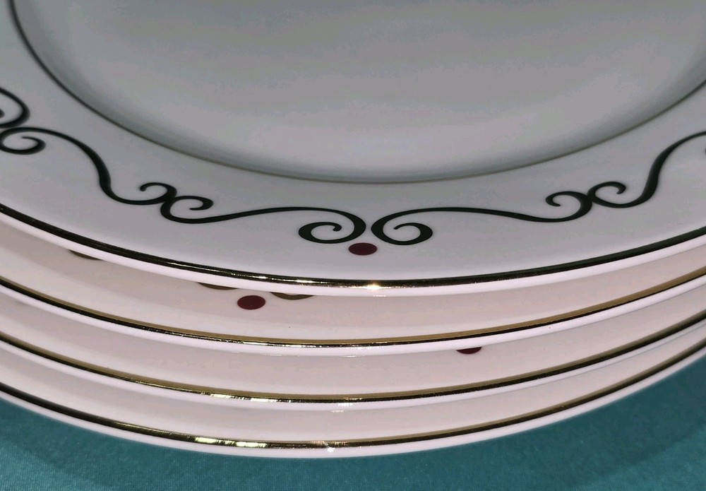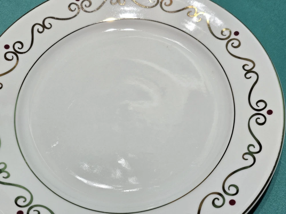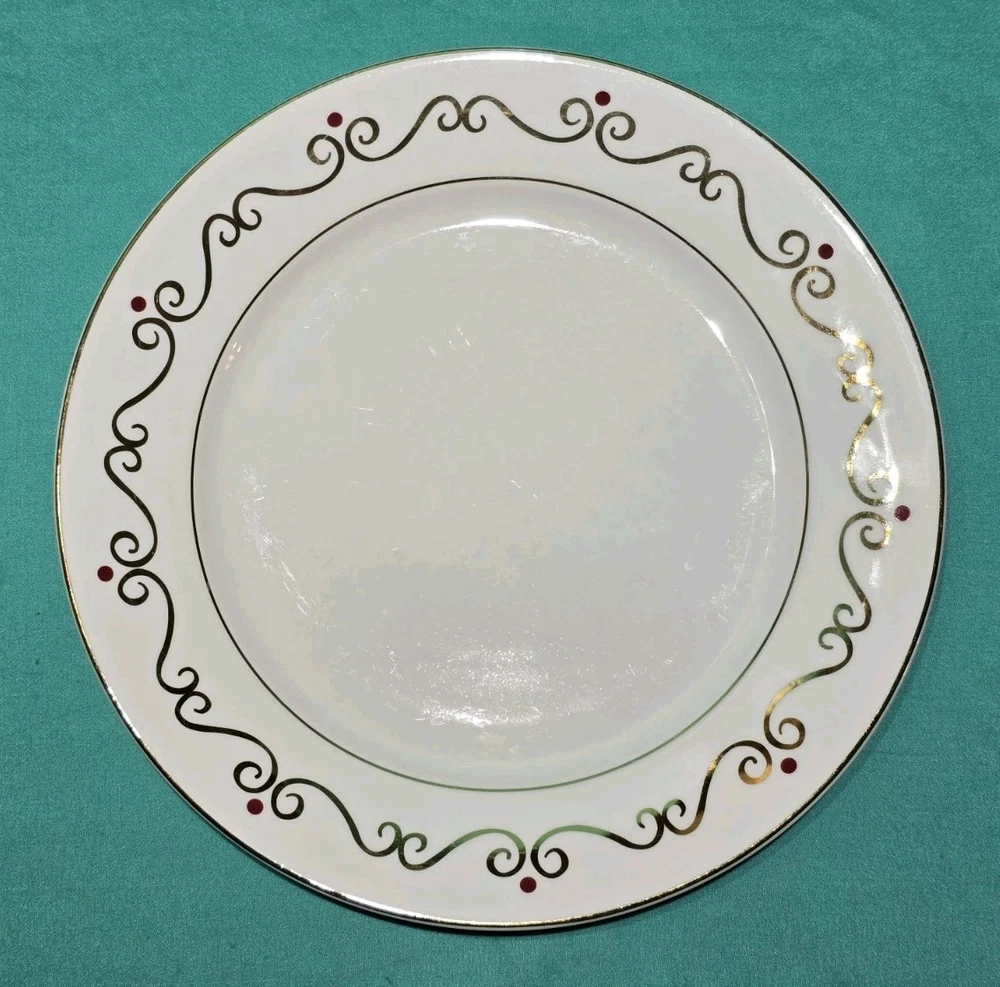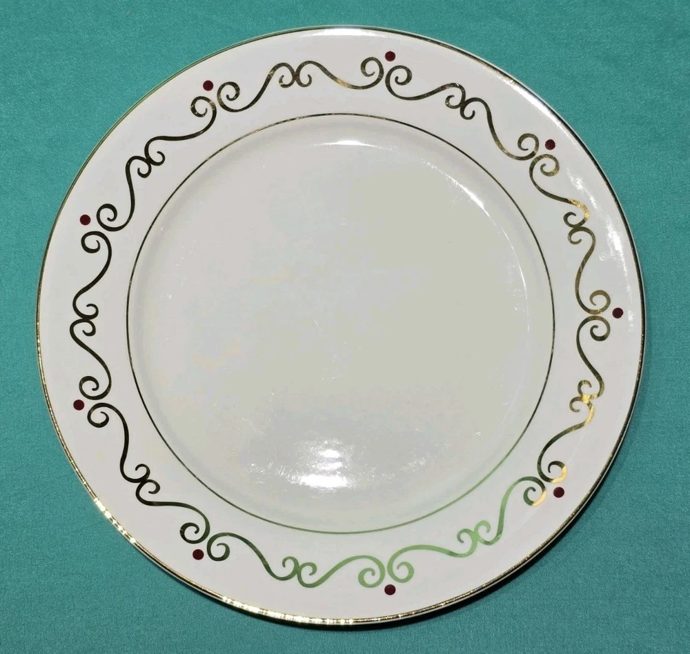 Set of four Pier 1 Holiday Scroll dinner plates Listing is for a set of 4 with an additional set of 4 available. All in excellent condition no chips or cracks some light Utensil Marks see photos for a detailed description of condition. Each plate showcases a beautiful Holiday swirl pattern with gold scrolls and vibrant red dots, adding a touch of sophistication to any dining occasion. The glossy white porcelain surface complements the rich accents, making these plates a festive choice for your mealtime gatherings.