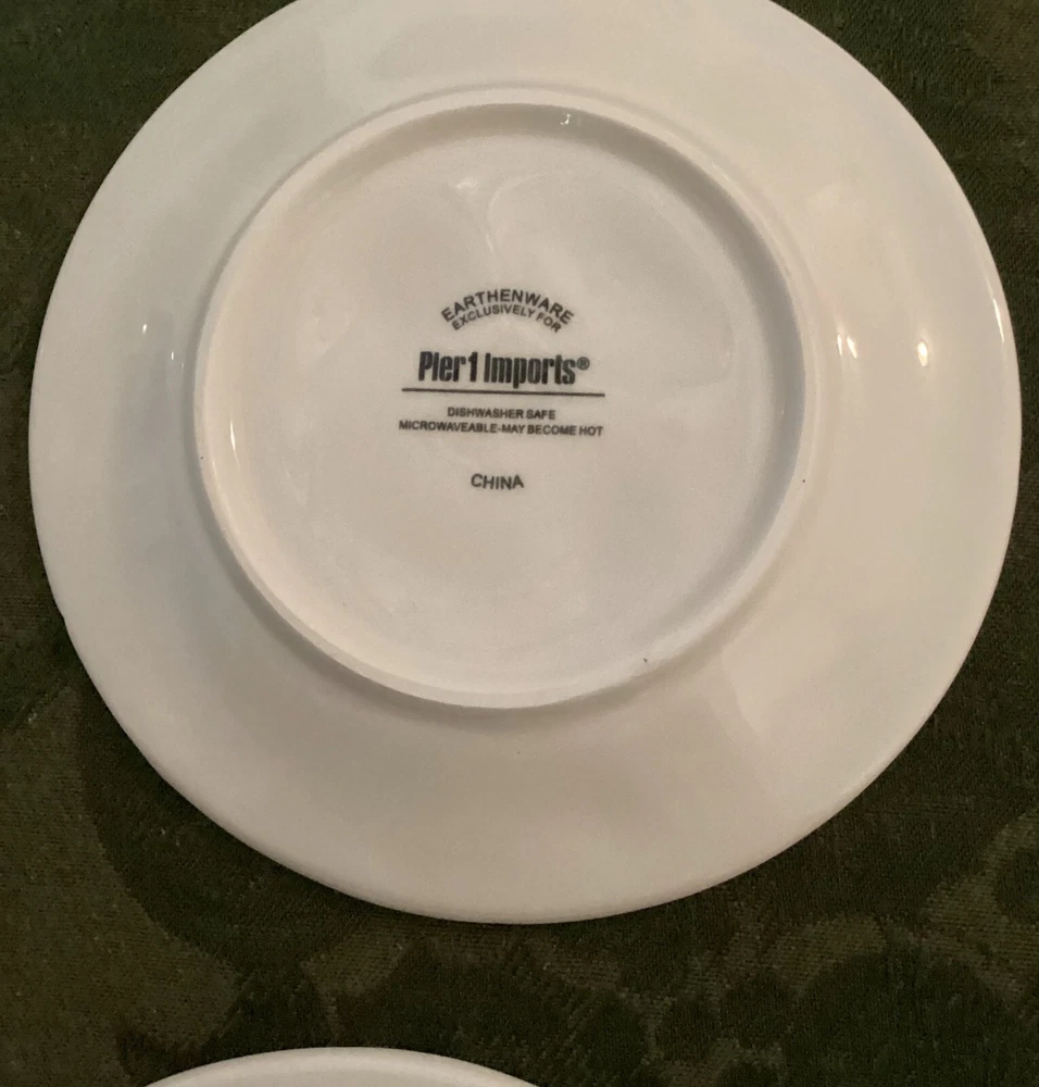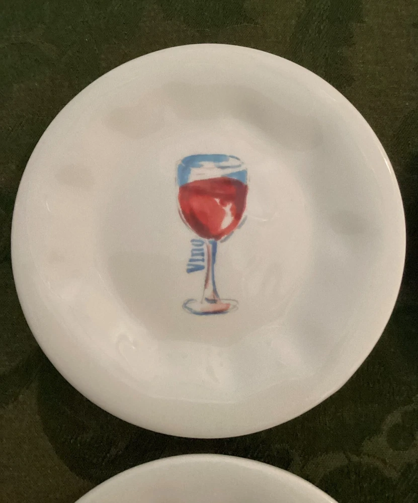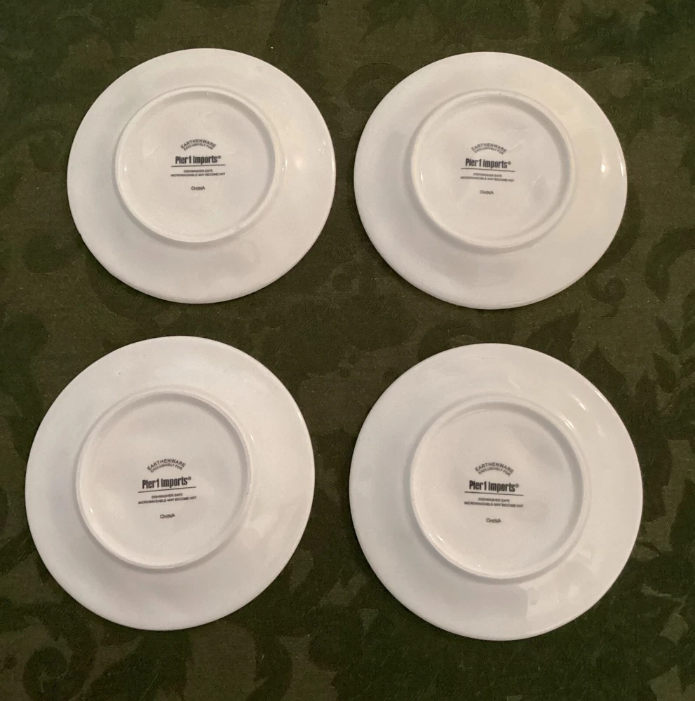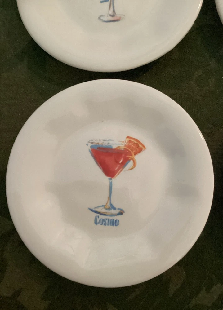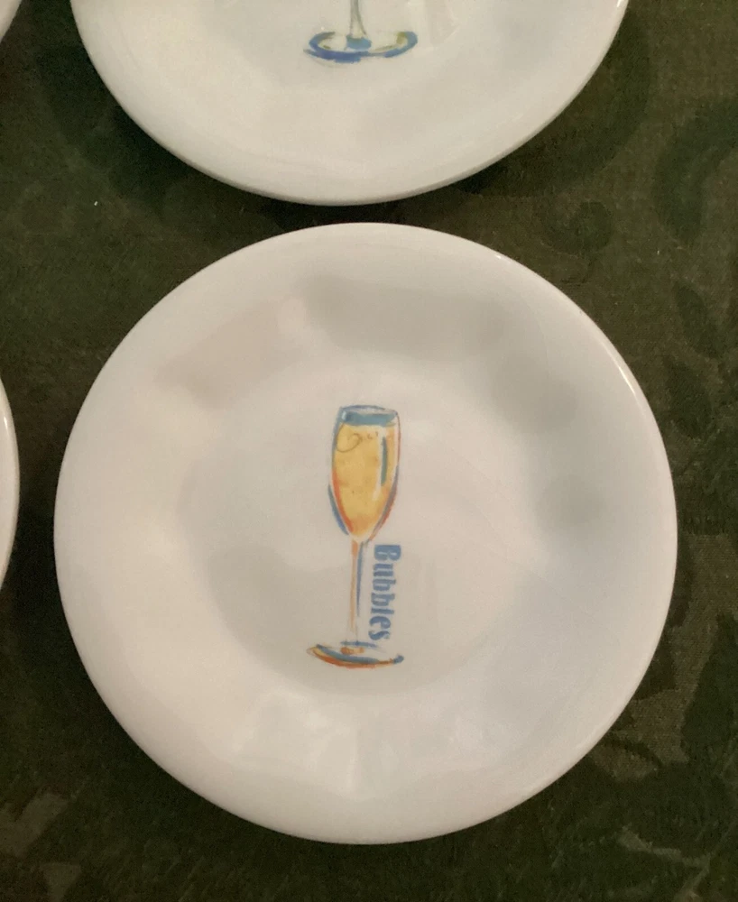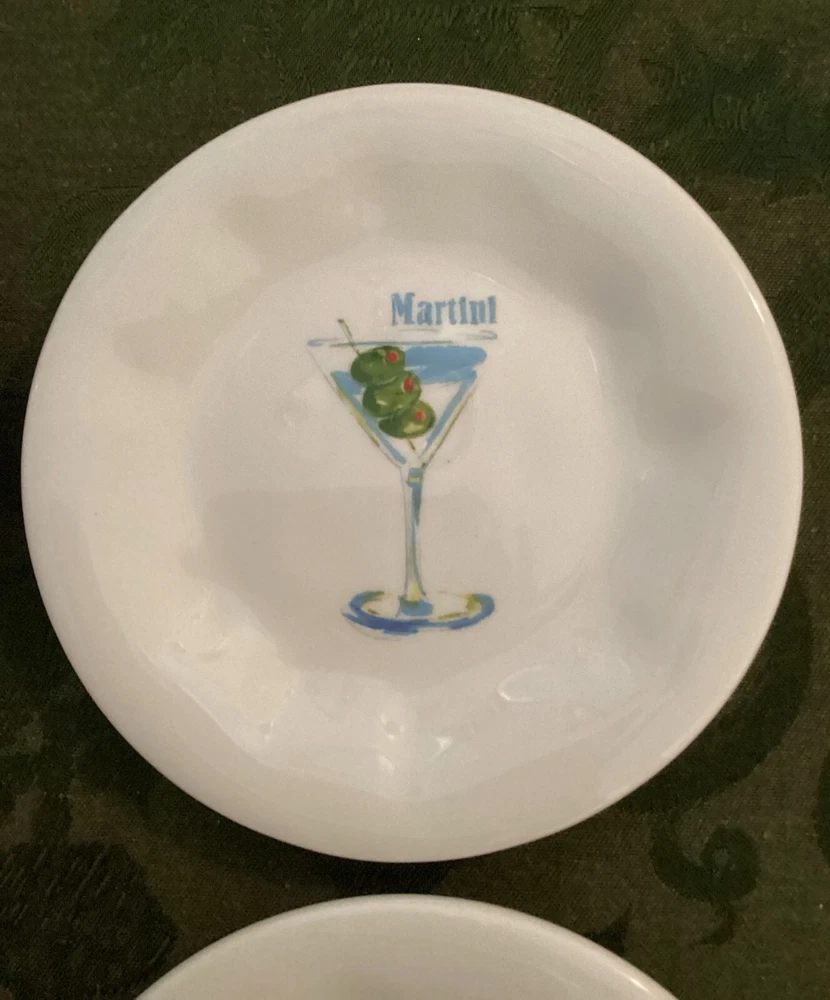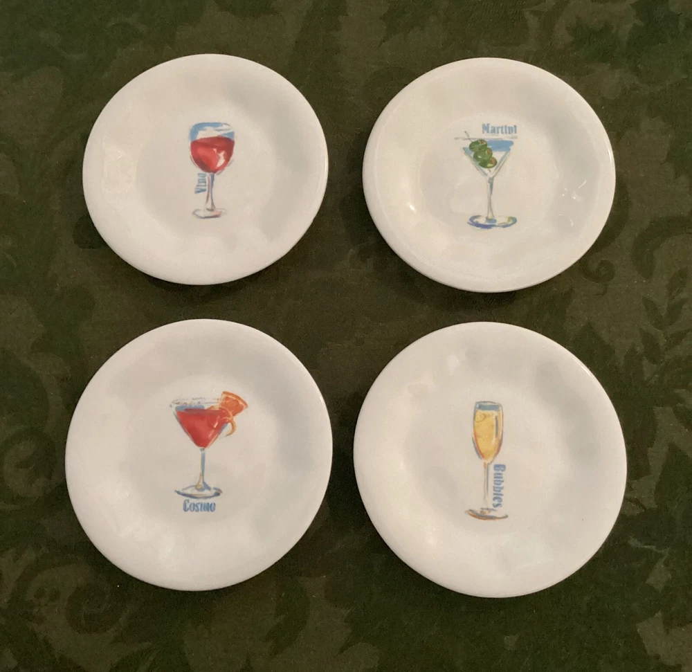 Set of 4 Pier 1 Imports 6" Appetizer Earthenware Cocktail Themed Plates. These are nice plates to use if you are serving a small appetizer with cocktails. 6" diameter. Each plated features it's own cocktail. Martini with olives Bubbles for champagne Cosmo for cosmopolitan Vino for wine Dishwasher safe - made in China.