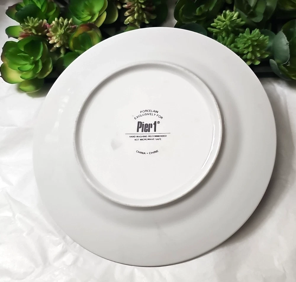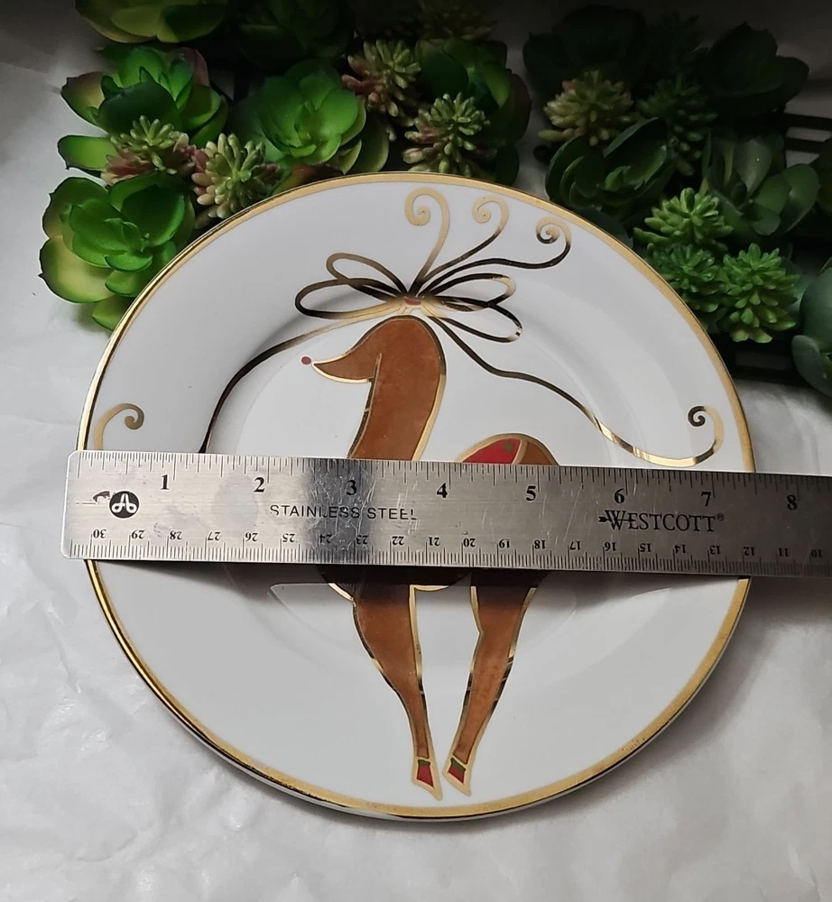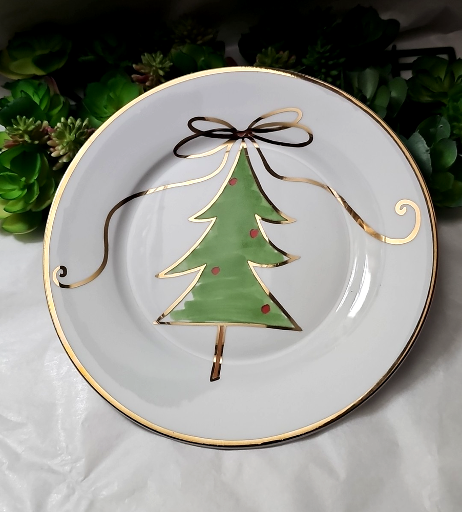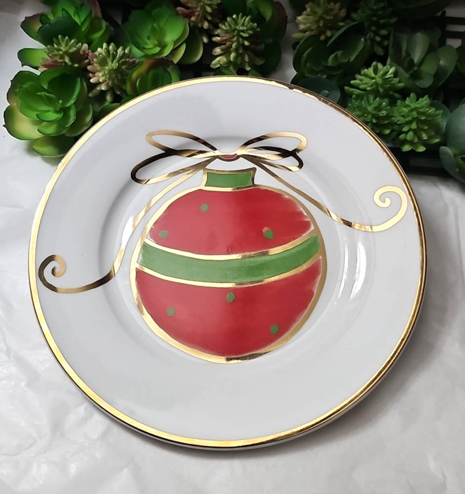 Elevate your holiday table settings with this elegant set of four Pier 1 Imports Gold Ribbons Christmas Ornament Dessert Salad Plates. Each 7-3/4" round plate features a vibrant, festive design that's sure to impress guests and add a touch of sophistication to any occasion, from Christmas feasts to everyday dining. NOTE: Pier 1 Imports has closed and these items are now rare and retired Crafted from high-quality ceramic and porcelain, these plates are both microwave and dishwasher safe, combining functionality with style. With a glossy finish and a weight that speaks to their quality construction, these plates are a perfect addition to your dinnerware collection. Their art deco style and Christmas holiday pattern make them a timeless choice for those who appreciate the beauty of holiday table settings. Whether for special occasions or everyday use, these salad and dessert plates are sure to be a hit with family and friends.