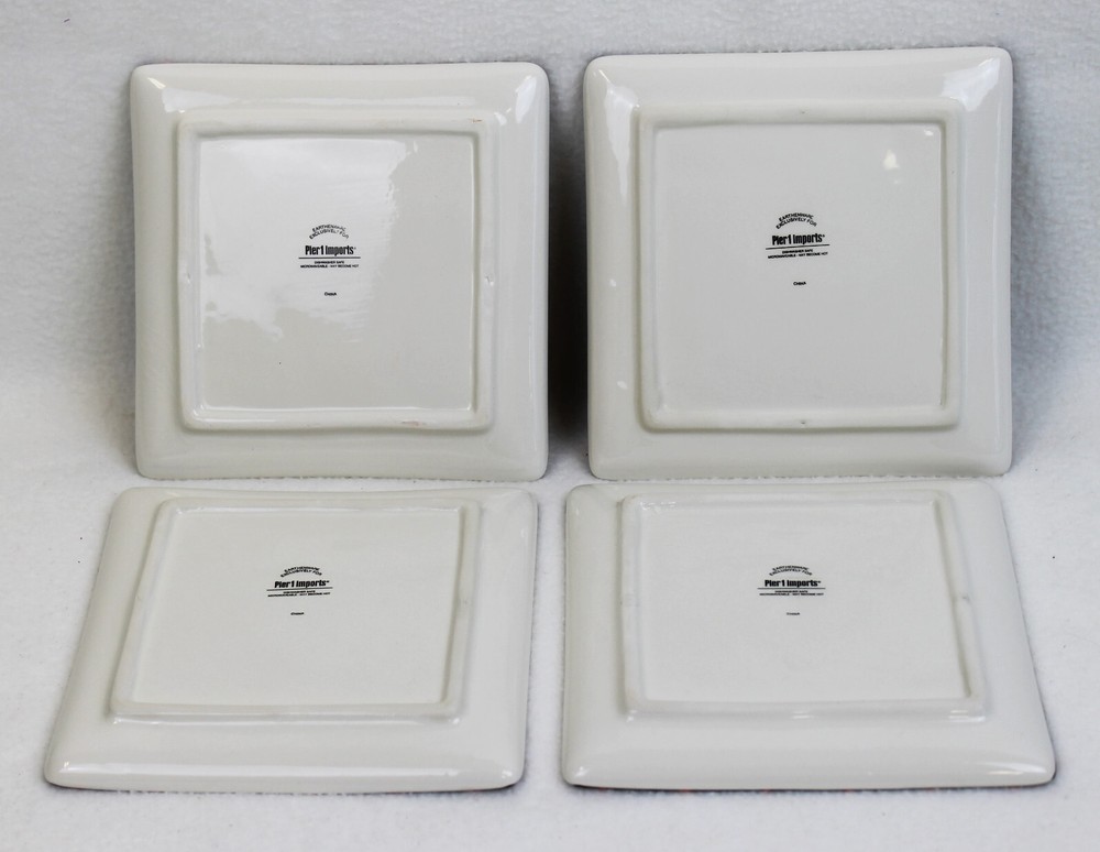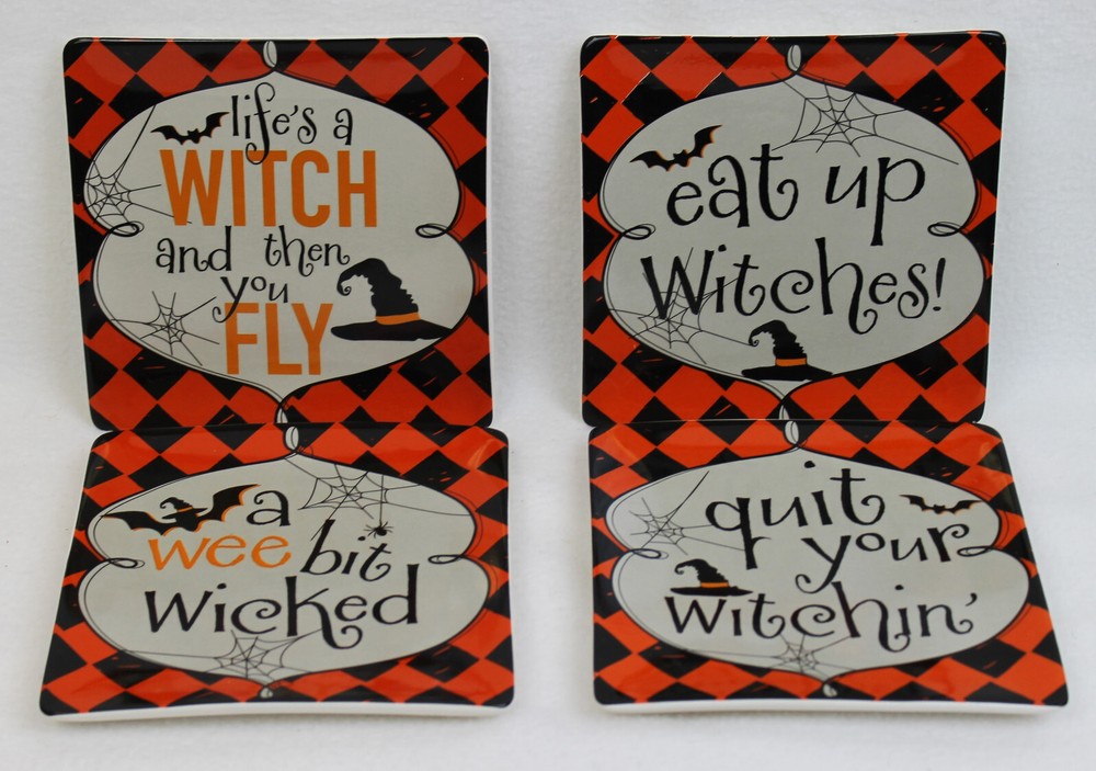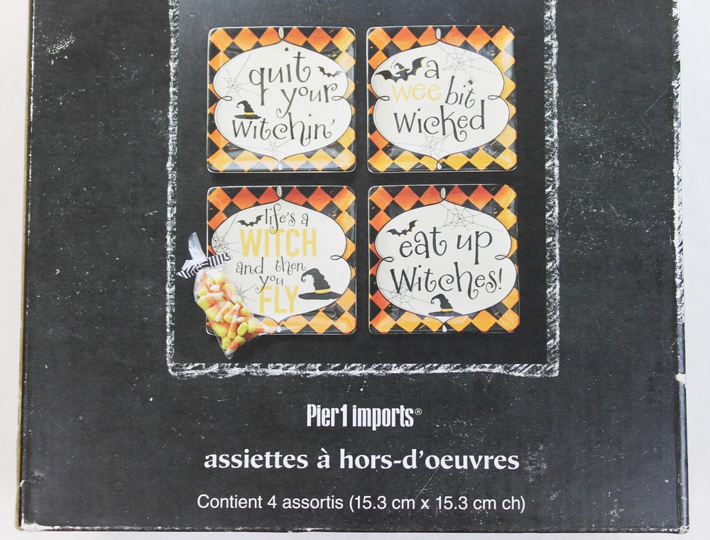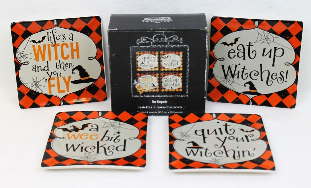 You are buying a set of 4 Pier1 Imports Halloween appetizer/dessert plates 4 different designs 6" x 6" Pre-owned in original box, never used Fast and safe shipping...