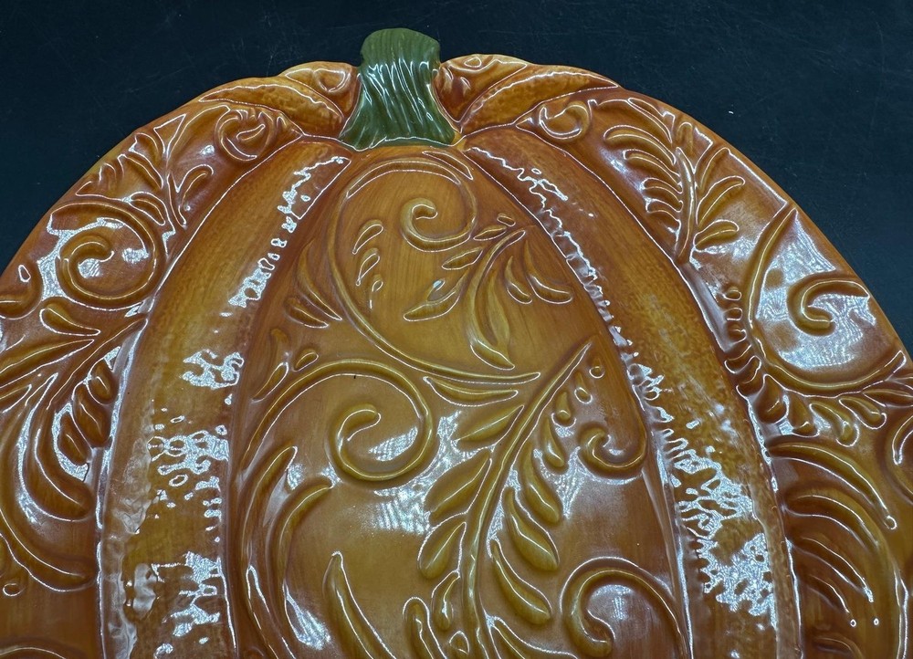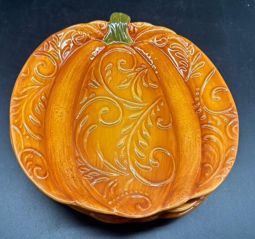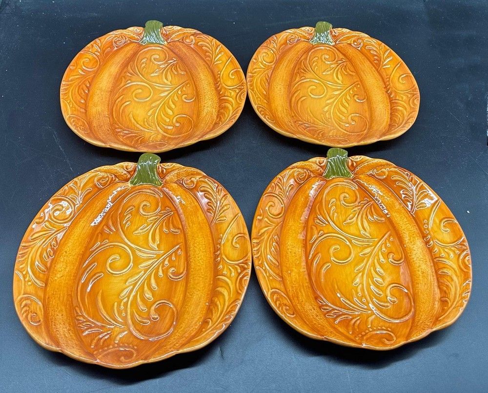 Set of 4 Pier 1 Imports Majolica Pumpkin Salad Cake Dessert Plates Set of 4 Pier 1 Imports Majolica Pumpkin Salad Cake Dessert Plates Set of 4 Pier 1 Imports Majolica Pumpkin Salad Cake Dessert Plates Click images to enlarge Description This listing is for a set of 4 beautiful 8.5” majolica pumpkin salad, cake, or dessert plates made by Pier 1 Imports. They were part of their popular Thanksgiving line in 2013 and are now discontinued. They have beautiful shading and a lovely majolica scroll design. Each plate measures approximately 8.5” H x 8.5” W x 1.5” D. Condition: Three of the plates are brand new and were never used. The fourth plate was used once and suffered a tiny fleabite chip in the center of the plate, below the stalk, as is shown in our photos. Additional Information: We strive to be as accurate as possible in our description, when listing each item we sell. We inspect each item for flaws and disclose any we find. If you have any questions, please contact us before bidding. We are human and may occasionally miss a flaw. If for any reason you receive something not as listed, please contact us ASAP. Customer Service is very important to us and we want you to be happy with your purchase. If we make an error, we will try to make it right, but please remember, we can't help you if you don't let us know about it. Refunds are accepted on items significantly not as listed. Please contact us to make arrangements for return/refund. Shipping: We combine shipping on multiple item purchases. As a NJ corporation, we strictly adhere to all state and Federal laws governing our business practices. We must disclose the true Customs value for international shipments. Buyer is responsible for any import, duty, or customs charges. We reserve the right to refuse to sell this item to buyers in certain locations, based on a country’s import or shipping restrictions. If you are unsure whether an item can be imported into your country from the US, please contact us PRIOR to bidding. Get images that make Supersized seem small. Showcase your items with Auctiva's Listing Templates! THE simple solution for eBay sellers. Track Page Views With Auctiva's Counter