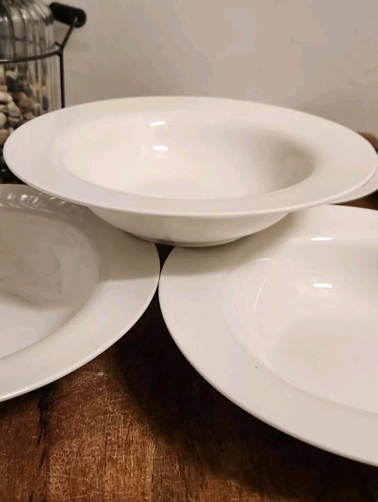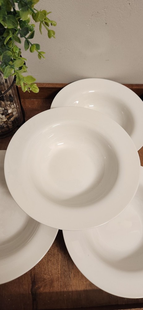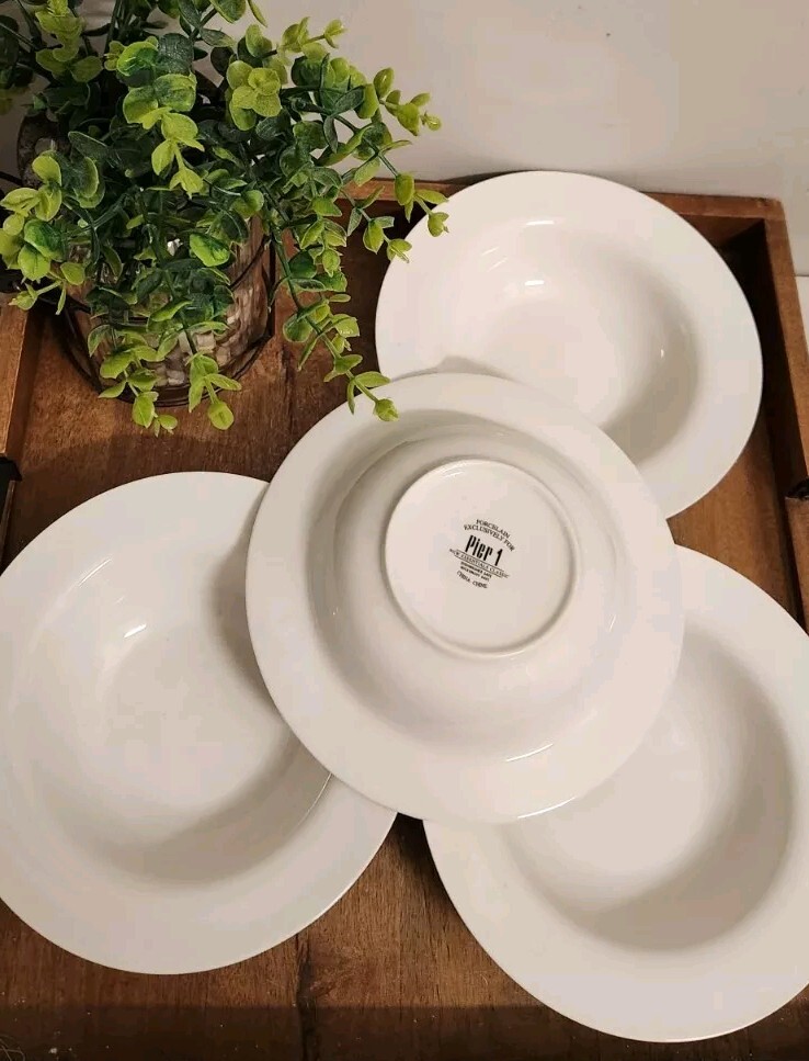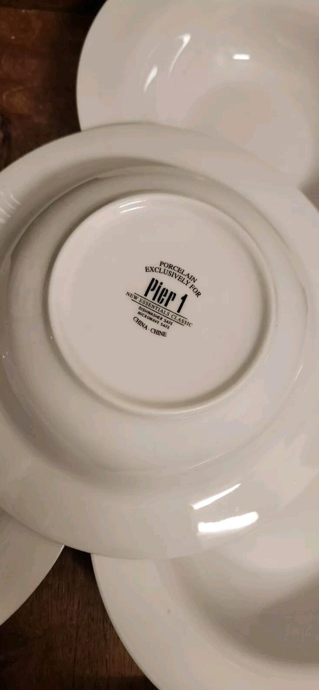 Set of 4 Pier 1 Imports New Essentials Classic Rimmed Soup Bowls 8⅝" White EUC Excellent pre-owned condition. These look brand new. I also have additional pieces listed in this pattern. Combined shipping is done in the form of a refund once the orders are packed. Max weight per box is approx 25lbs. I will not separate & I'm not taking offers.