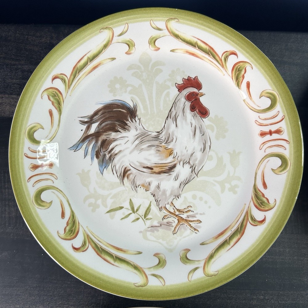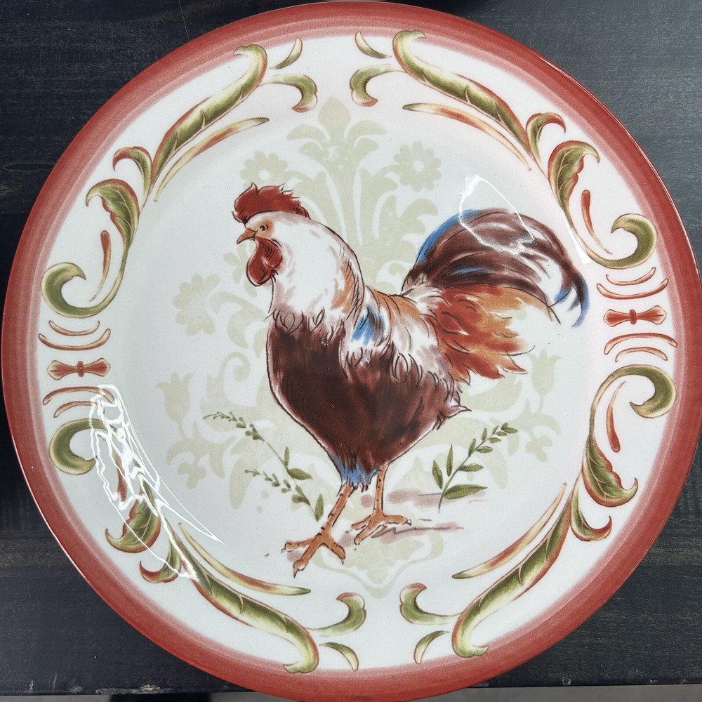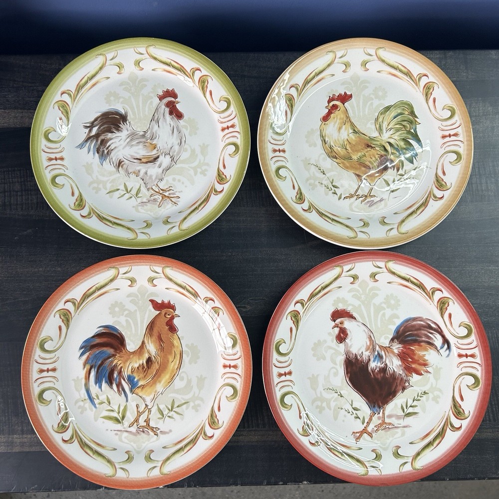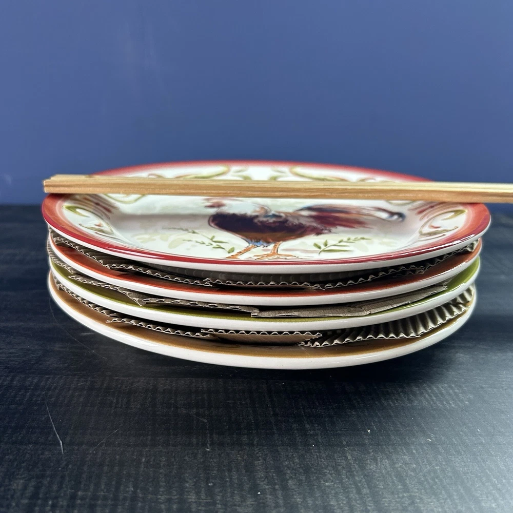 Set of 4 Pier 1 Imports Rooster Chicken Luncheon Plates 8.75” 4 designs READ *** small chip on green plate- see picture(s) Pre-owned condition. Please see pictures for reference.