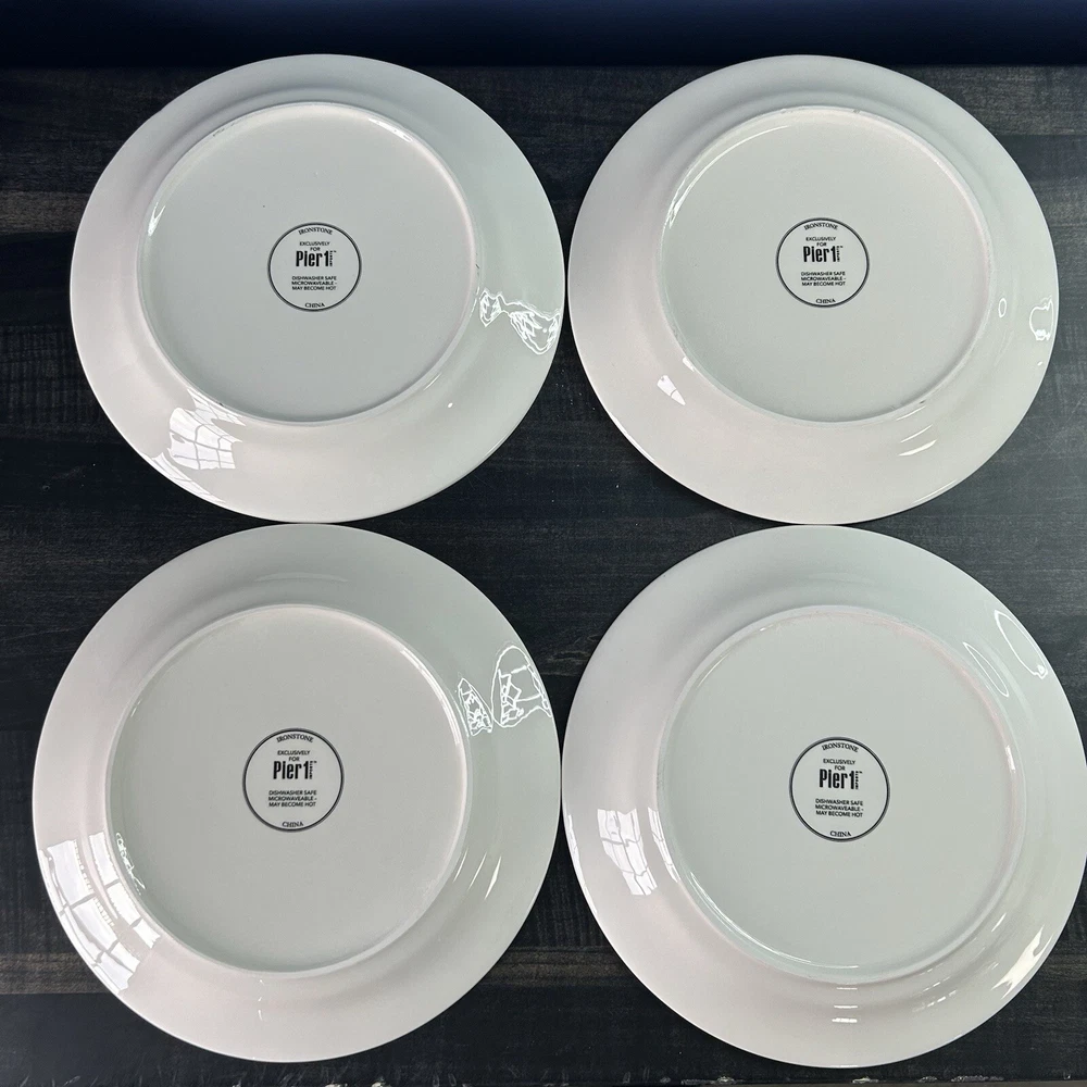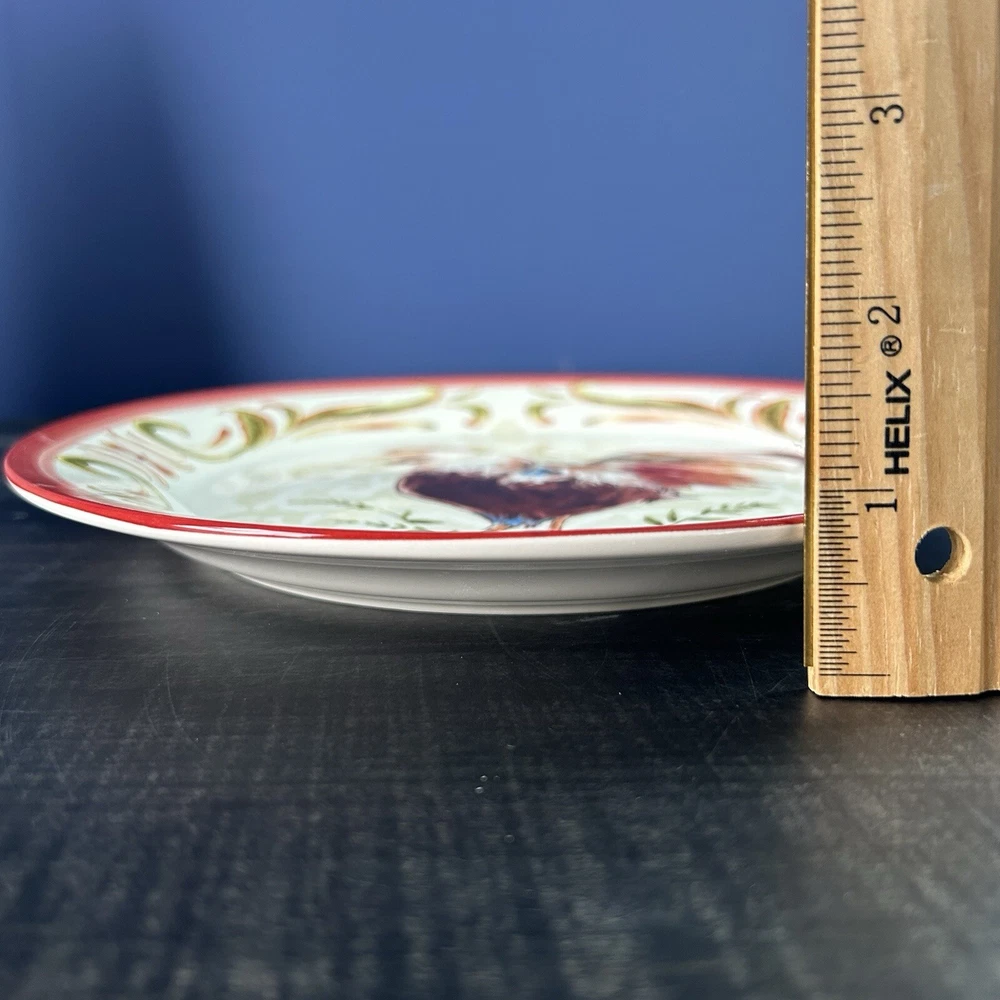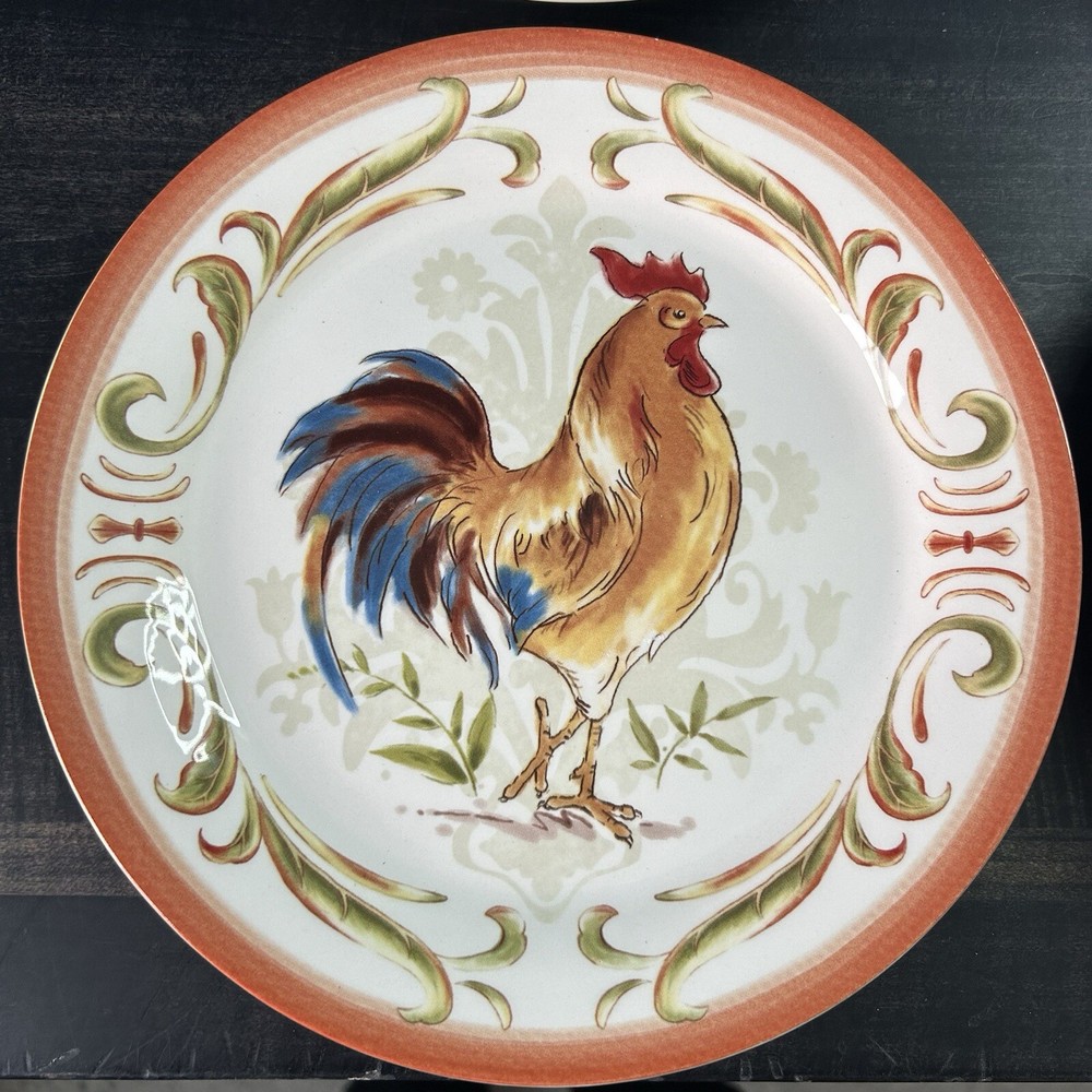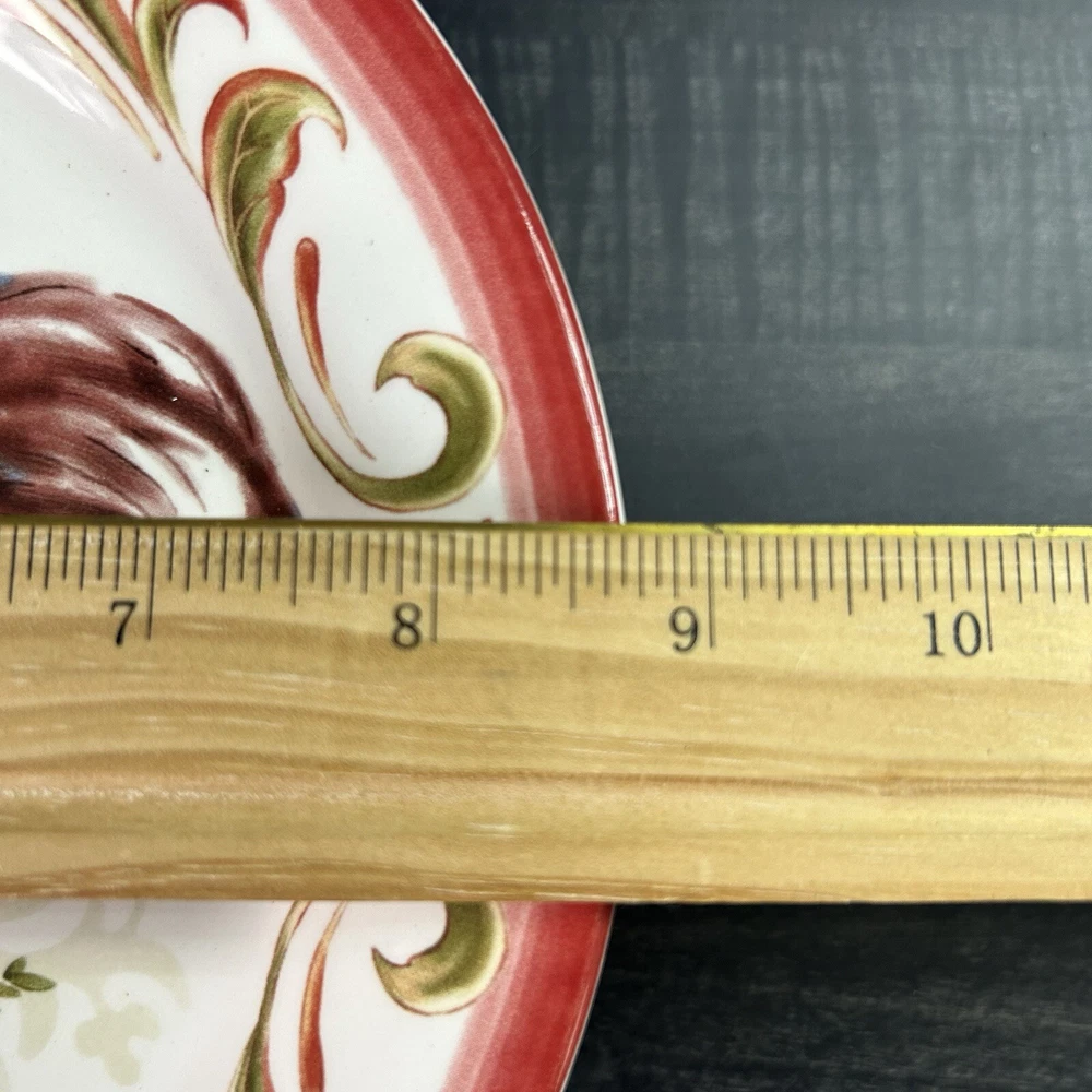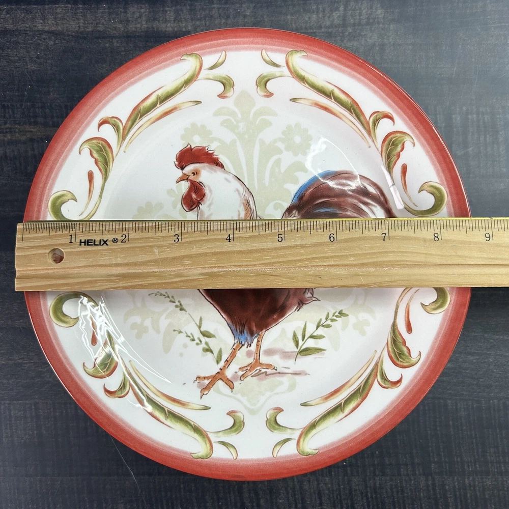 Set of 4 Pier 1 Imports Rooster Chicken Luncheon Plates 8.75” 4 designs READ *** small chip on green plate- see picture(s) Pre-owned condition. Please see pictures for reference.
