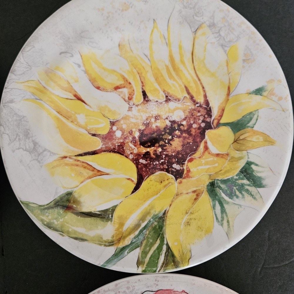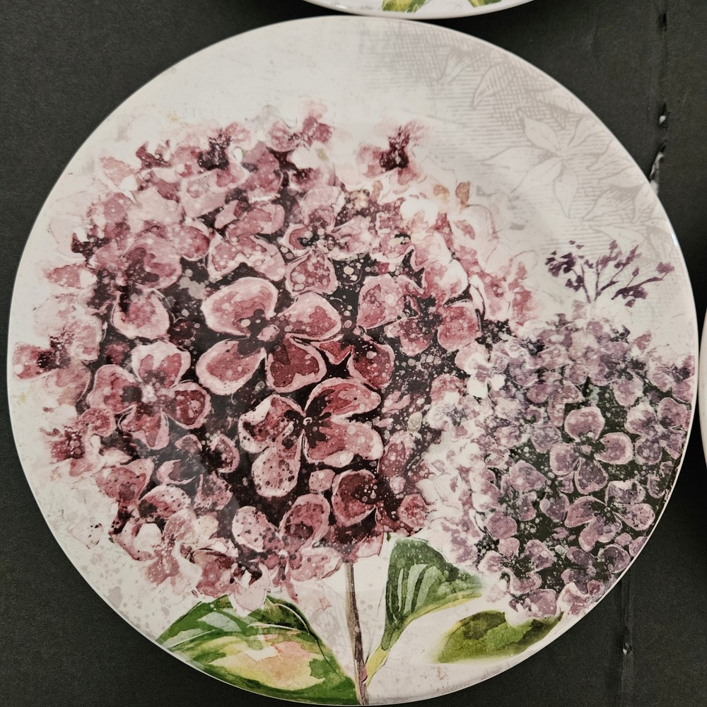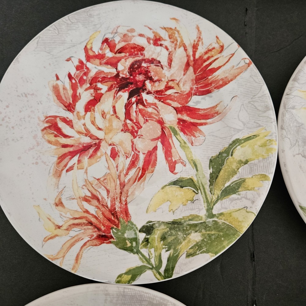 This set of four Pier 1 Imports Floral Blooms 8.5" plates features a beautiful multicolor floral pattern, perfect for all occasions. Made of durable ironstone and stoneware, these round plates are stackable, microwave safe, and dishwasher safe for easy cleaning. The decorative plates showcase a variety of flowers including sunflowers, poppies, and chrysanthemums, adding a contemporary touch to your dining experience. With a glossy finish and a production style of art pottery, these plates are a stylish and practical addition to your table setting.