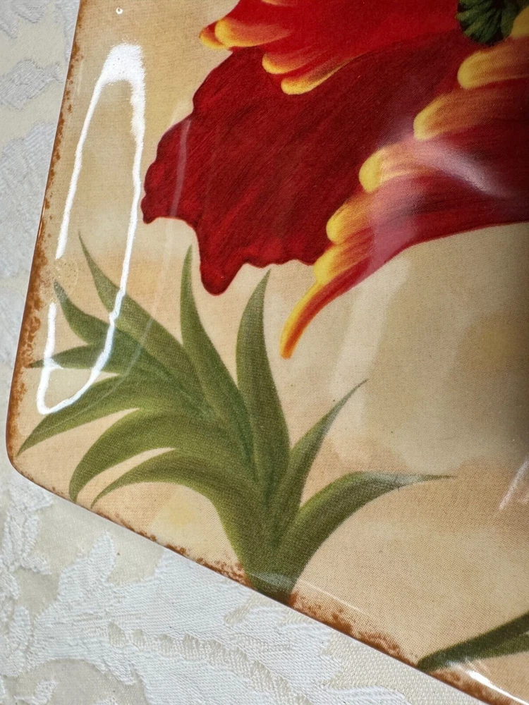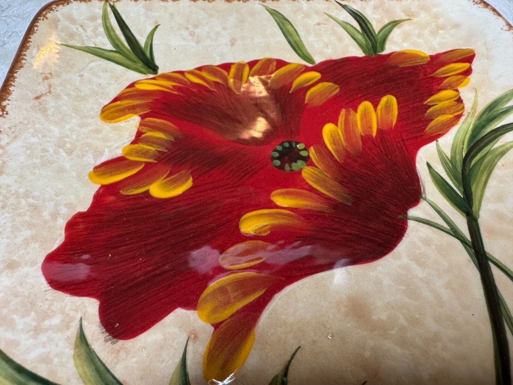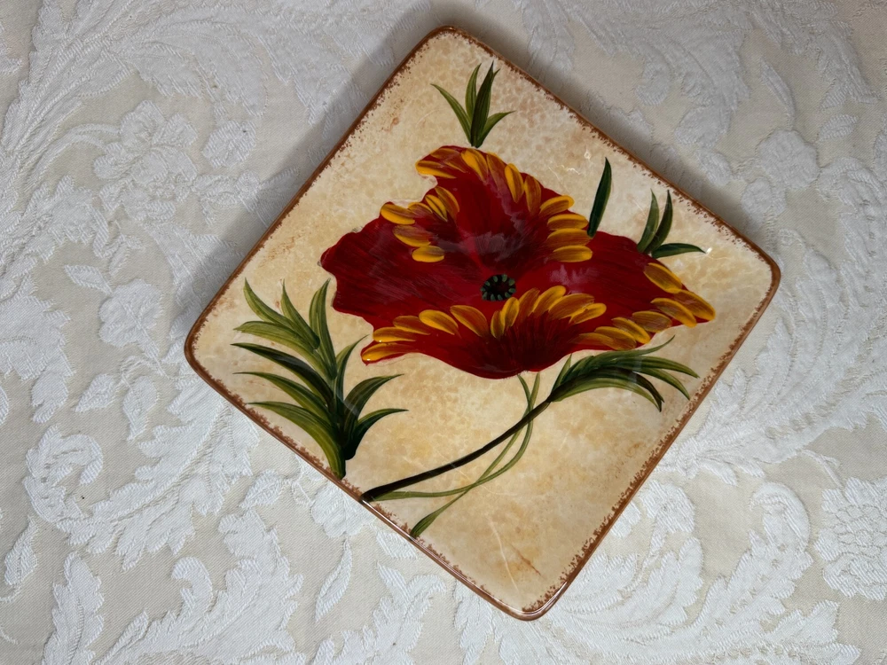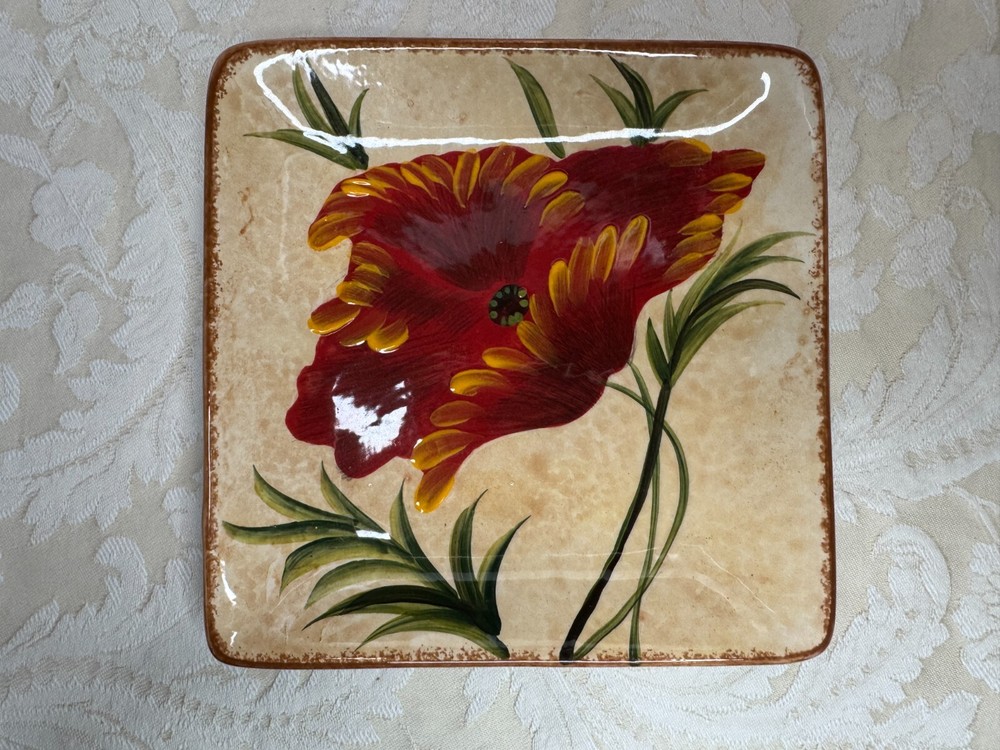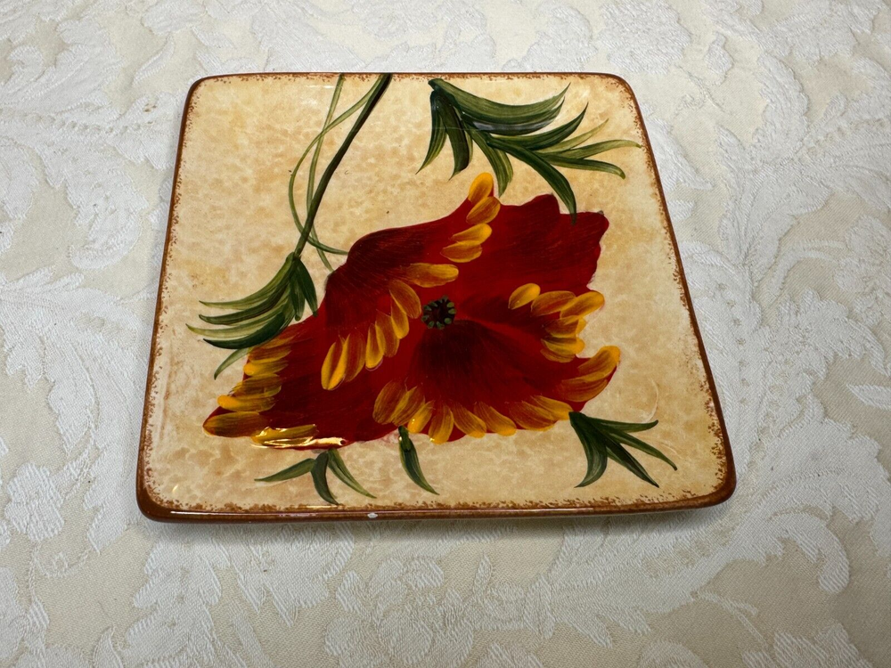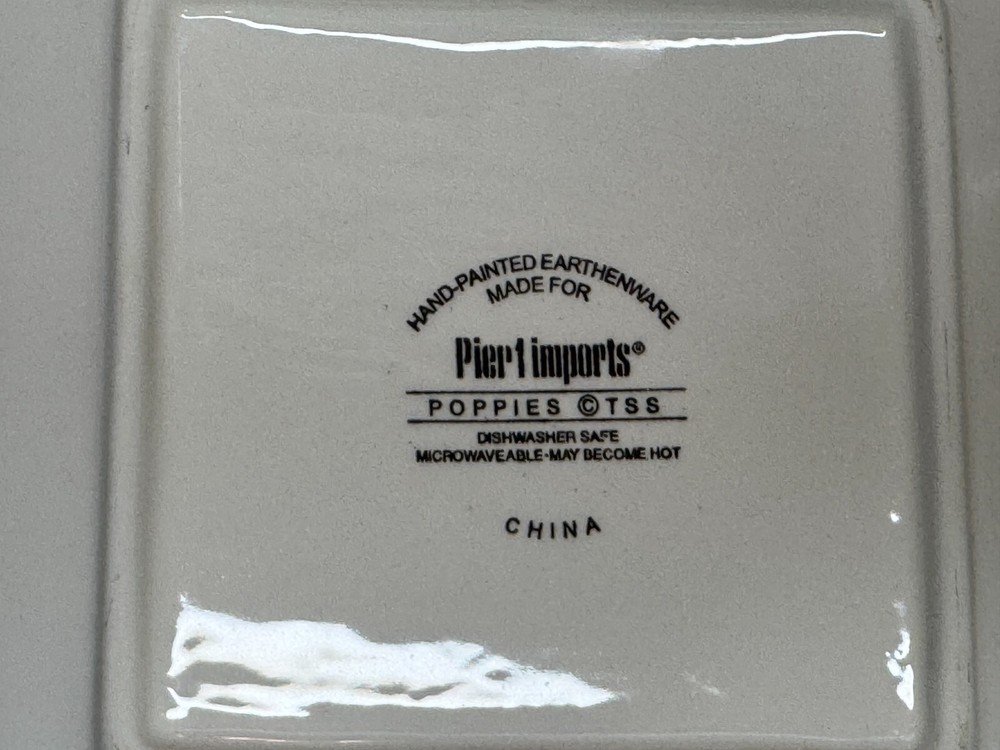 Set of 4 Pier 1 Red Poppies Square 6" Dessert Appetizer Plates Excellent Used Condition! One Plate Has A Small Chip In The Glaze Can be touched up or a small drop of paint to fix. Please see all photos. Selling on eBay for over 25 years since 1999! Please check out my other vintage items for sale. Buy with confidence, see my feedback. Shipping is calculated by eBay, package weight and your zip code. Ships to lower 48 US states only. Please note: NEW INSURANCE POLICY NOTE: If an item is damaged during shipping it is now the buyer's responsibility to file the claim with the USPS or any other carrier. USPS and others will want to see the damaged goods before approving any claim. That requires the buyer to take all items and packaging to their local post office for inspection or send appropriate proof to carrier per their instructions. Sorry for the inconvenience. All items are sold as is. Since most items have been previously owned, the descriptions are made to the best of my research, ability and knowledge. Any error or omission is not made to deceive or mislead. Please ask any questions you may have before purchasing, and please see all photos.