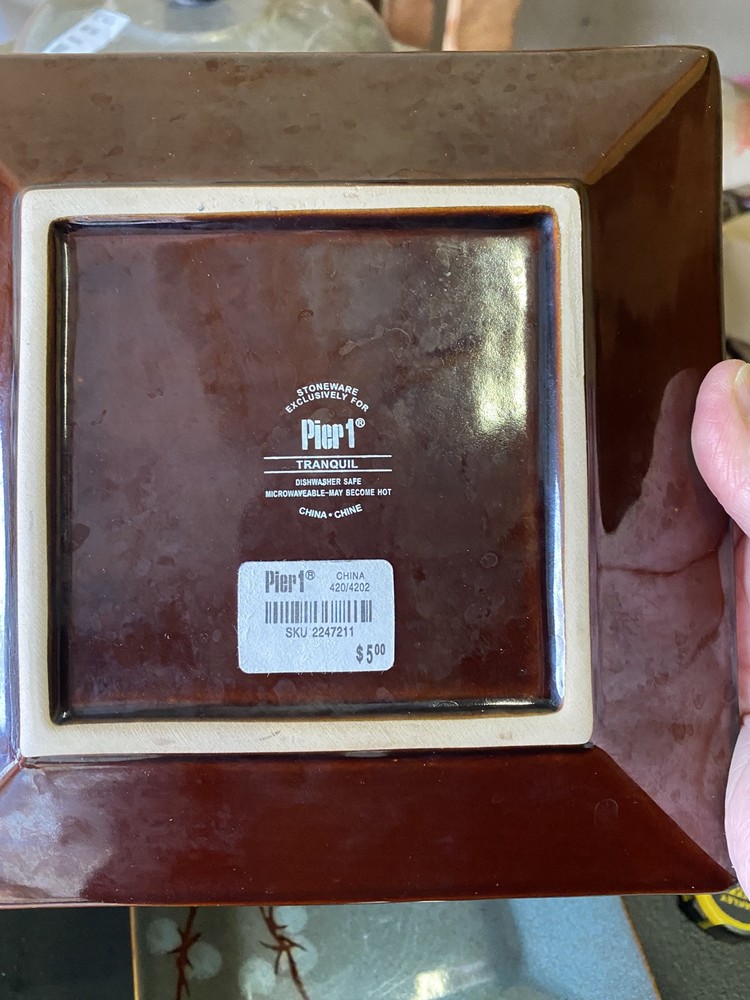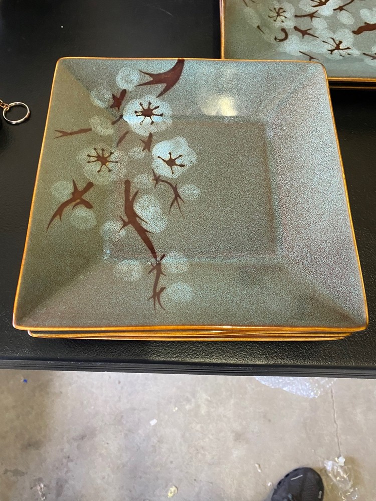 This set includes four square salad plates from Pier 1's Tranquil collection, featuring a cherry blossom pattern on multicolored stoneware. The plates measure 8 3/8 inches and have a contemporary style with a glossy finish, making them suitable for all occasions. Produced in China in the 21st century, these original pieces showcase a flower theme in a modern art pottery production style.