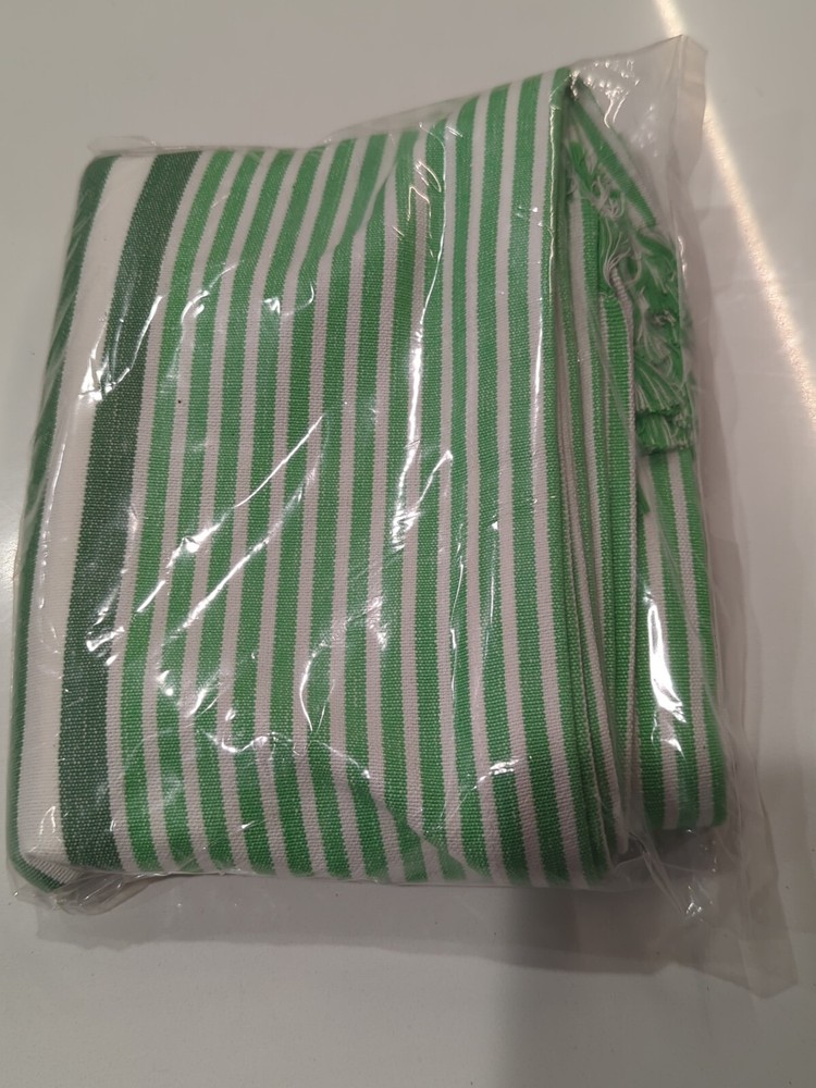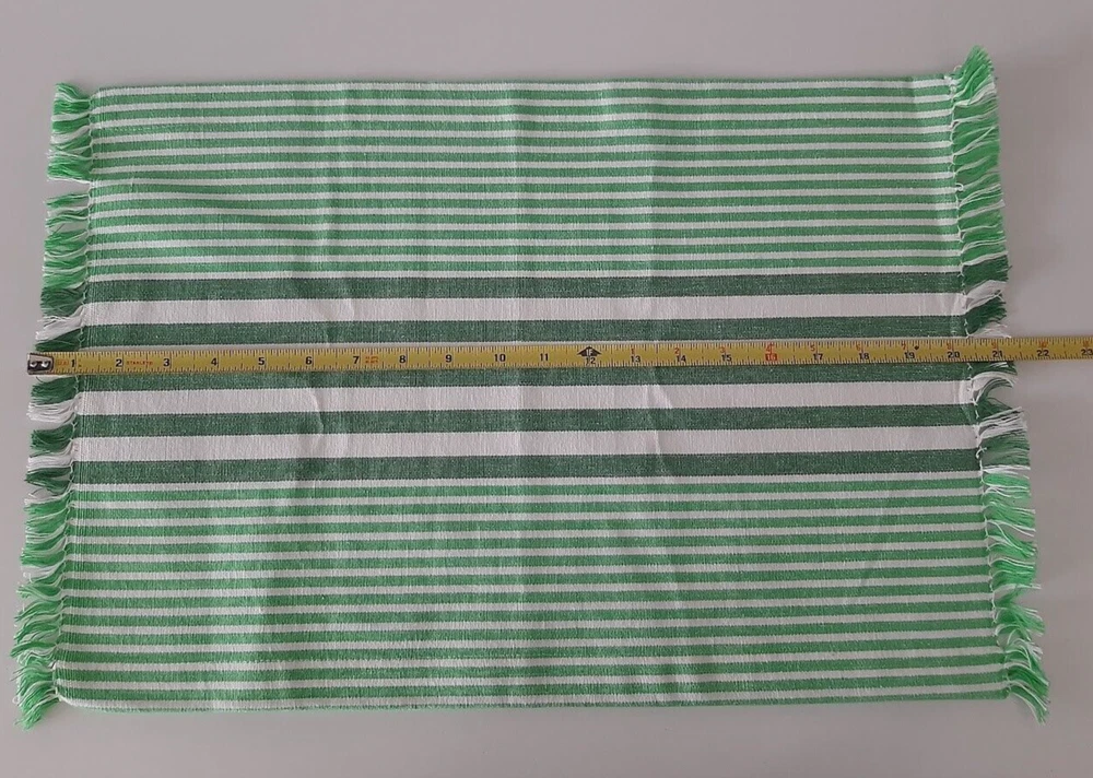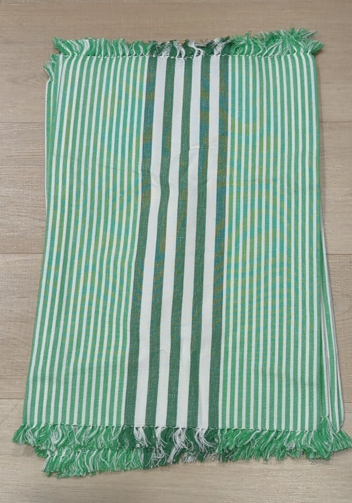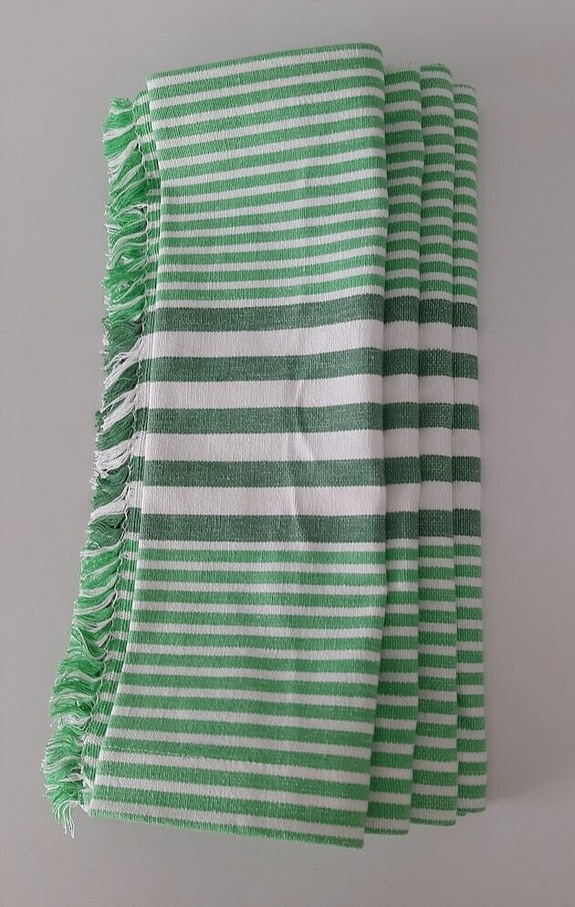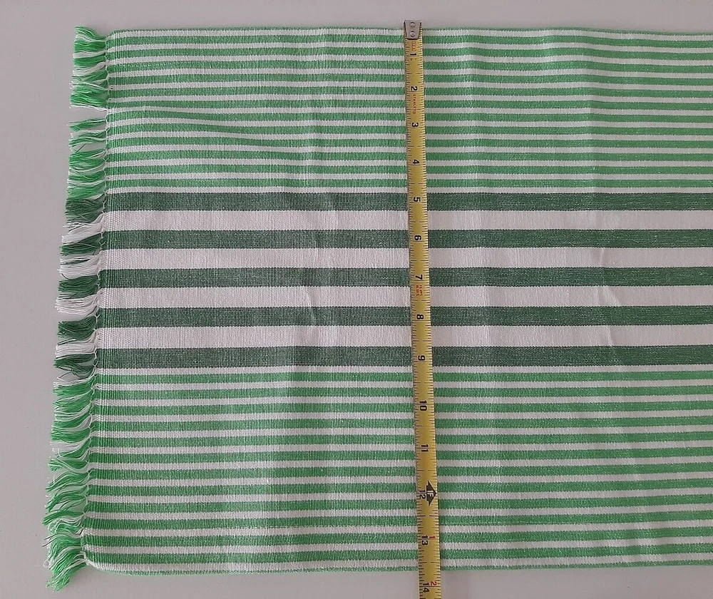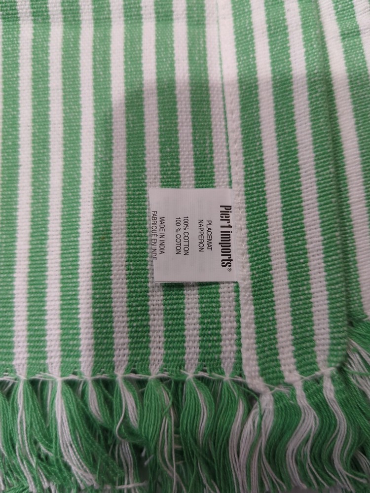Set of 4 Heavy duty 100% cotton Pier 1 imports Placemats Green and white stripes with fringe These placemats are a great basic to dress up into a formal meal, or for something casual. Easily adds texture and visual interest to any table. DII offers delightful Kitchen Linens including dishtowels, dish cloths, aprons, potholders and oven mitts. Dimensions: 19"W x 13"D x 0.2"H Reinforced edges Green and white fringe Material: 100% Cotton From a smoke free pet free home. Perfect for a gift!! Machine wash Made in India