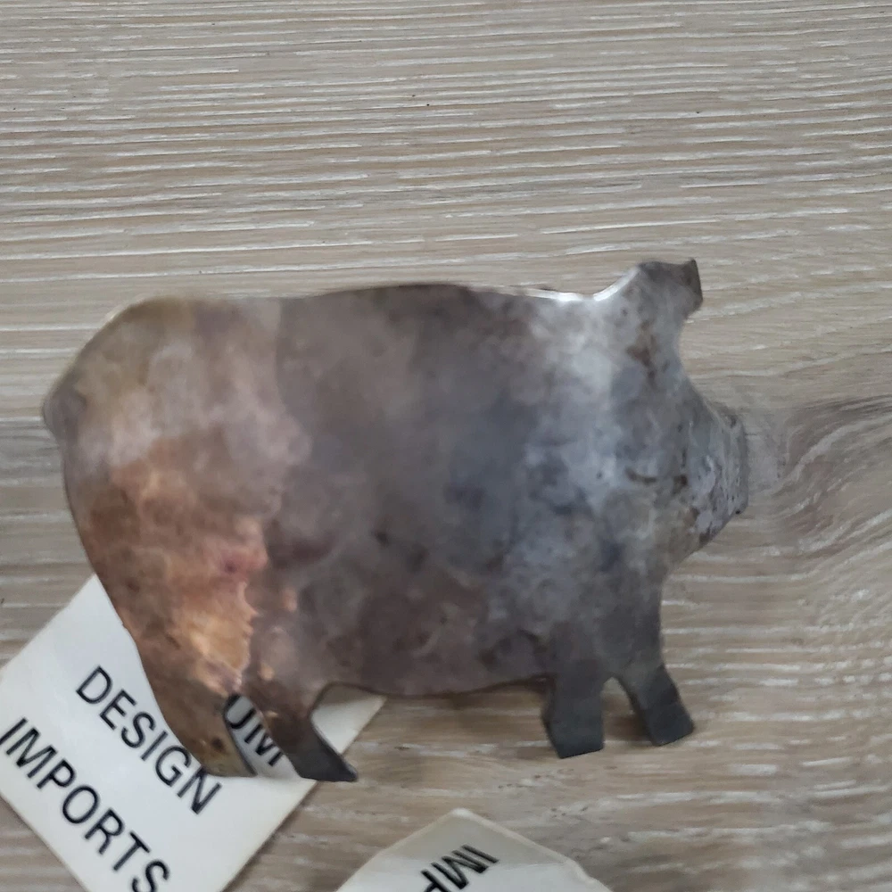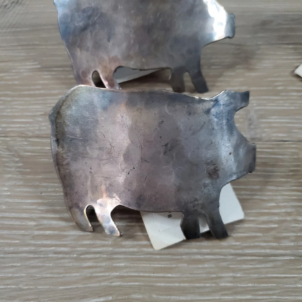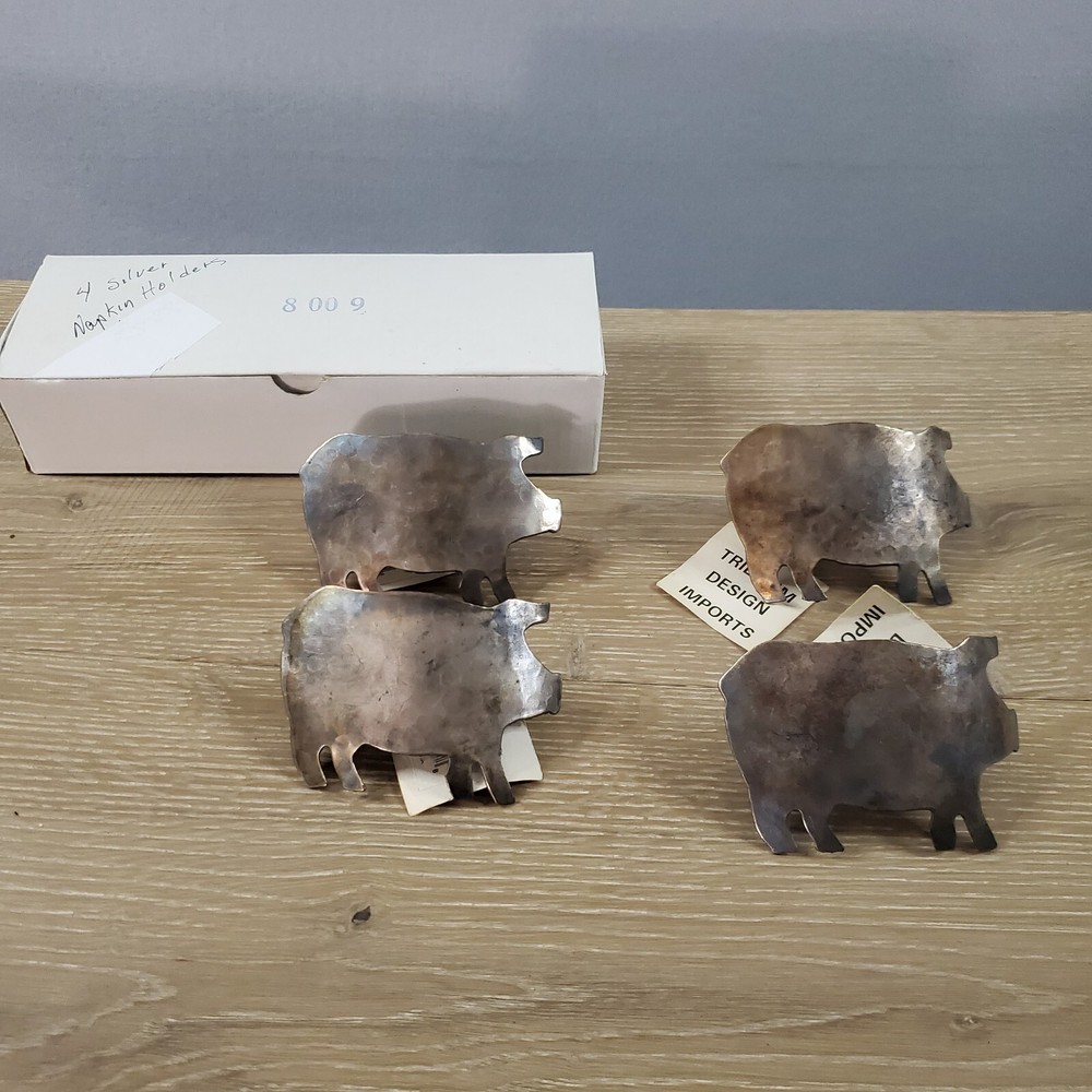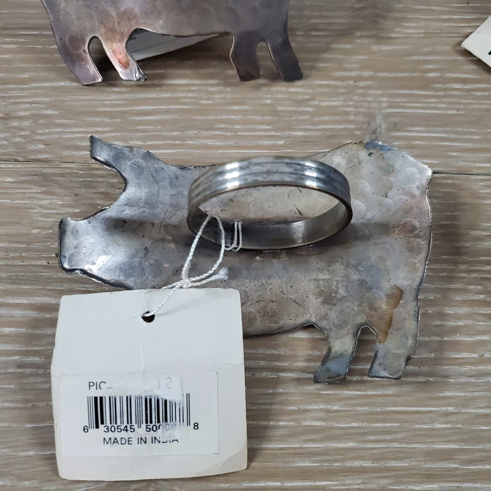 Add a touch of whimsy to your table setting with this set of 4 Trillium Design Imports Metal Hammered Pig Napkin Rings. Crafted in India from durable metal, each napkin ring features a charming pig design with a hammered texture. The silver color and intricate pattern make these napkin rings suitable for a variety of occasions such as Easter, Christmas, and even Mother's Day. Measuring 3.5 X 2 .5 inches, these napkin rings are perfect for adding a touch of personality to your dining experience.