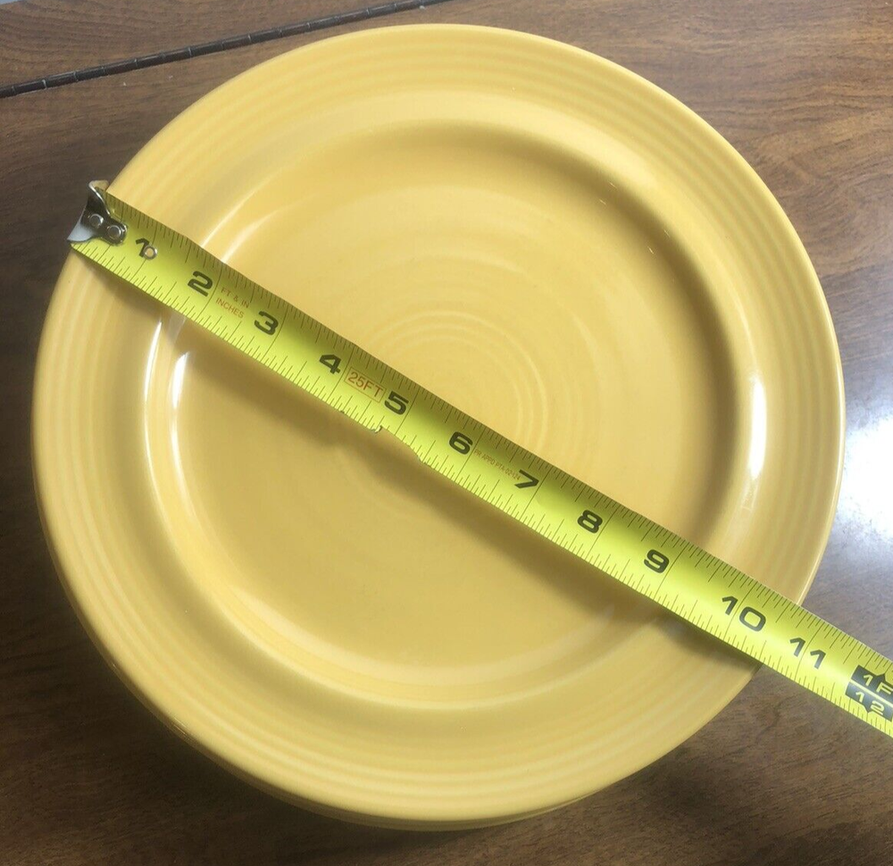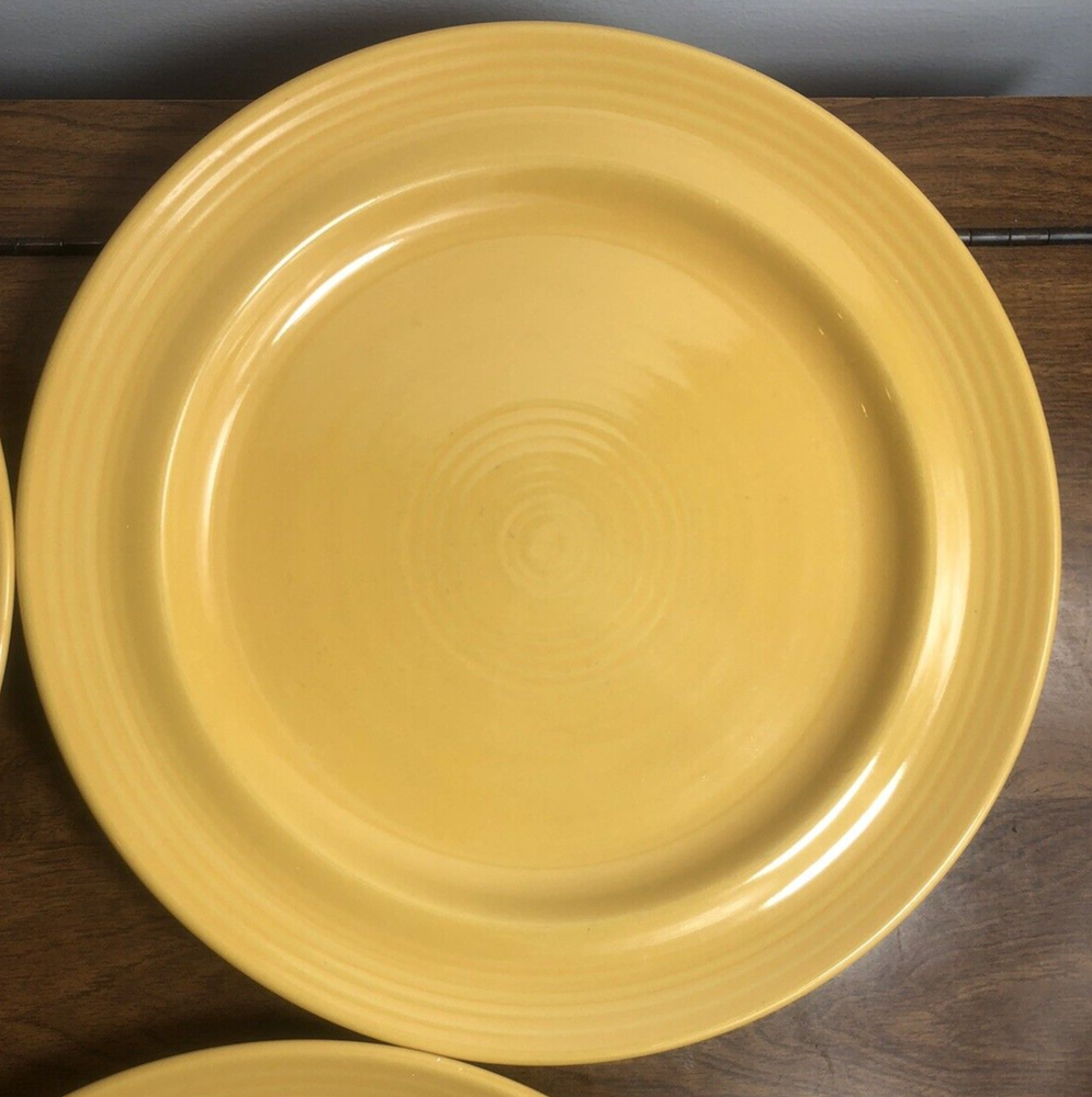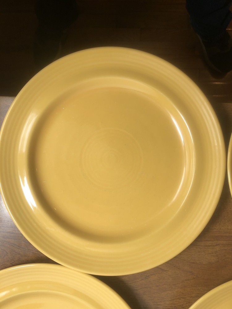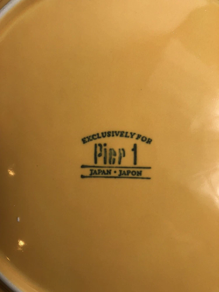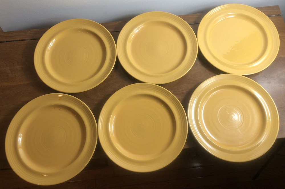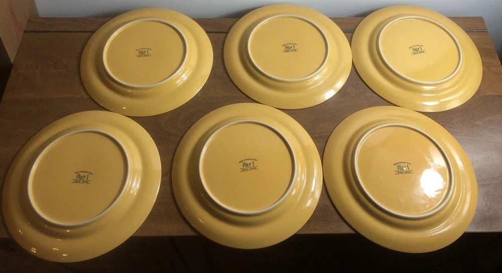 This is a set of six Pier 1 dinner plates from Japan, featuring a round shape with a ridged rim. They are made of yellow stoneware and measure 10 5/8 inches in diameter. They appear in excellent condition; I include a close photo of each plate so you can inspect for condition.