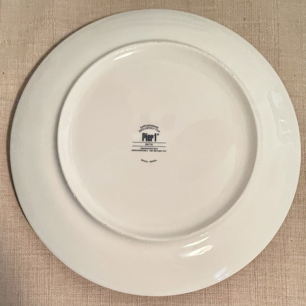Set of six Pier 1 Blue Batik Salad/Dessert Plates. 8.25" Whether you're hosting a casual brunch or a festive dinner, these plates are sure to impress. Made in Brazil, these plates feature a timeless design that fits seamlessly into any occasion. They are in excellent condition and two of the plates still have the original sticker on them. Buy with confidence as I have 100% positive feedback. Please see my other listings. Always happy to combine shipping to save you $$$.