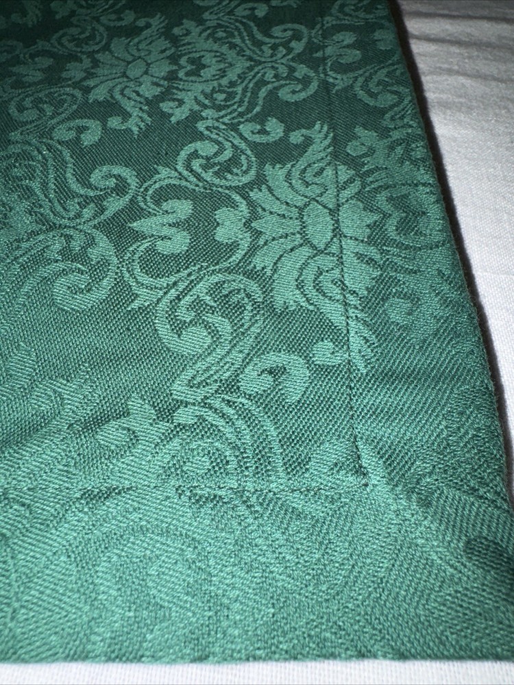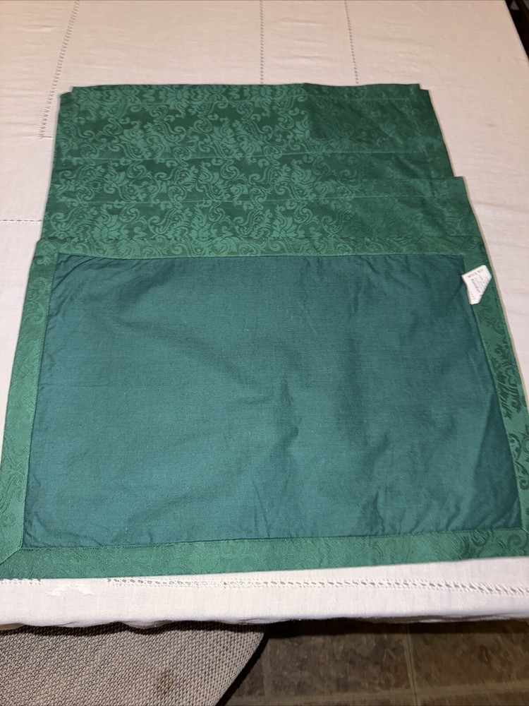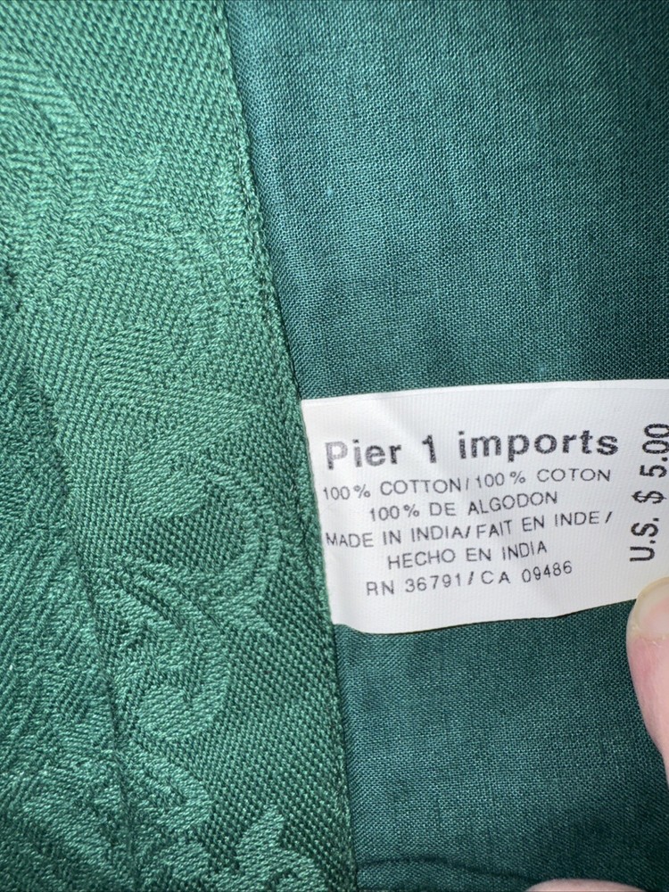 Add a touch of elegance to your dining table with this set of 6 Pier 1 Imports green cotton blend placemats. The rectangular placemats measure 13x19 inches and feature a beautiful damask pattern that is perfect for any occasion. Made from high-quality cotton blend material, these placemats are both durable and machine washable for easy maintenance. Pre-owned but in great condition.