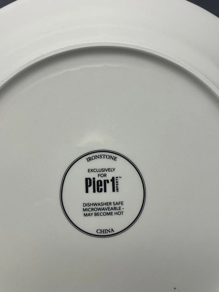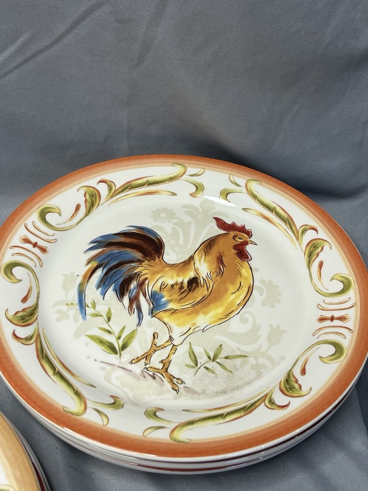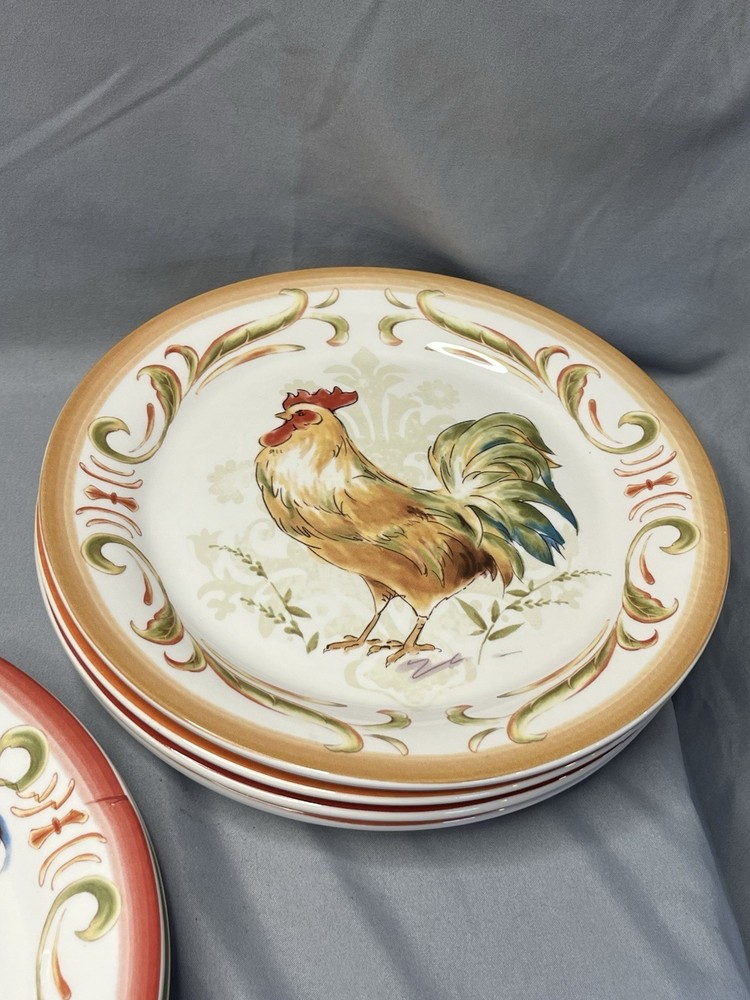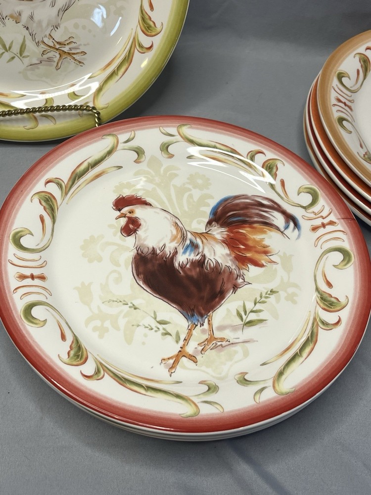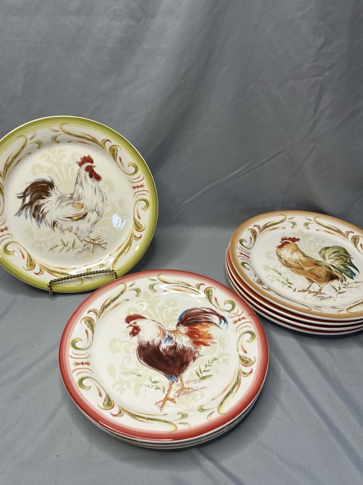 The product is a set of 8 Pier 1 Imports Rooster Chicken Luncheon Plates measuring 8.75 inches in diameter. Each plate features a different design of roosters, showcasing a colorful and decorative collection for all occasions. Made of ceramic with a glossy finish, these round plates are dishwasher safe for convenient cleaning and maintenance. The printed backstamp indicates the quality and tradition of Pier 1 Imports, originating from China. This set would be a charming addition to any kitchen or dining room, adding a touch of whimsy and sophistication to meals served on these stylish plates