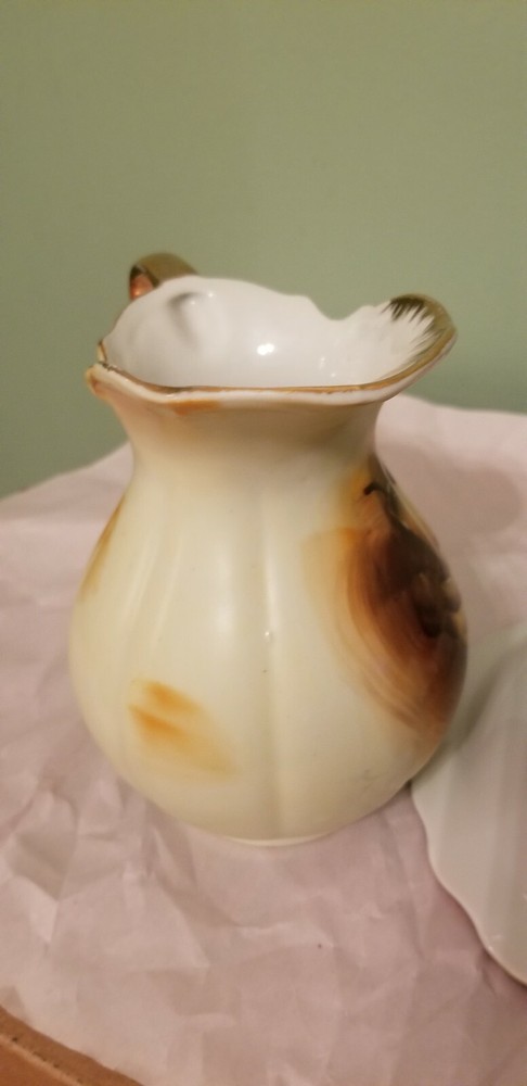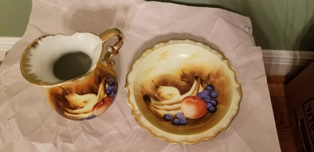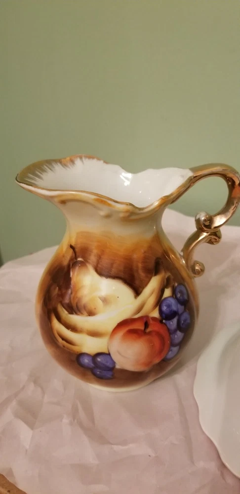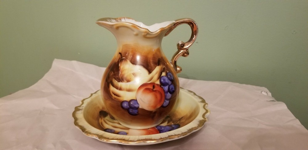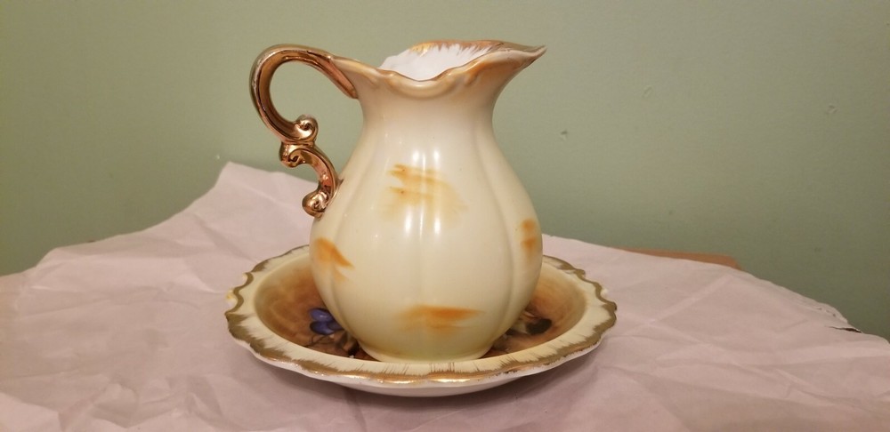 Preowned Beautiful set of Enesco Imports Japan, small Pitcher and Bowl in Fruits hand painted, Gold rimmed. In very good condition, no cracks, no chips and no damage. Please see and zoom pictures for more details. Shipped 3 to 5 business days with USPS