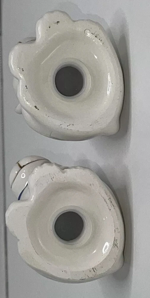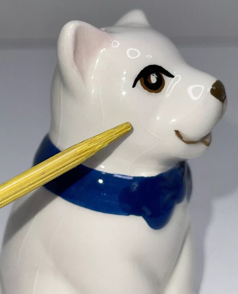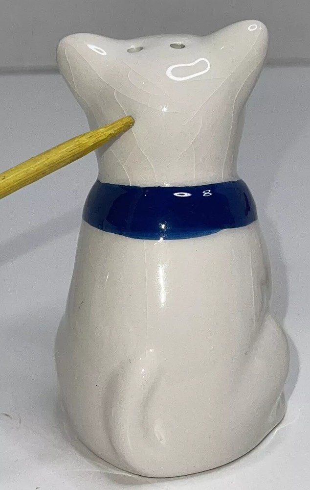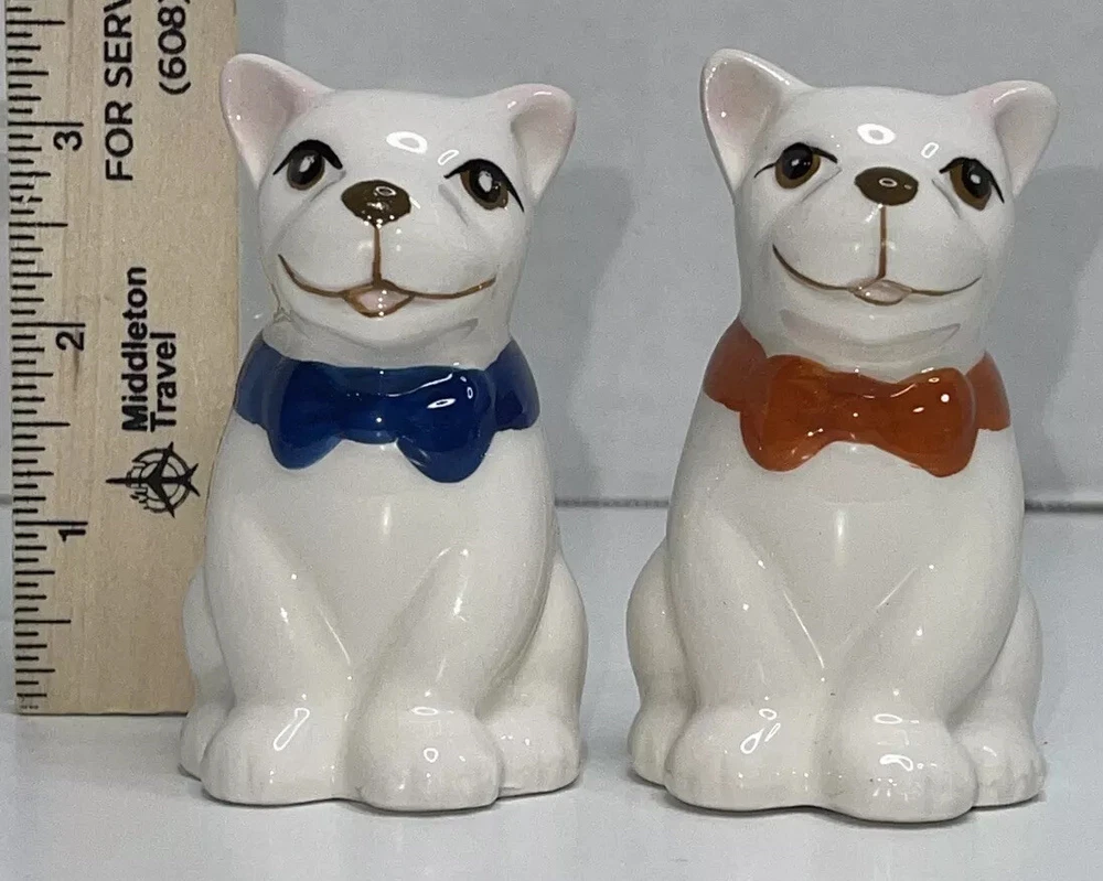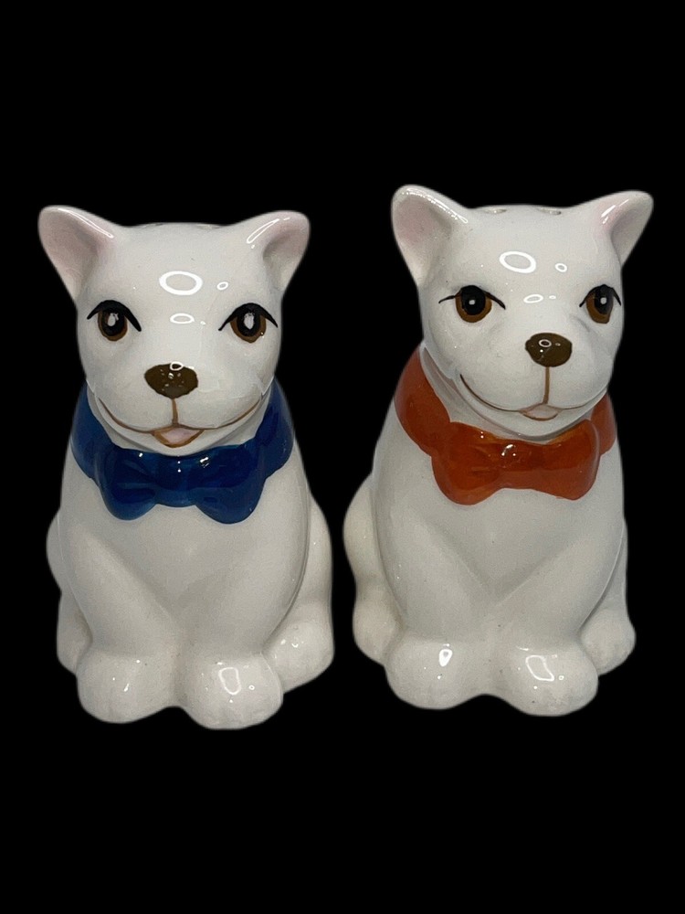 Set of White Ceramic Bulldogs Sporting Red & Blue Bow ties Salt & Pepper Shakers. Used. Dog with blue bow tie has crazing. Sold as shown. See all photos because they are part of the description.