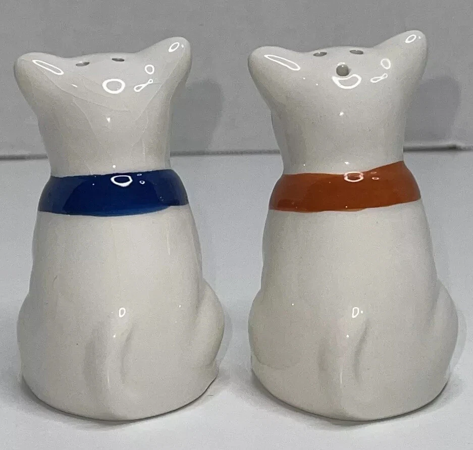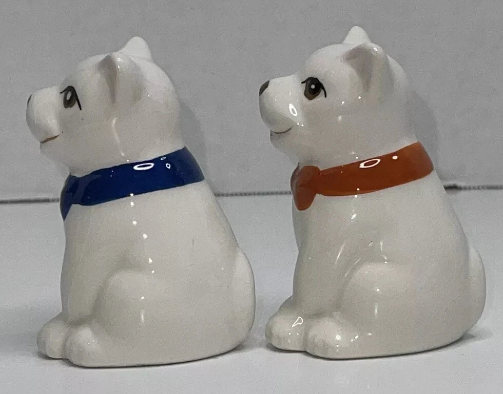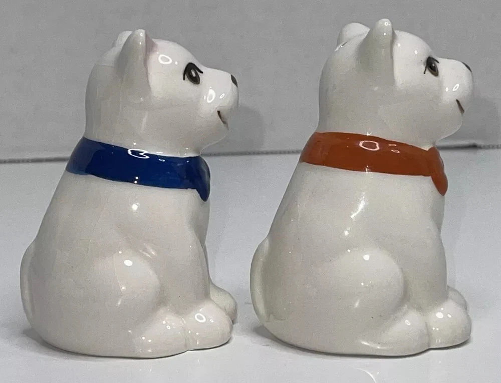 Set of White Ceramic Bulldogs Sporting Red & Blue Bow ties Salt & Pepper Shakers. Used. Dog with blue bow tie has crazing. Sold as shown. See all photos because they are part of the description....