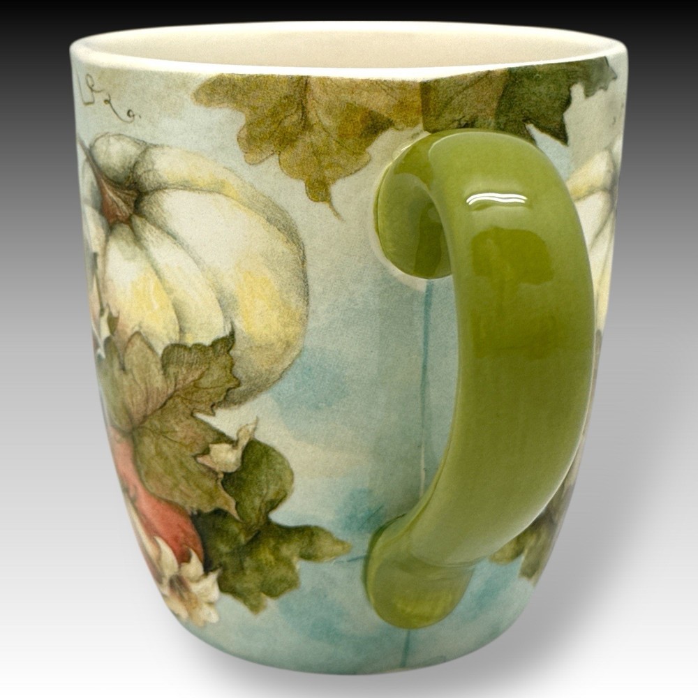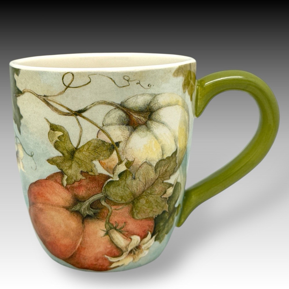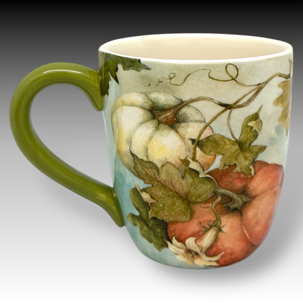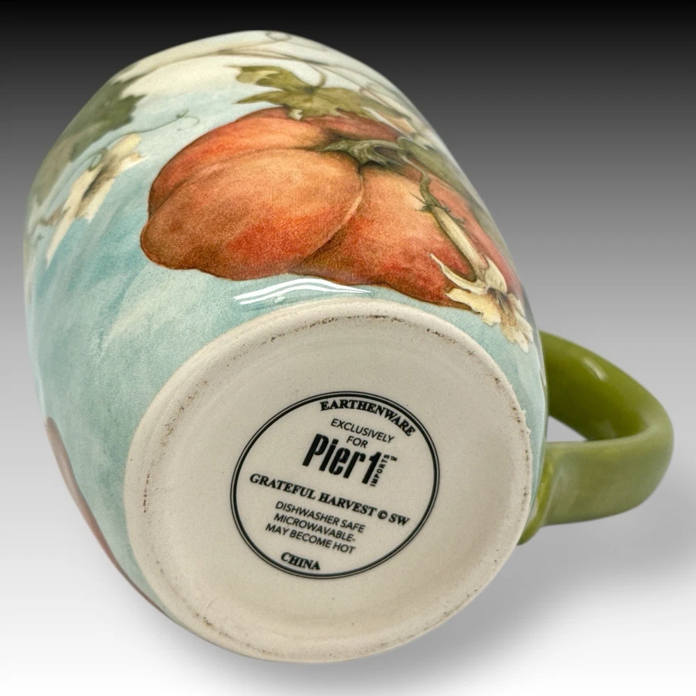 Set of 2 Pier 1 Grateful Harvest Pumpkin Coffee Mugs – Autumn Botanical Design Bring cozy fall charm to your table with this beautifully illustrated set of Pier 1 “Grateful Harvest” pumpkin mugs. Crafted from earthenware and designed exclusively for Pier 1 Imports, each mug features a richly detailed wraparound print of heirloom pumpkins, curling vines, and white blossoms in soft watercolor tones, paired with a glossy olive green handle . Ideal for enjoying hot beverages throughout the harvest season or adding a warm touch to rustic fall displays. These mugs are microwaveable and dishwasher safe, with each measuring approximately 6.00" L x 4.00" W x 4.25" H and a combined weight of 1 lbs 8.3 oz . The interior is a smooth ivory glaze, offering a clean and inviting contrast to the nature-inspired exterior. Brand: Pier 1 Imports Pattern: Grateful Harvest Type: Coffee Mugs (Set of 2) Material: Earthenware Care: Dishwasher and microwave safe Dimensions (each): Approx. 6" x 4" x 4.25" Color Palette: Olive, ivory, burnt orange, sage, and sky blue Condition: Excellent pre-owned condition with no chips, cracks, or stains. All four mugs are clean and glossy, with crisp pattern details and minor surface wear consistent with gentle use. This set was acquired at an estate sale in Montgomery County, Pennsylvania. At AtopTheTables, we take pride in offering a thoughtfully curated selection of vintage, collectible, and unique items. With years of experience and thousands of positive feedback comments from happy buyers, we are known for our careful packaging and attention to detail—especially when it comes to delicate and breakable pieces. Every item is handled with care to ensure it arrives safely and exactly as described. Please feel free to message us with any questions—we’re always happy to help!