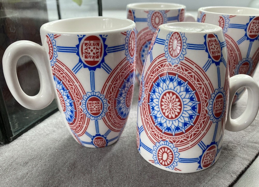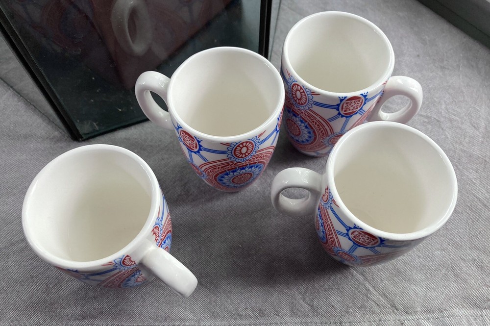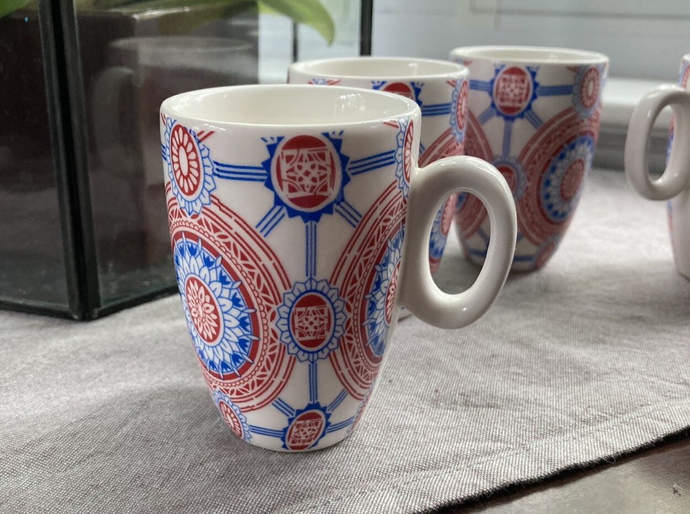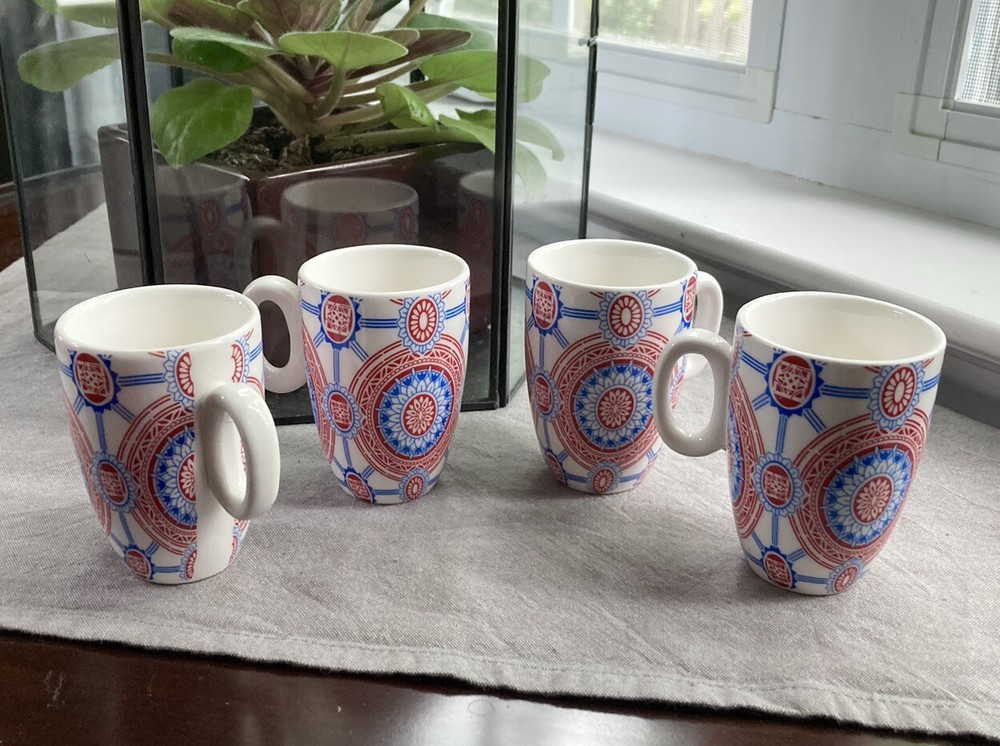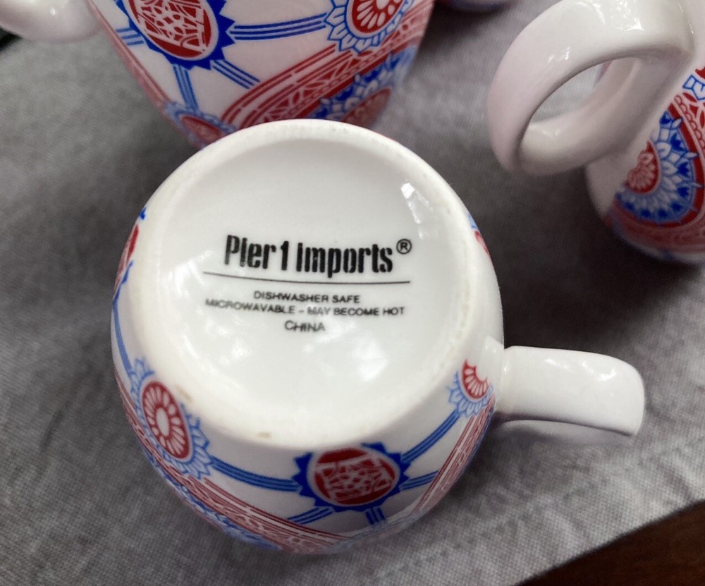 Pier 1 Imports - Set of four Espresso Cups / Demitasse Cups / Mini Mugs. These have a beautifully applied, delicate Blue & Red Stylized Floral Design on a white base DETAILS : Made of porcelain Exclusively from Pier 1 Imports Holds approximately 3 fluid ounces Size: approximately 3” tall x 2” wide No chips, cracks or crazing Dishwasher and microwave safe. I had these on display, but I don't remember actually using them. Excellent condition. From a smoke-free, healthy home. [460]