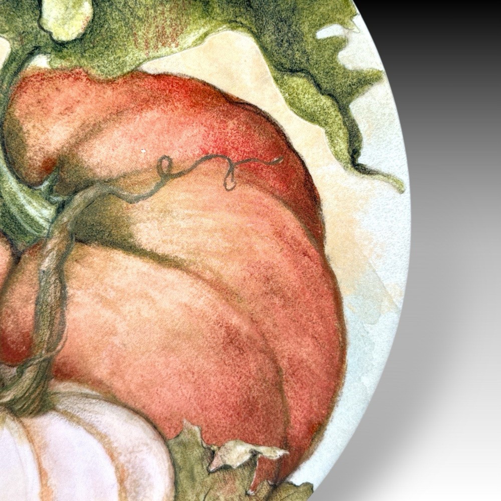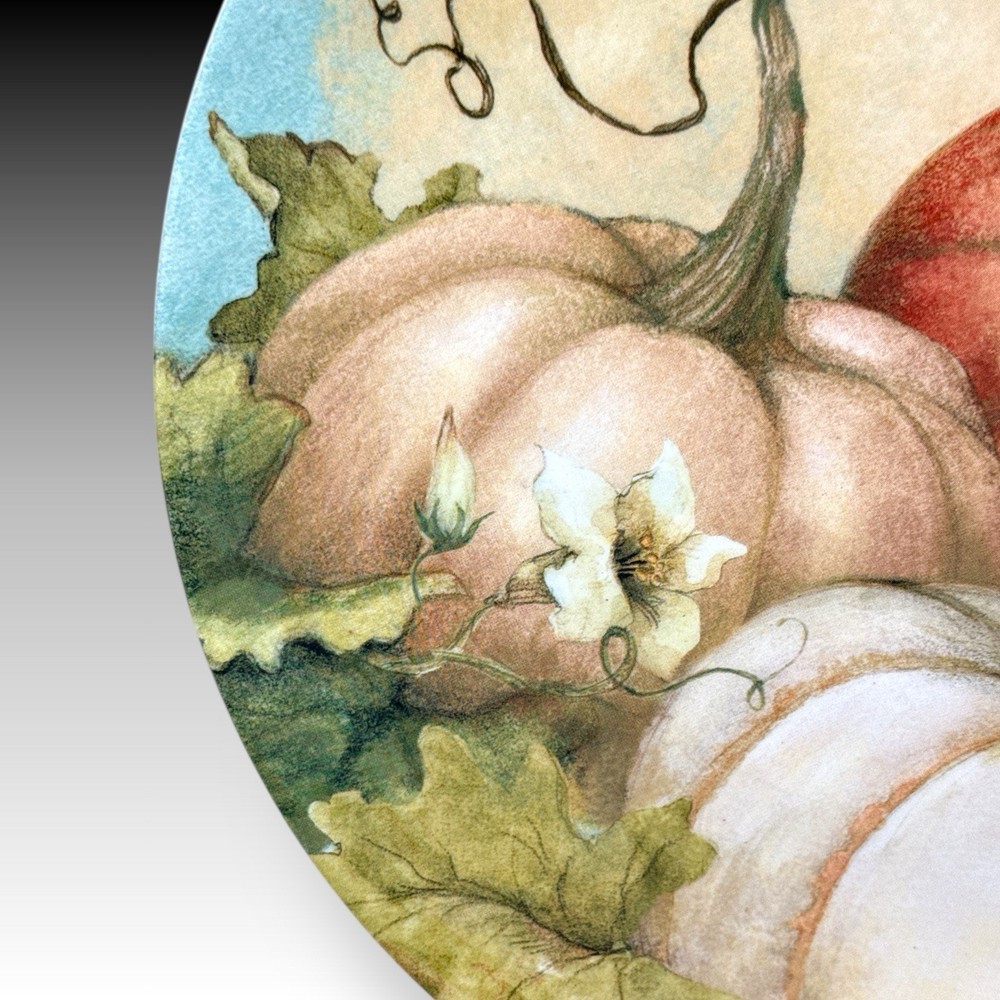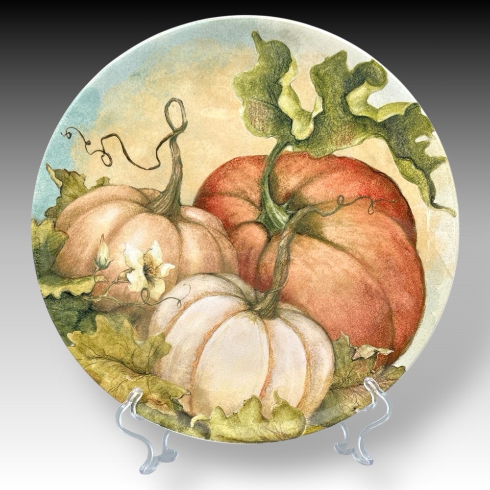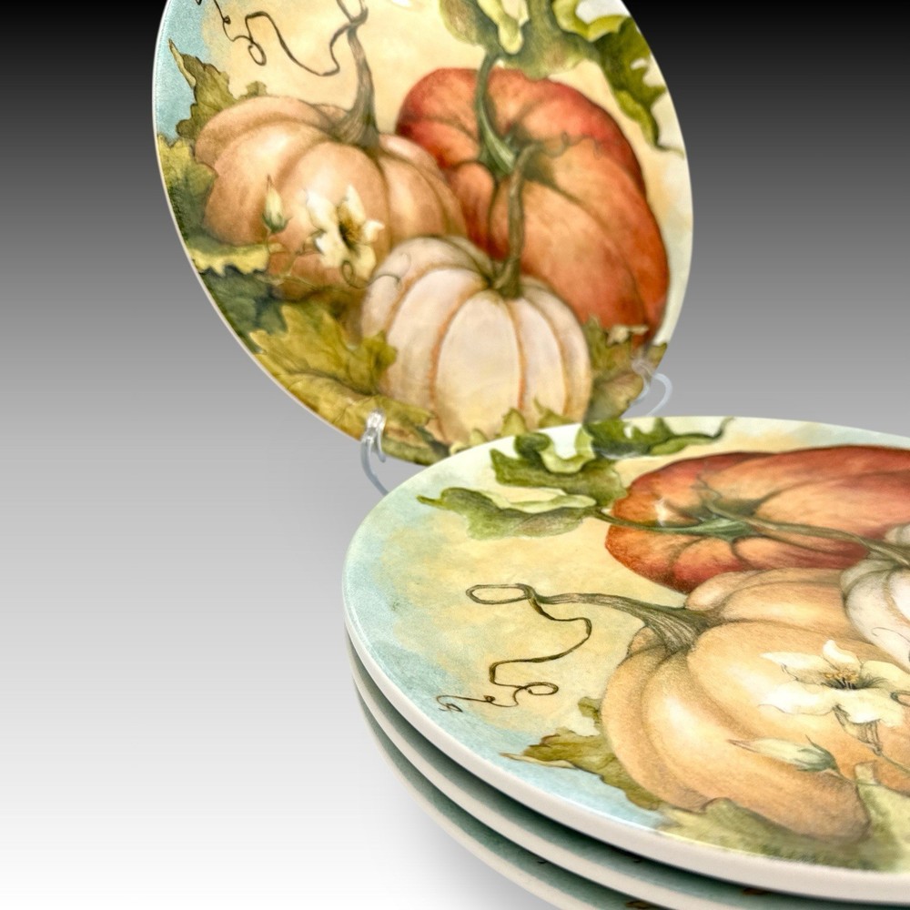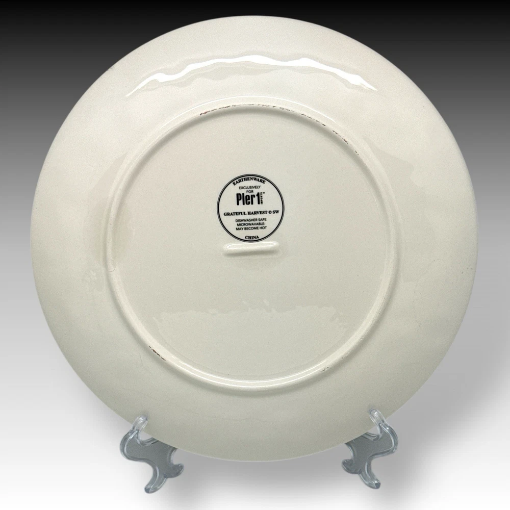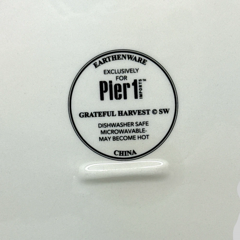 Set of 4 Pier 1 Grateful Harvest Dinner Plates – 11.25" Diameter Celebrate the cozy charm of fall with this set of four dinner plates from Pier 1's retired Grateful Harvest collection. Each plate features a stunning watercolor-style illustration of plump pumpkins and curling vines in rich autumn tones—perfect for seasonal entertaining or harvest-themed displays. These pieces were originally sold exclusively by Pier 1 and have since become a favorite among collectors for their vibrant artistry and seasonal warmth. Specs: Brand: Pier 1 Imports (Exclusive Design) Pattern: Grateful Harvest Type: Dinner Plates Quantity: 4 Diameter: 11.25 inches Weight: 7 lb 11.5 oz (set total) Material: Earthenware Care: Dishwasher Safe (may become hot) Condition: Three plates are in excellent vintage condition with no signs of use, wear, or damage. One plate shows slight glaze discoloration on the back , likely due to moisture penetration during storage (see close-up photo). This is not visible from the front and does not affect functionality or display appeal. This set was acquired at an estate sale in Montgomery County, Pennsylvania. At AtopTheTables, we take pride in offering a thoughtfully curated selection of vintage, collectible, and unique items. With years of experience and thousands of positive feedback comments from happy buyers, we are known for our careful packaging and attention to detail—especially when it comes to delicate and breakable pieces. Every item is handled with care to ensure it arrives safely and exactly as described. Please feel free to message us with any questions—we’re always happy to help!
