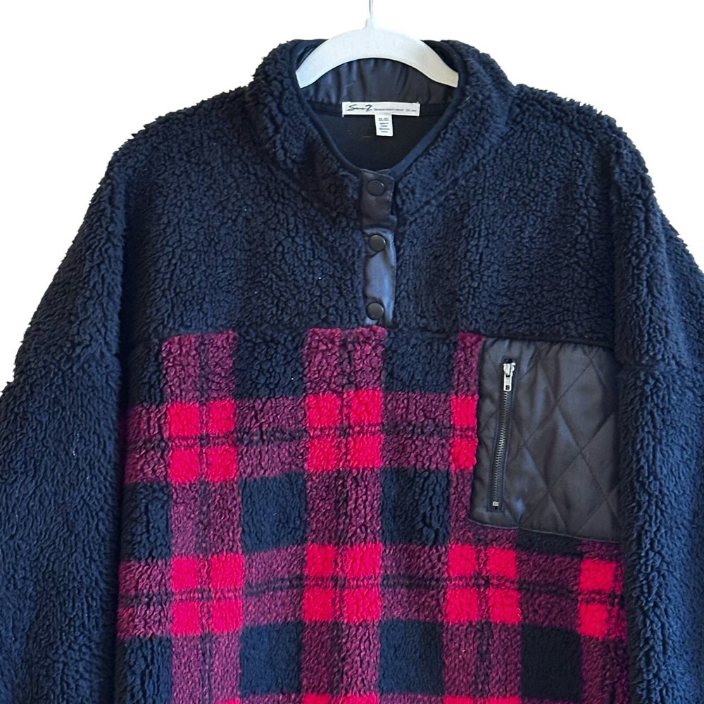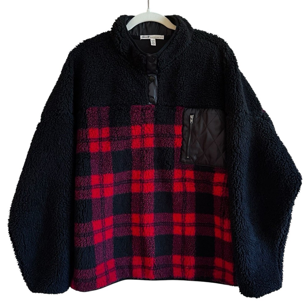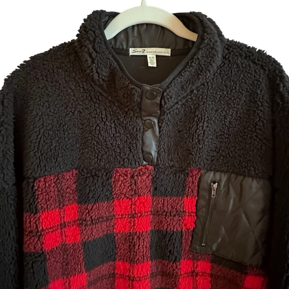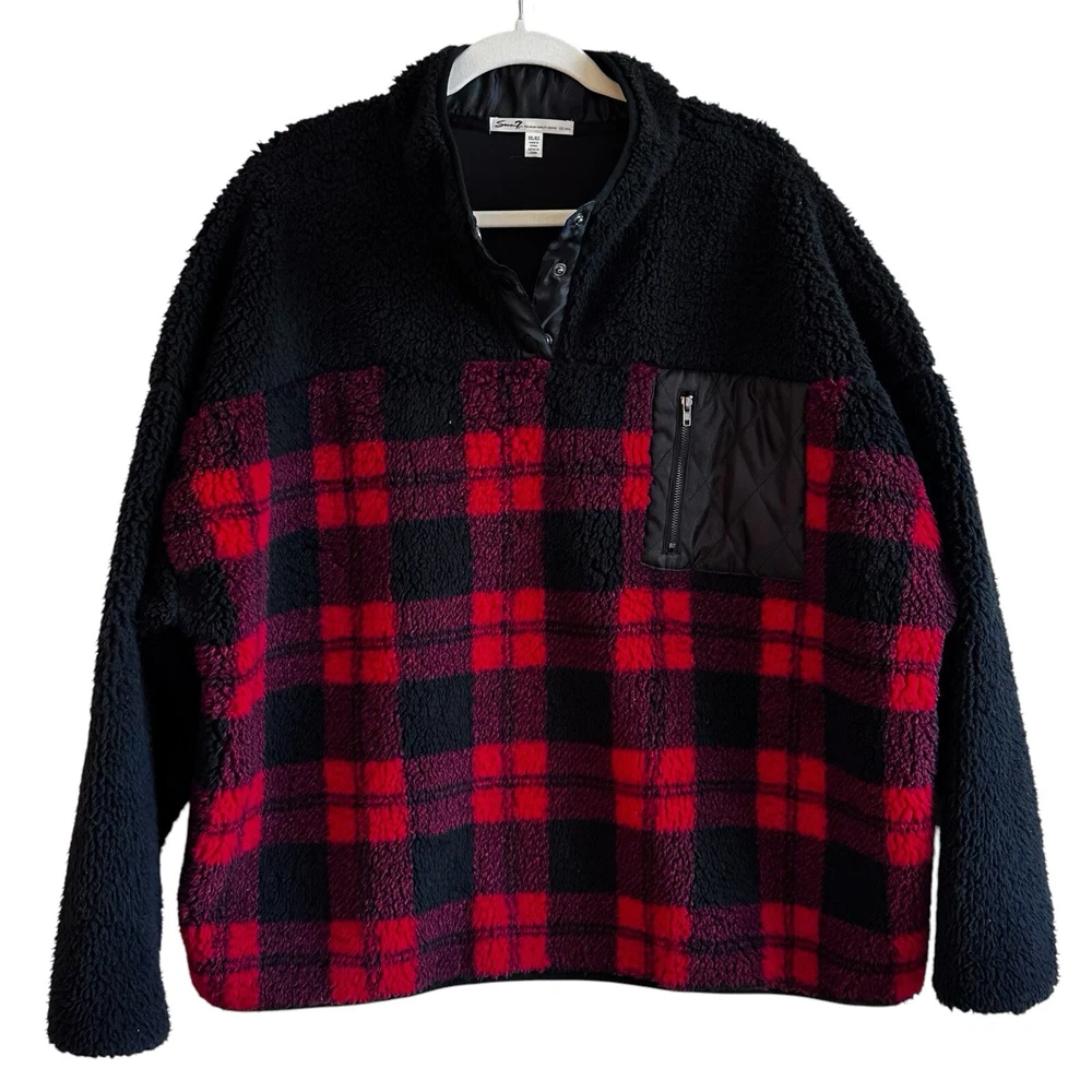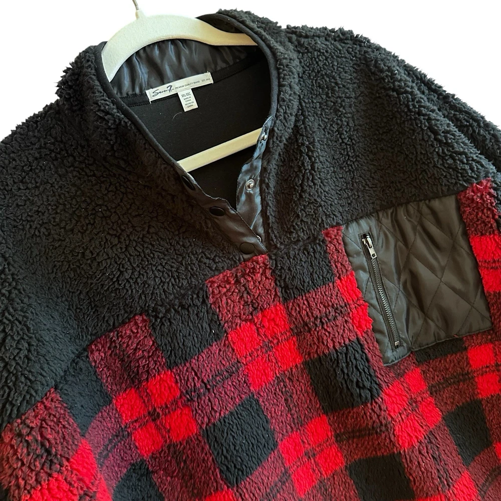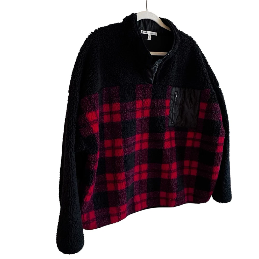 Seven Red and Black Plaid Tartan Sherpa Fleece Pullover Sweatshirt. Size: XXL Approximate measurements: — Underarm to underarm (flat lay): 29” — Waist (flat lay): 25” — Length (back of neck to hem): 26” Front 3 snap closure - Front chest quilted satin zipper pocket - Cozy / Comfort / Holiday / Christmas / Winter aesthetics 100% POLYESTER MACHINE WASH COLD - See photos for fabric content and garment care labels Condition is excellent, very gently preowned. No tears, rips, snags, stains, or discoloration.