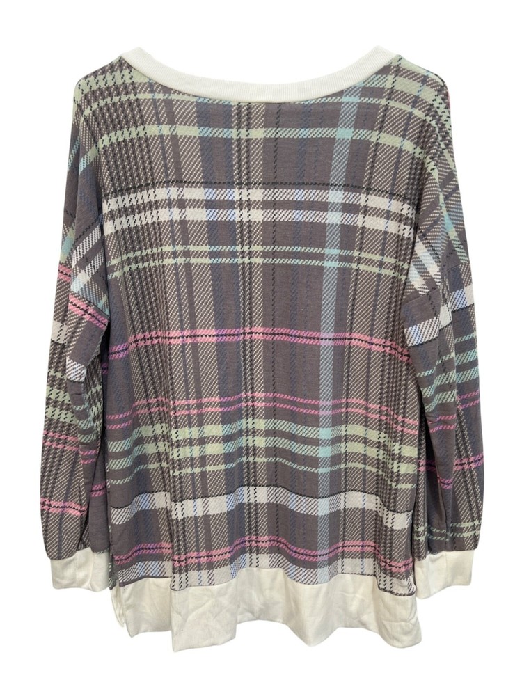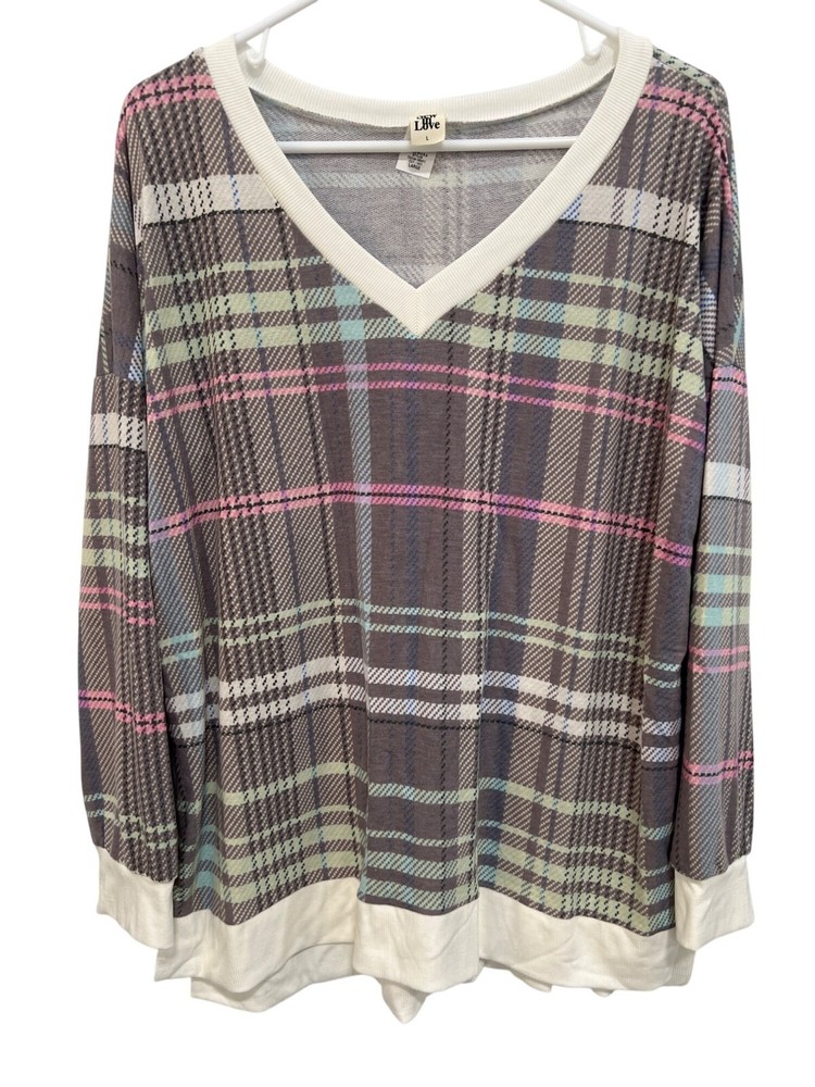Sew In Love Plaid V Neck Pullover Shirt Size Large Gray Pink Comfort Preppy Cozy This plaid V-neck long sleeve top by Sew In Love offers a stylish and comfortable fit. Crafted from a durable polyester and rayon blend, the top features a classic design and versatile colors, making it suitable for various occasions. • Long sleeves • V-neckline • Plaid pattern • Ribbed trim • Side slits • Dropped shoulders • 63% Polyester 34% Rayon 3% Spandex • Made in the USA • Lightweight fabric • Easy care instructions Length = 28 inches Chest = 25 inches plaid pullover casual classic comfortable relaxed fall winter warm knit cozy comfy loungewear everyday closet staple modern essentials daily