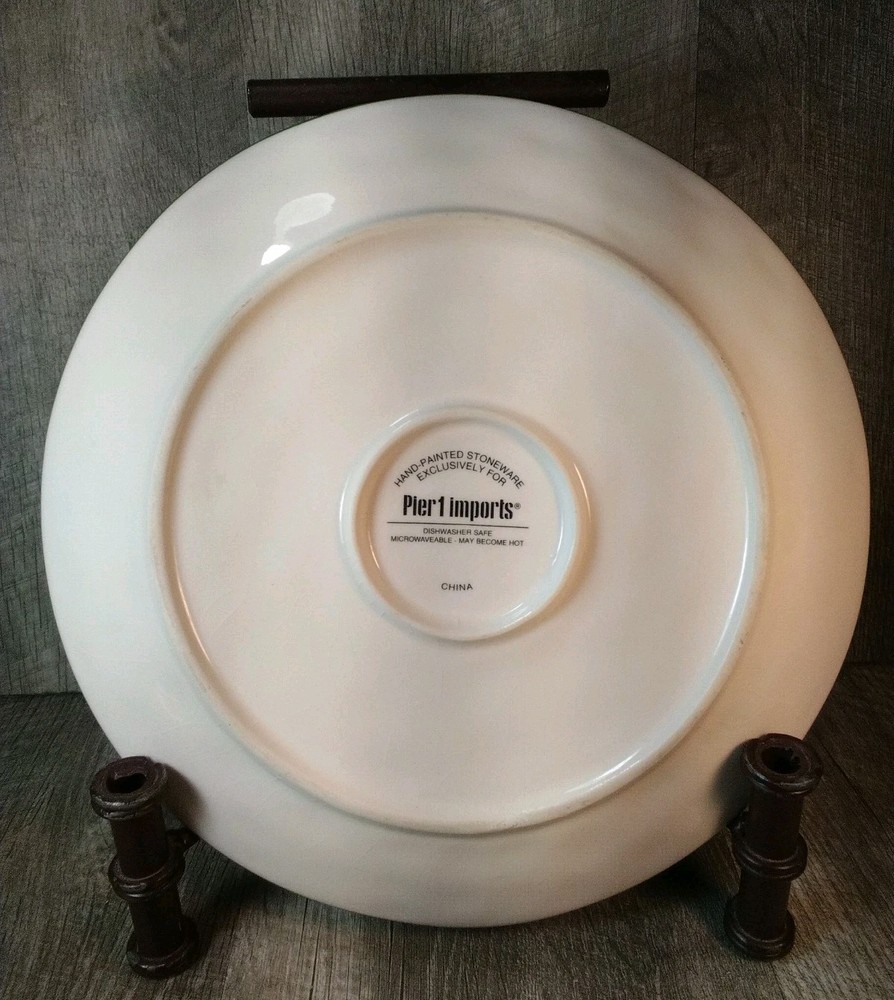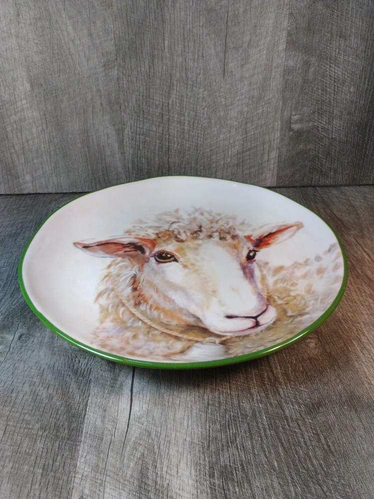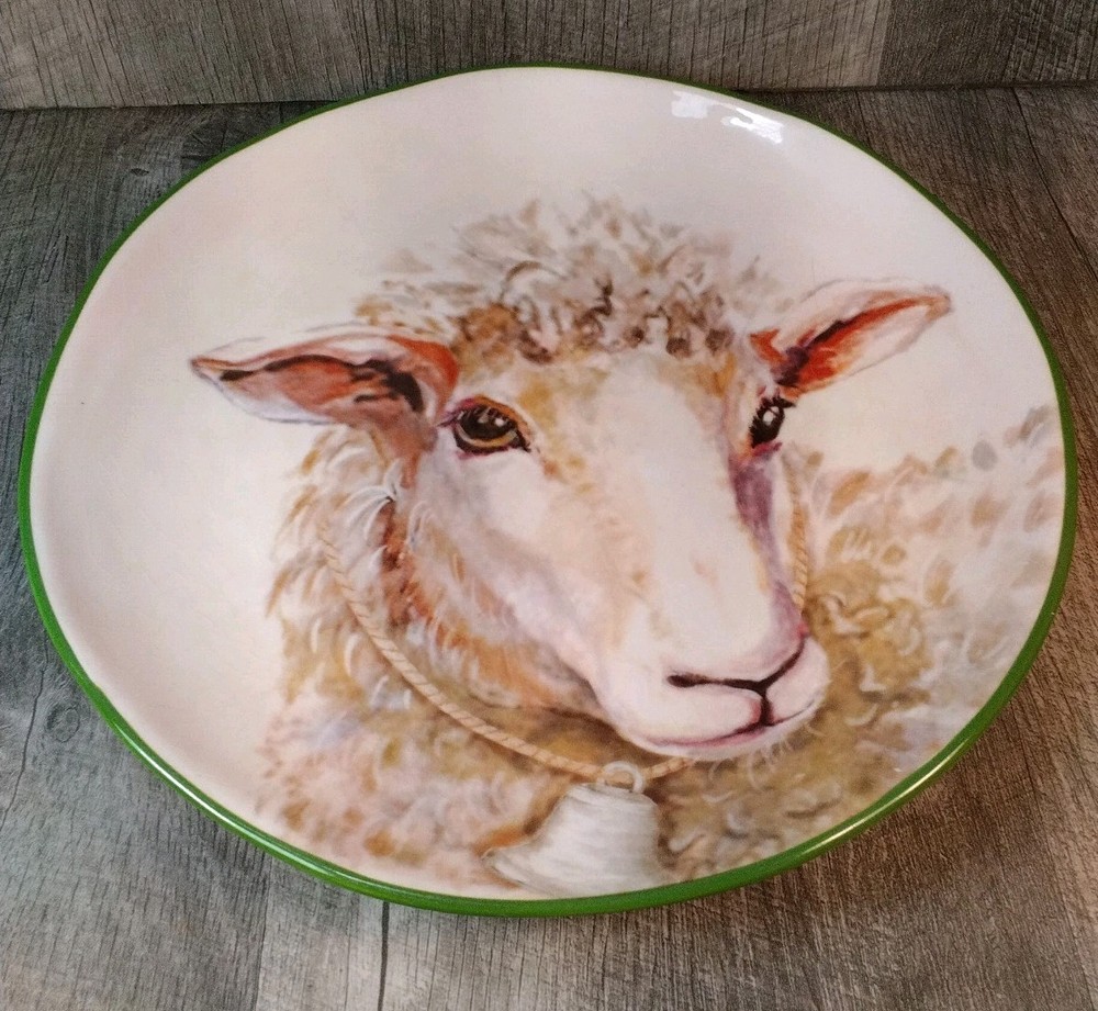 This unique salad plate from Pier 1 Imports features a charming farm animal design with sheep and lambs. The round stoneware plate measures 8.25 inches in diameter and is perfect for all occasions. The multi-color pattern is sure to add a touch of whimsy to your dining table. The plate is made in China and has a printed backstamp. It is dishwasher and microwave safe, making it a practical addition to your dinnerware collection. The item weighs 1 lb and comes with care instructions for machine washing up to 140°F. This piece is perfect for those who love farm-themed decor and want to add a touch of country to their home. This farm animal plate is super cute and in very nice condition with no chips or cracks. 6-5446