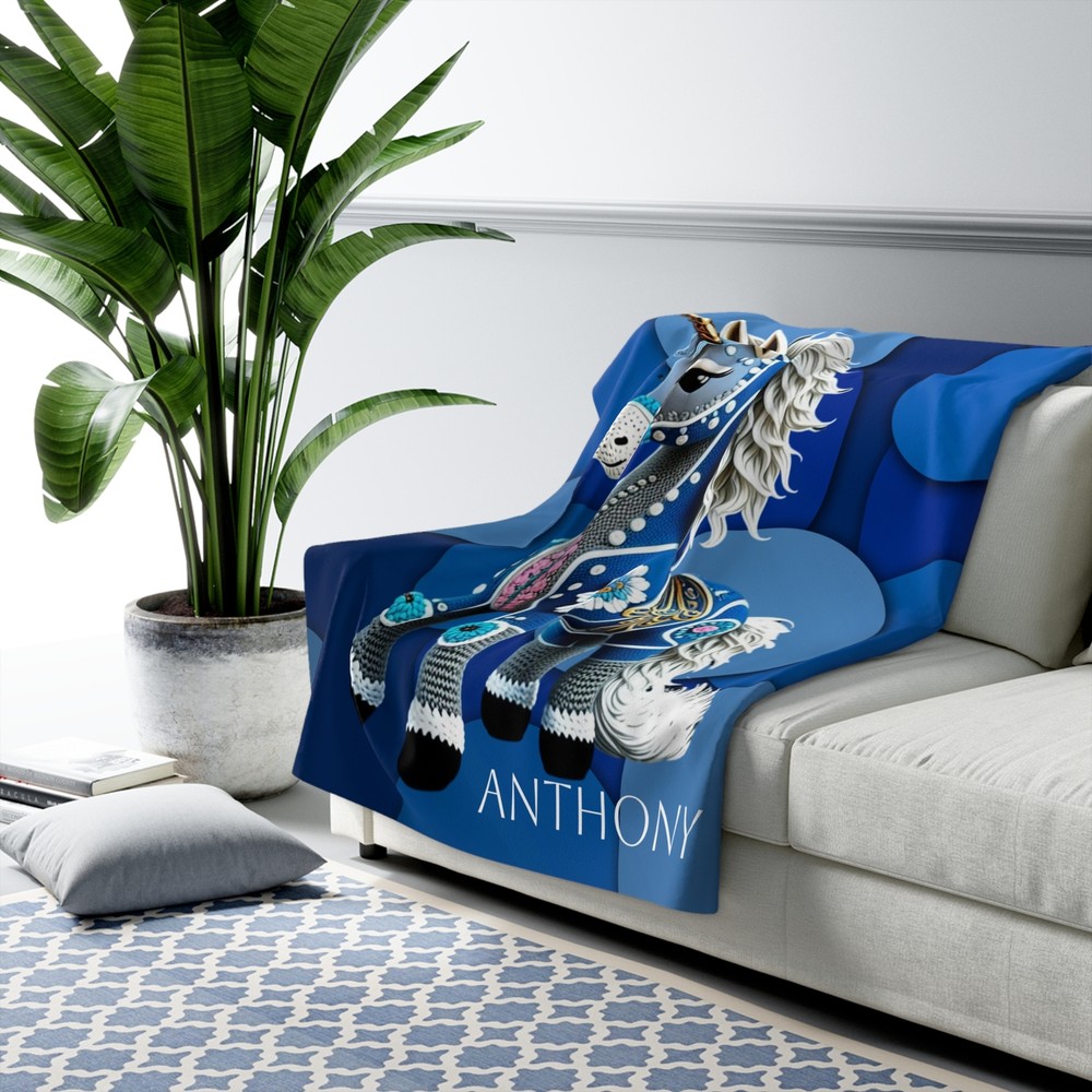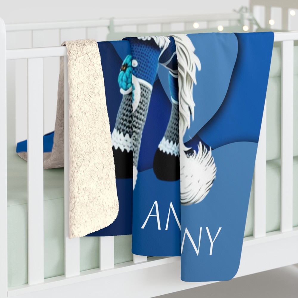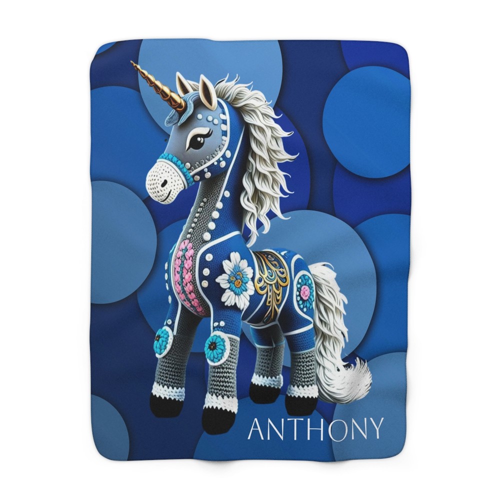 Feel the magic with this colorful blue unicorn crochet horse blanket featuring a geometric background. Perfect for adding a touch of whimsy and coziness to any living space. Ideal for unicorn lovers and those who appreciate unique and playful decor. Great for gifting on birthdays, holidays, or special occasions. Product features - Hemmed edges for durability - Sherpa fleece backside for extra coziness - Imported blanket fabric from China - Made with 100% polyester for warmth and softness - Available in 2 sizes Care instructions - Wash the item only cold machine wash with similar colors garments using a gentle cycle. Tumble dry on low settings or hang dry. Do not bleach or dry clean.