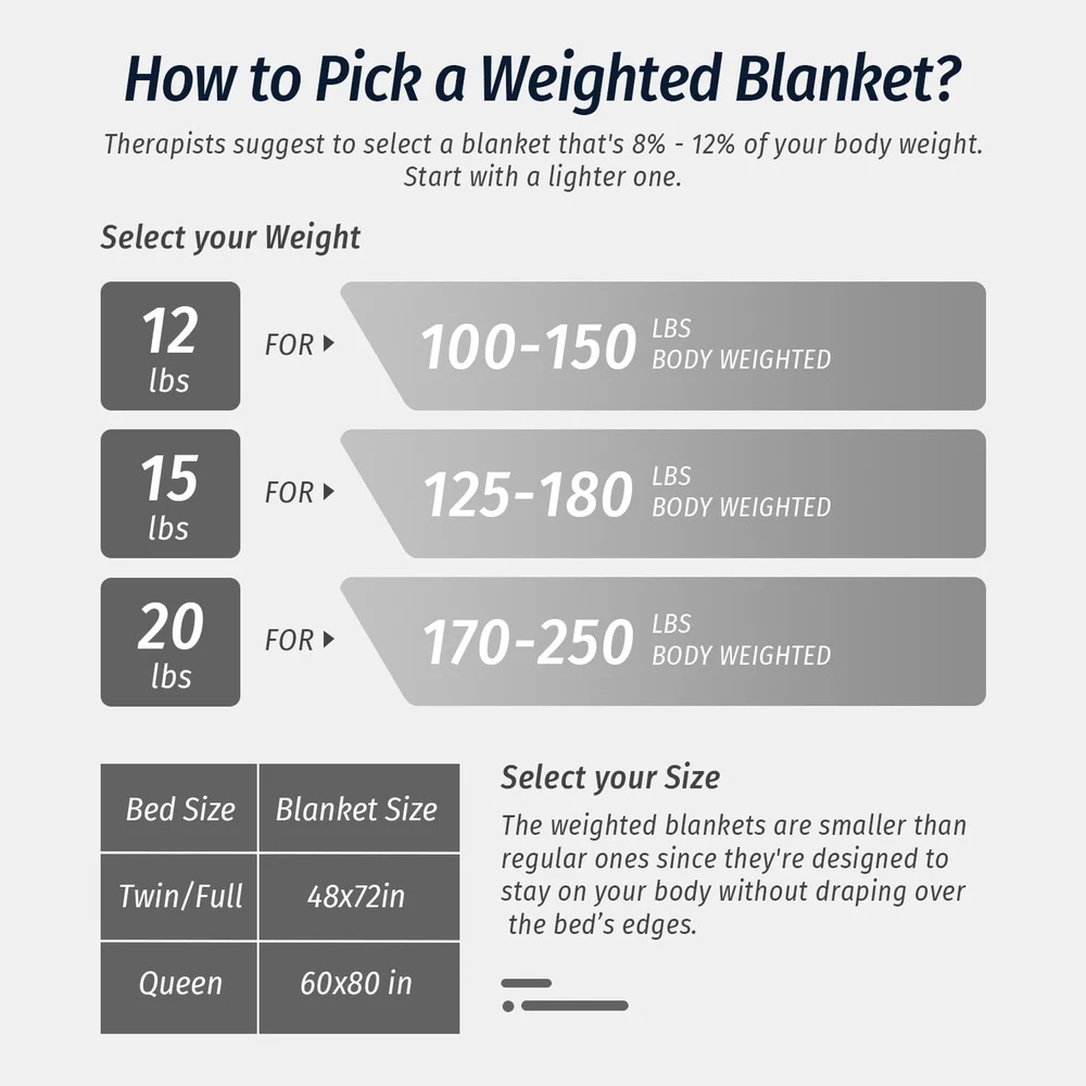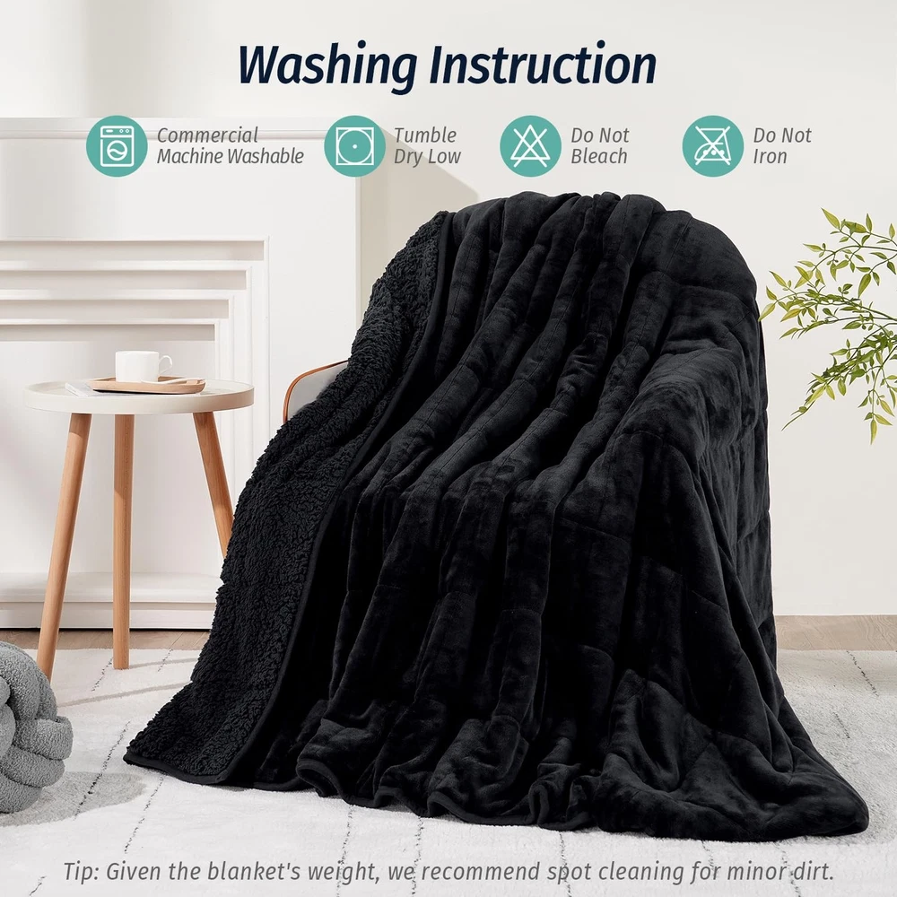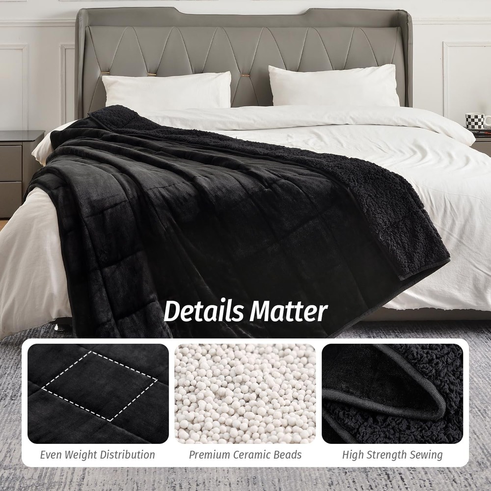Build a Sweet HomeDual Sherpa & Fleece SideCoziness is the key to bedclothes. The ultra-soft and fluffy Sherpa and fleece on the top and reverse instantly bring warmth and comfort to your rest. Premium Plush Material No shedding or pilling from long use with the fluff staying supple and smooth, so that your bed always looks neat and fresh.Elaborate StitchingQuality is in the detail. The blanket is sewn with an intricacy of 3 stitches per centimeter to keep every thread and element strong and right in its place. Premium Ceramic BeadsFor weighted blanket, the inside matters even more than the outside. It uses Premium Ceramic BeadsMore Than a Blanket Tucks you in and helps with sweet dreams in bedDoubles as a nice throw blanket on the couchKeeps you warm in the wild7-Layer of Goodness220 GSM fluffy fleece: Smooth and supple to the touchMicrofiber polyester: Isolates the central parts for better comfortdouble-layer polyester fabric: Cocoons the ceramic beadsPremium Ceramic BeadsSmaller inner pockets: Evenly distribute and lock the beadsMeticulous Sewing: 3 stitches per centimeter for a super compact blanket220 GSM fuzzy Sherpa: Provides instant warmth and cozinessHow to Pick a Weighted Blanket?Physiotherapists suggest choose a blanket that’s 8 – 10% of your body weight. Start with a lighter one and choose one that agrees to your comfort range. Ideal Double Side: The Sherpa fleece weighted blanket features 220 GSM ultra-soft fleece top and 220 GSM fuzzy Sherpa reverse that are grey both ways. The uniformed color offers a fresh sensation of peace and gets tranquil and profound sleep Intimate Sleep Companion: The weight from the blanket provides the right amount of pressure to make you feel sure and reliable, induce quiet sleep. The fluffy texture of fleece and Sherpa offers a velvety soft touch to comfort you through the night 7-Layered Smart Design: Our weighted blanket is centered with premium ceramic beads by double-layer polyester fabric to prevent bead shuffles and noises, which further surfaced with extra fuzzy Sherpa and fleece, so that you can sleep in absolute quietness and coziness The Size to Fit: Physiotherapists suggest choose a heavy blanket about 8% - 12% of your body weight. Start off with a lighter weight and pick the blanket appropriate to your own comfort range. It may take 3 - 5 days to get used the blanket’s weight and fully enjoy its benefit Washing instructions: Our weighted blankets for adults are designed for durability and wrinkle resistance, no pilling, fading, or shrinking. We recommend washing in a commercial machine, tumble drying at a low temperature, do not bleach or iron, as the blanket is heavy, for light dirt we recommend spot clean