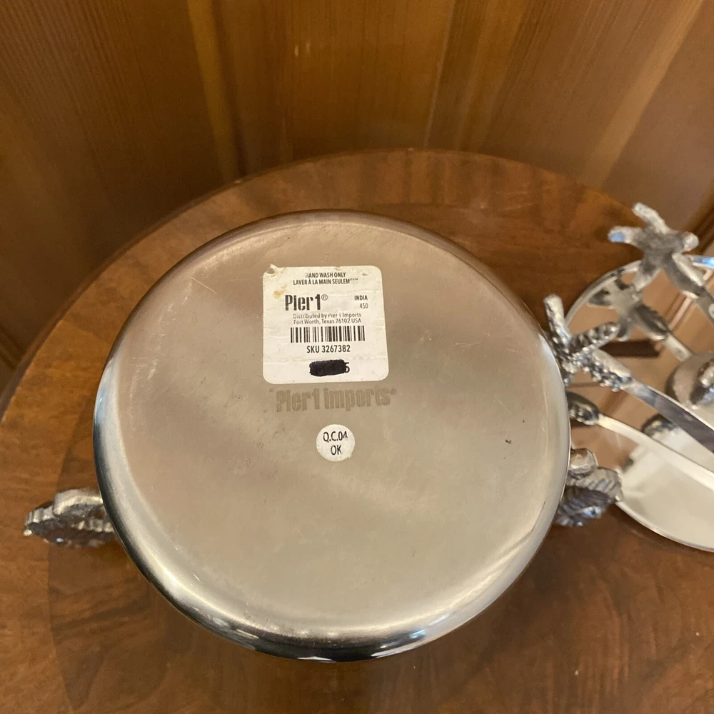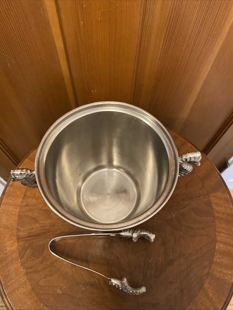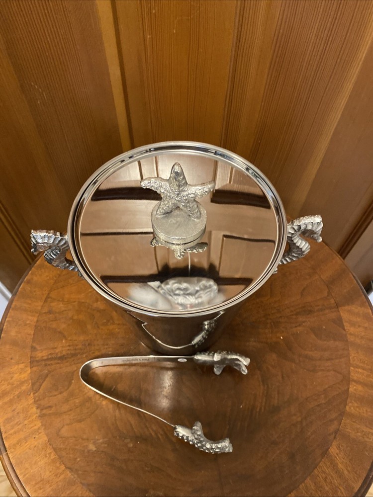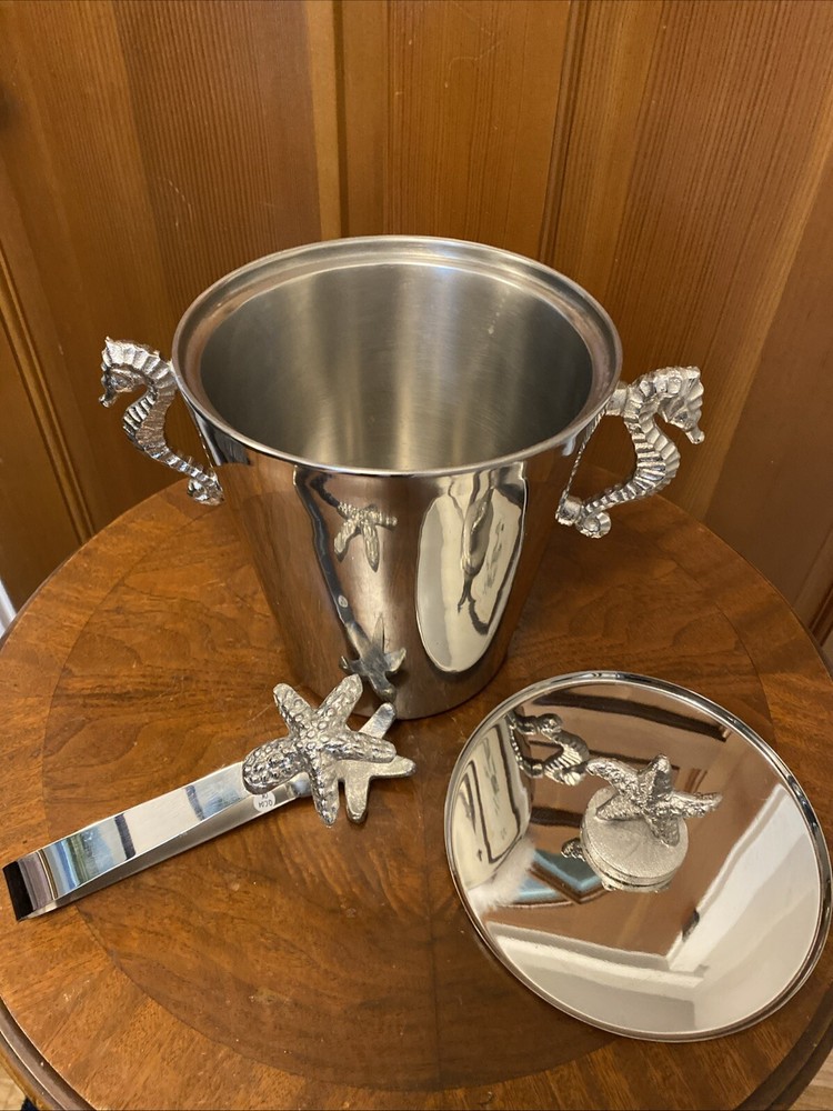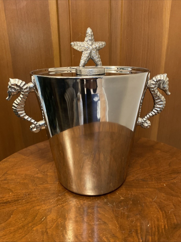 Add a touch of coastal entertaining to your bar with this silver PIER 1 IMPORTS stainless steel ice bucket starfish lid and tongs. The set includes three items and features a nautical pattern with a seahorse starfish model. The bucket lid tongs are perfect for keeping your drinks chilled while also adding a stylish touch to your bar décor. Crafted from lightweight, assembled, and multifunctional stainless steel, this ice bucket is tarnish-free and comes with a handle for easy use. Whether you're hosting a party or just enjoying a drink at home, this ice bucket is a must-have accessory for any bar.