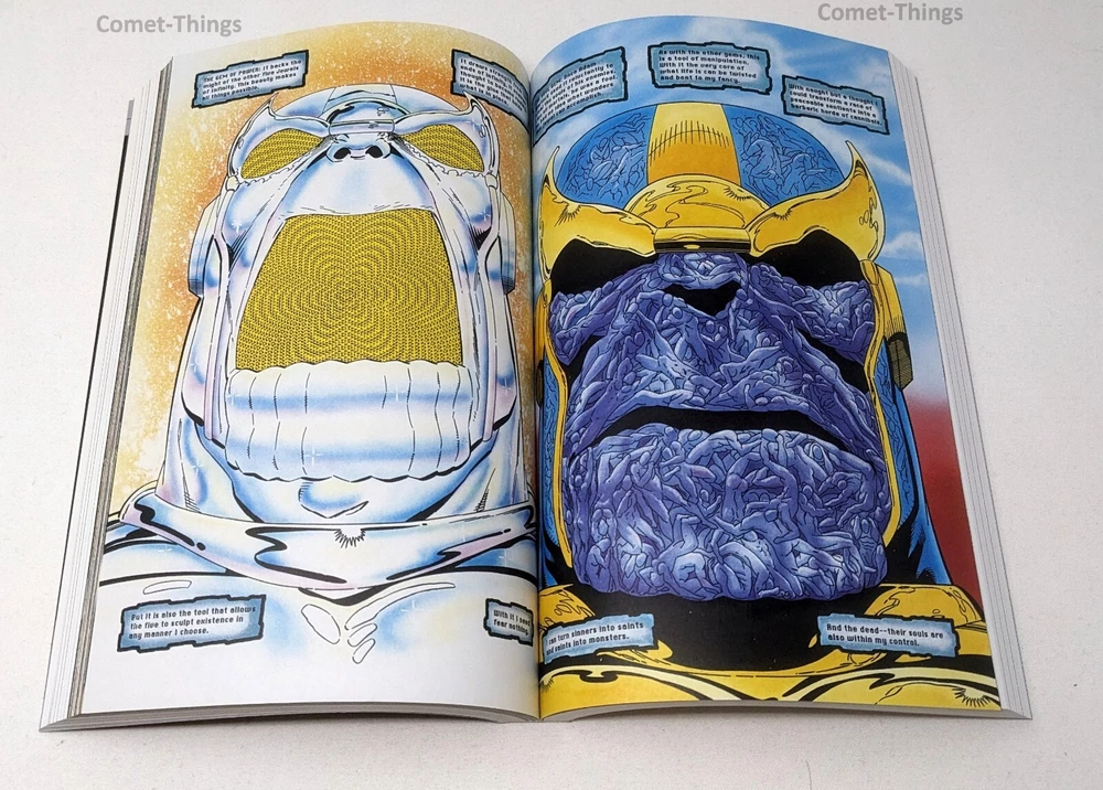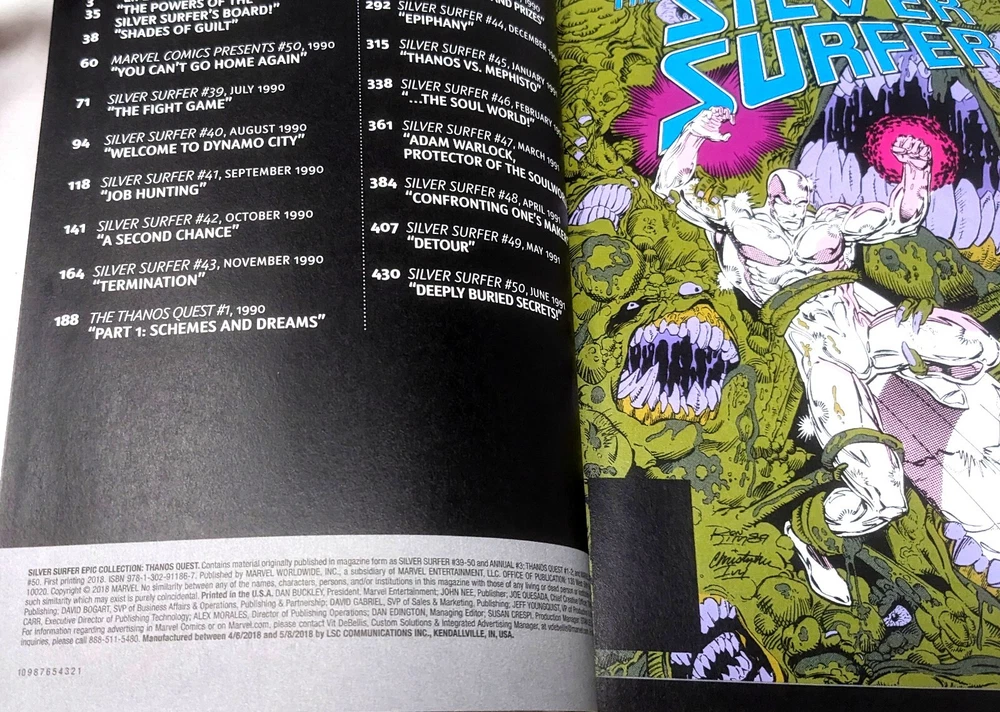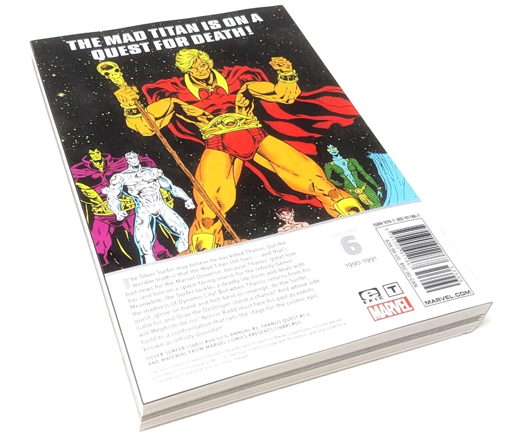 THANOS QUEST SILVER SURFER EPIC COLLECTION by Authors : Alan Grant/Jim Starlin Illustrator: Jim Sherman Cover Art: Ron Lim Collects Silver Surfer (1987) #39-50, Annual #3; Thanos Quest #1-2 and material from Marvel Comics Presents (1988) #50. T he Mad Titan is on a quest for Death! The Silver Surfer may believe he has killed Thanos, but the terrible truth is that the Mad Titan still lives - and that's bad news for the Marvel Universe, because Thanos' great love has sent him on a space-faring search for the Infinity Gems! Meanwhile, the Surfer tackles a deadly life-form and deals with the madness of Dynamo City! But when Thanos returns from his quest, glove on hand and hell-bent for revenge, do the Surfer, Galactus and Drax the Destroyer stand a chance? And whose side will Mephisto be on? Norrin Radd must face his past as events build to a confrontation that sets the stage for the cosmic epic known as INFINITY GAUNTLET ! About Us We are a small business active on EBAY from the early days (since 2000 .... Yup, we are old !). We have come this far by providing exceptional service, top quality GENUINE merchandise. Please take a look at our feedback to see what other delighted customers have to say about us. Buy with confidence ! We assume every book is a gift. So, we do not, by default, include receipts with the items. Shipping - Shipping will be flatrate media mail, to 48 continental US states only. Other states may require extra surcharge. - Books will be shipped securely, packed in a cardboard enclosure. - We upload tracking as soon as items are shipped out. We are not responsible for missing packages after they are indicated as "Delivered" in the Ebay tracking system. - Books are shipped via Media Mail and the delivery date is an estimated one. Actual delivery time may exceed 10 to 15 days in rare cases. Returns - All returns accepted within 30 days for a full refund. - Returned items must be in the same condition that they were listed.