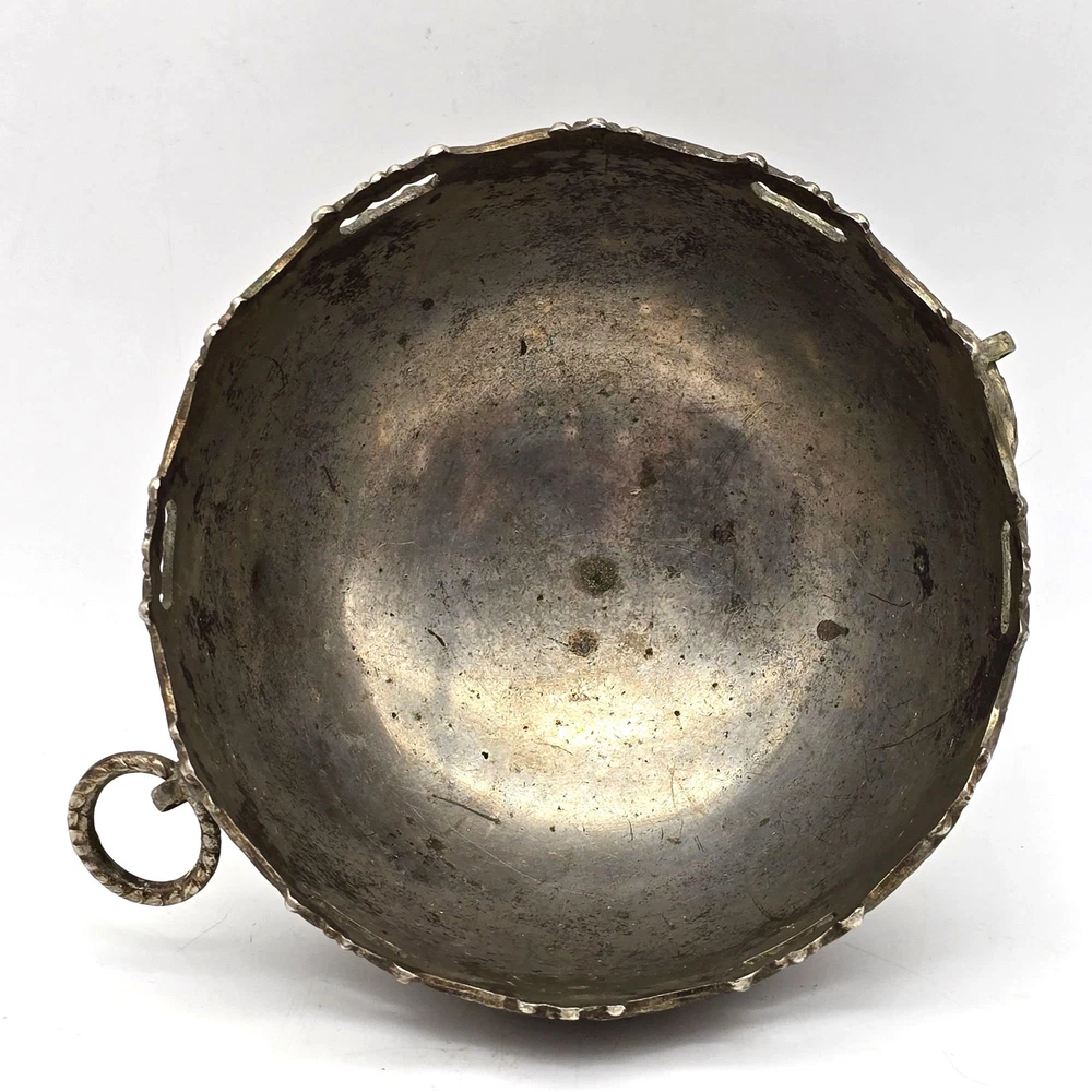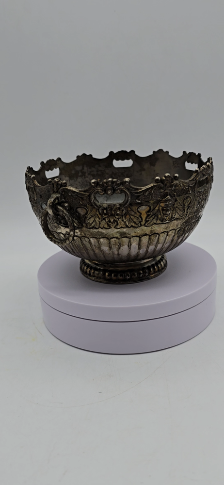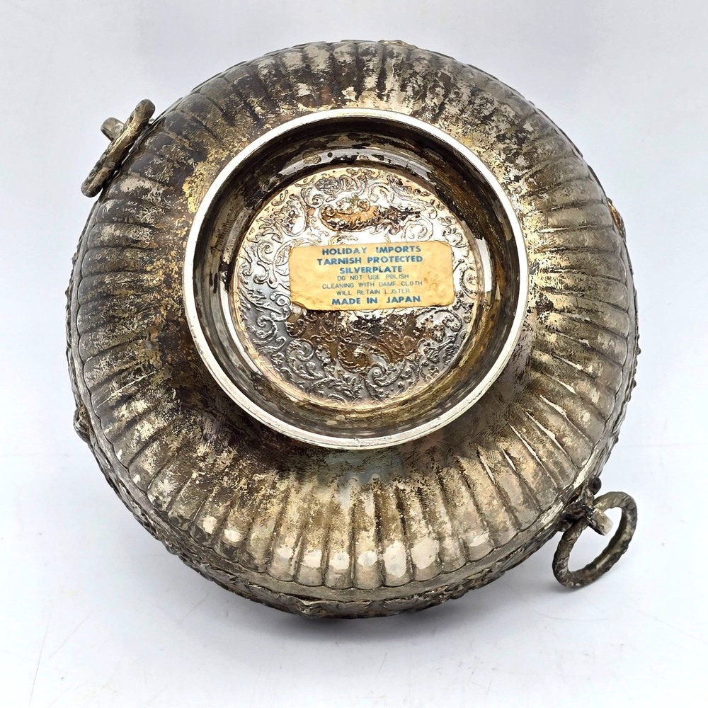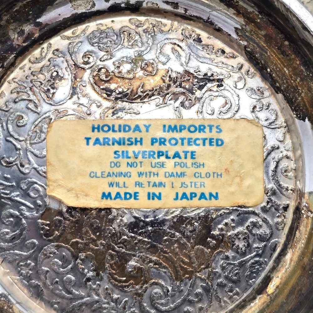 This silverplate bowl showcases intricate detailing with ornate floral designs and side handles, making it a timeless decorative piece for display or use. Silver Plated Bowl/Pedestal Candy Dish approx. 5 x 3" Holiday Imports Japan 1lb 5oz • Tarnish-protected silverplate finish • Made in Japan by Holiday Imports • Sturdy side handles for easy handling • Elegant scalloped edges with floral embellishments • Measures approximately 5" diameter, 3" height Visible tarnish and light scratches throughout, consistent with age. Bottom label intact. Diameter = 5 inches, Height = 3 inches.