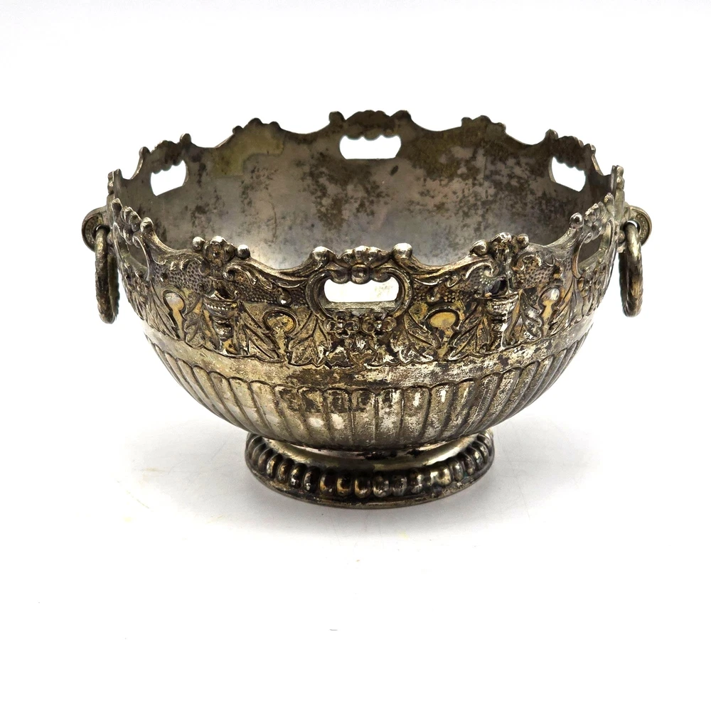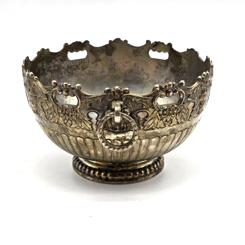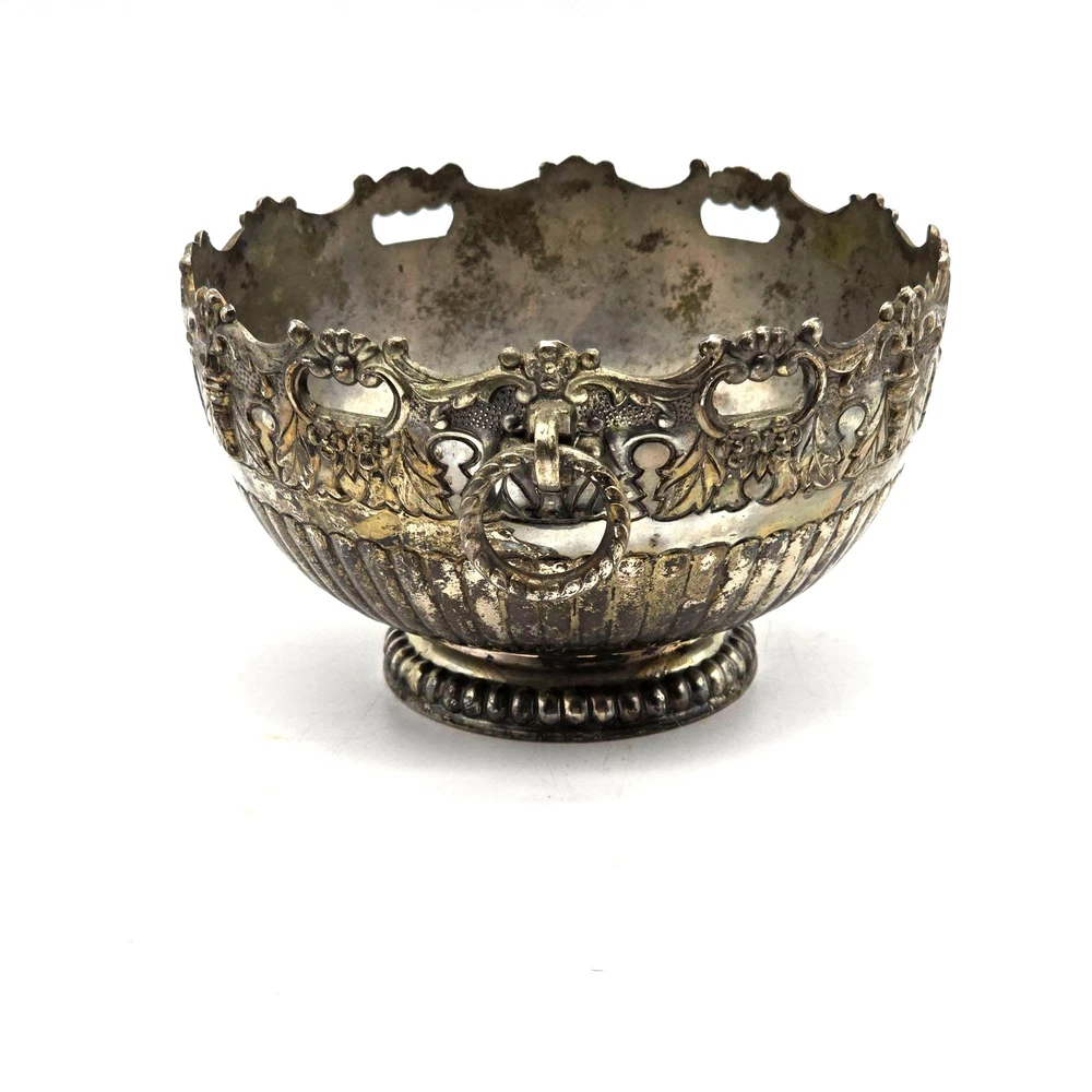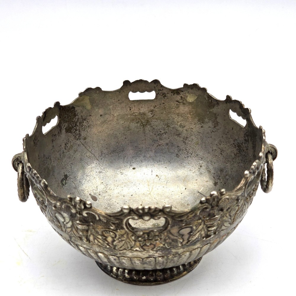 This silverplate bowl showcases intricate detailing with ornate floral designs and side handles, making it a timeless decorative piece for display or use. Silver Plated Bowl/Pedestal Candy Dish approx. 5 x 3" Holiday Imports Japan 1lb 5oz • Tarnish-protected silverplate finish • Made in Japan by Holiday Imports • Sturdy side handles for easy handling • Elegant scalloped edges with floral embellishments • Measures approximately 5" diameter, 3" height Visible tarnish and light scratches throughout, consistent with age. Bottom label intact. Diameter = 5 inches, Height = 3 inches.